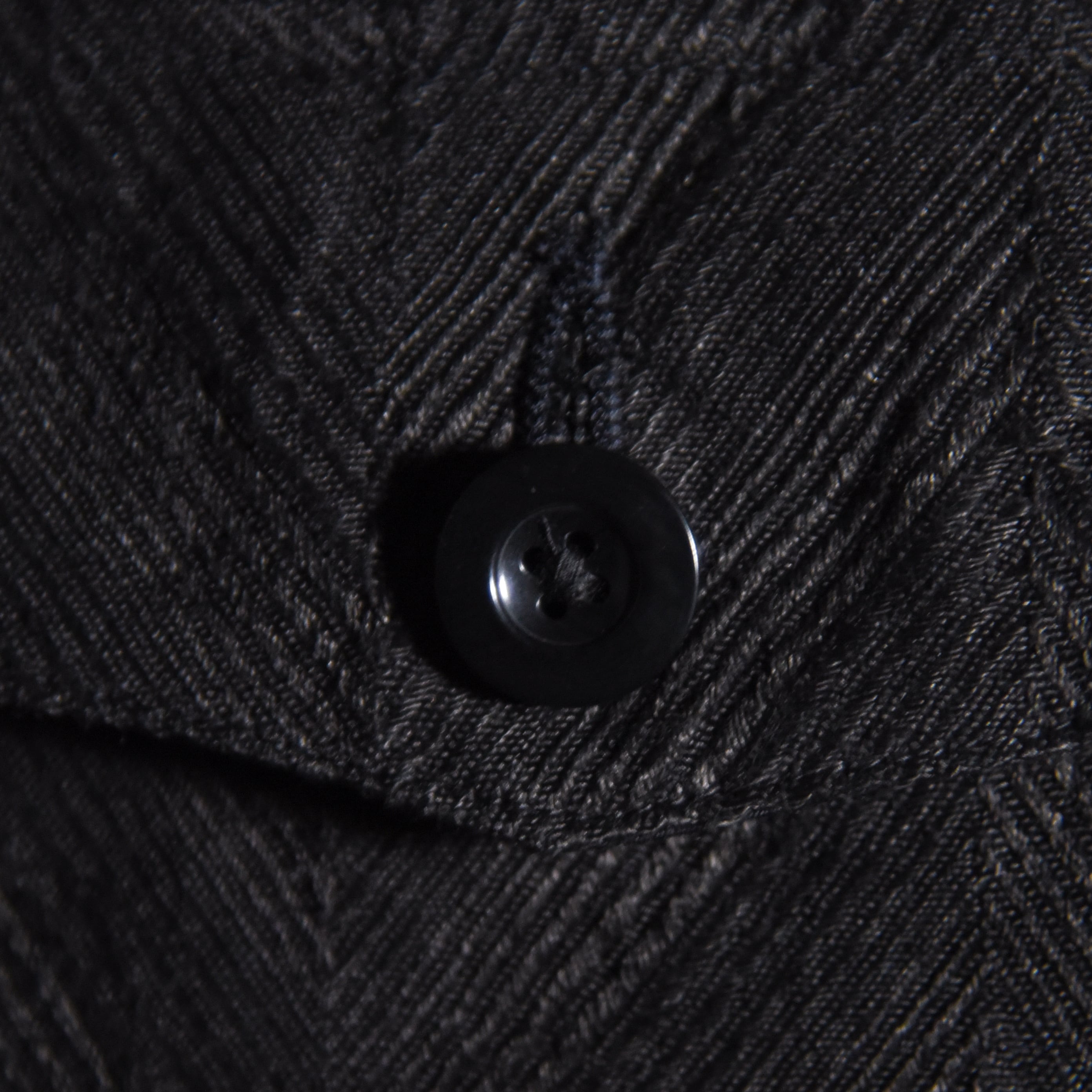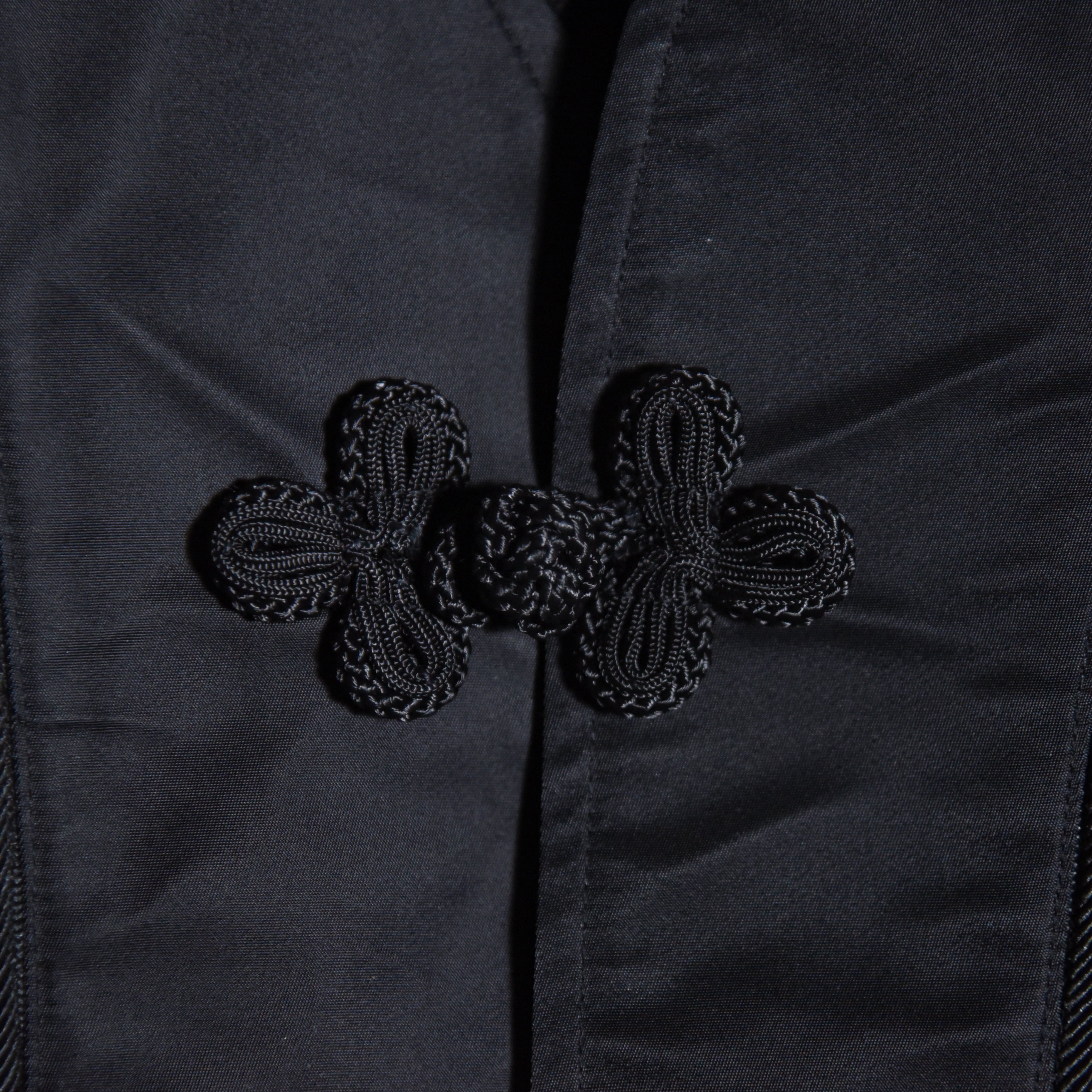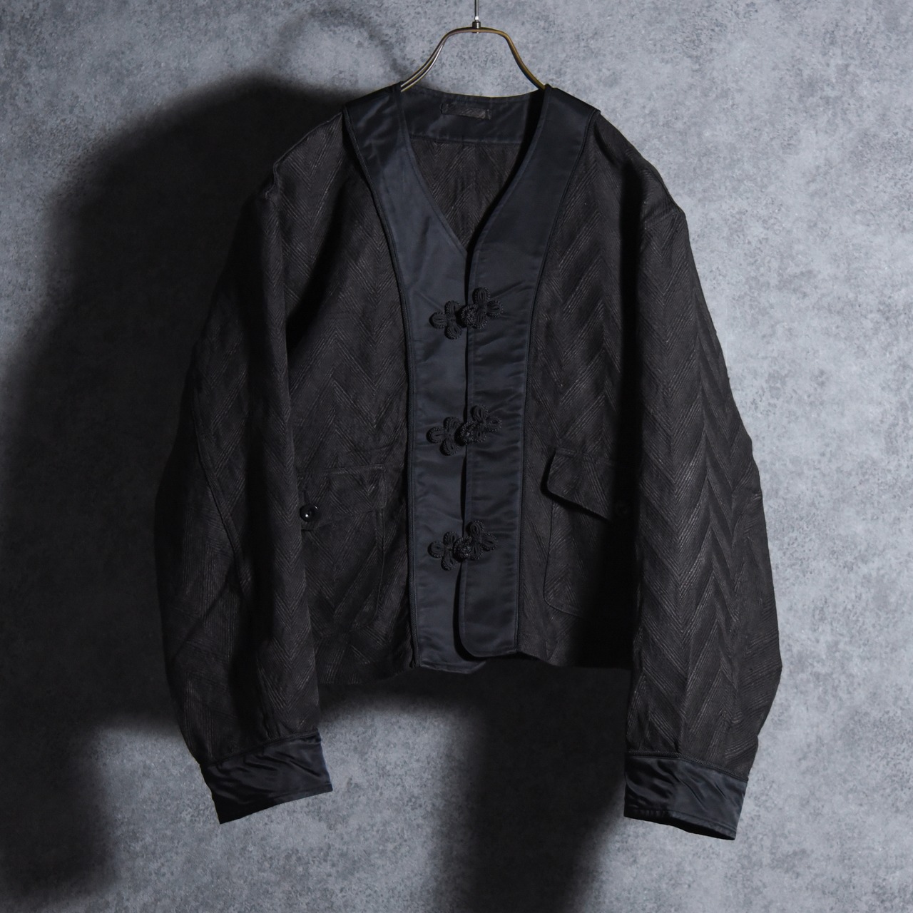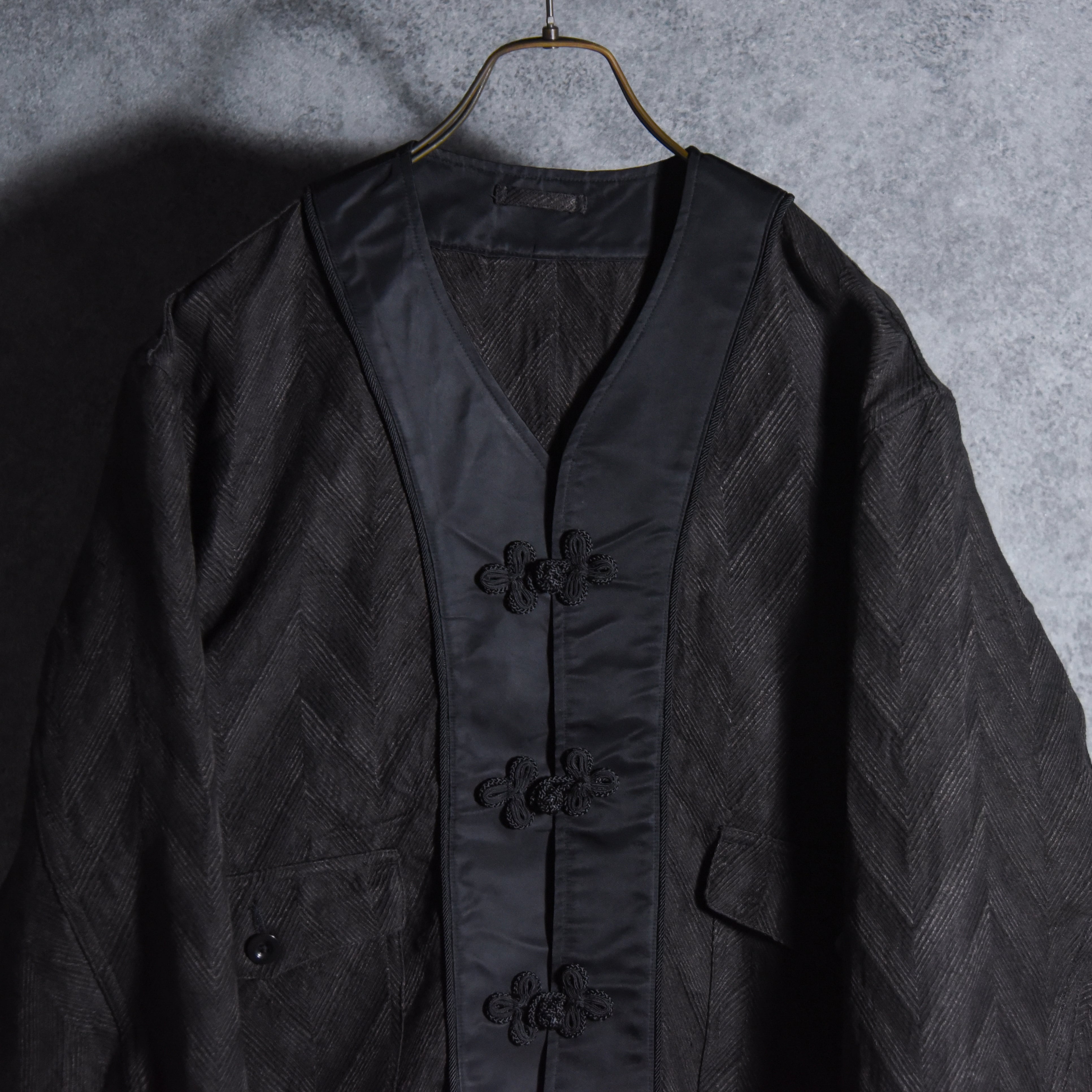 前立てと袖口は光沢感のあるサテンと上品なコードパイピングで切り替えられ、留め具はボタンではなく華美な飾りトグル、ポケットフラップには天然のナットボタンが付くなど、生地の存在感に負けない装飾が施されています。