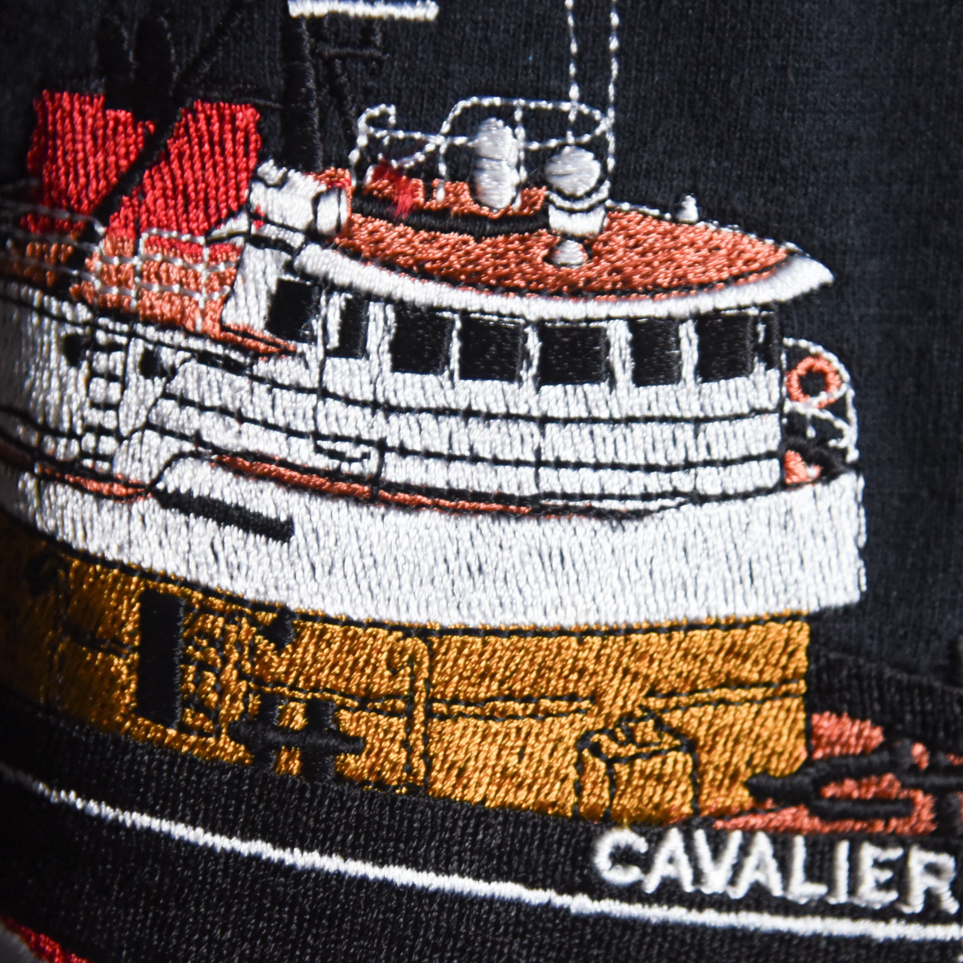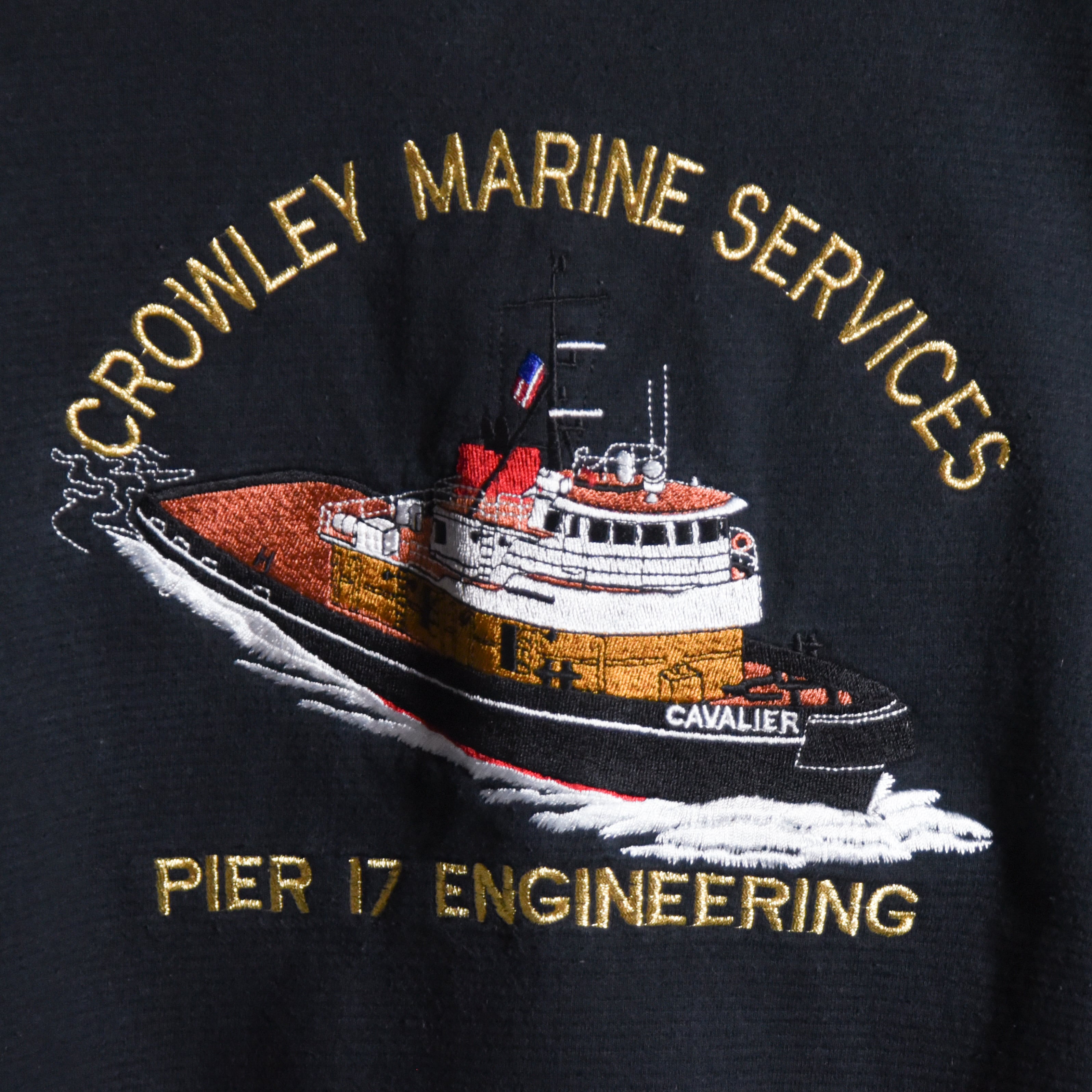 フロントにはアメリカで100年以上の歴史を誇る老舗の海運、物流企業であるクロウリー社の運搬船を、贅沢に総刺繍で描いた手の込んだ仕様で、デザインバランスや刺繍の細かさからも一目見ただけで物の良さが伝わるグッドピースです。