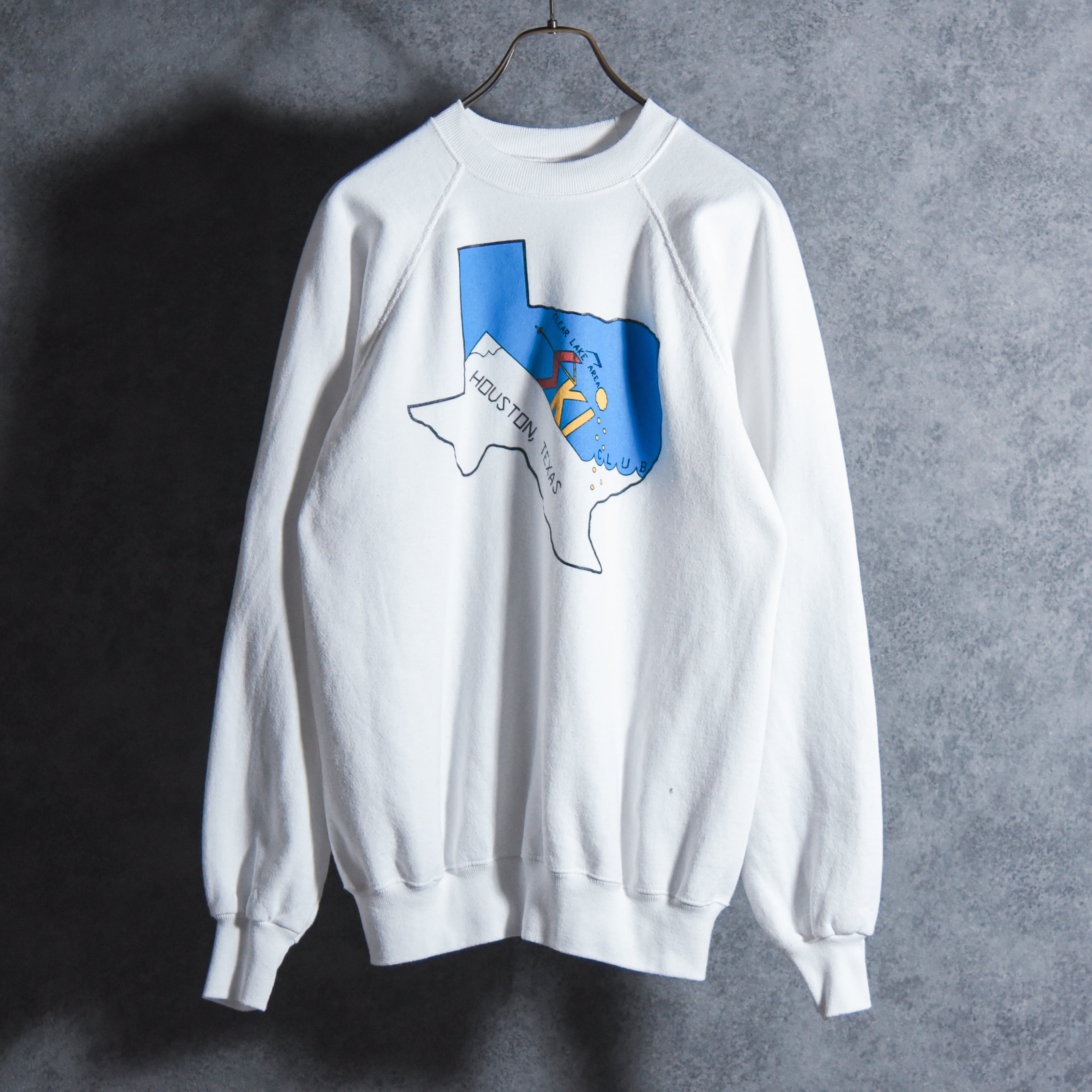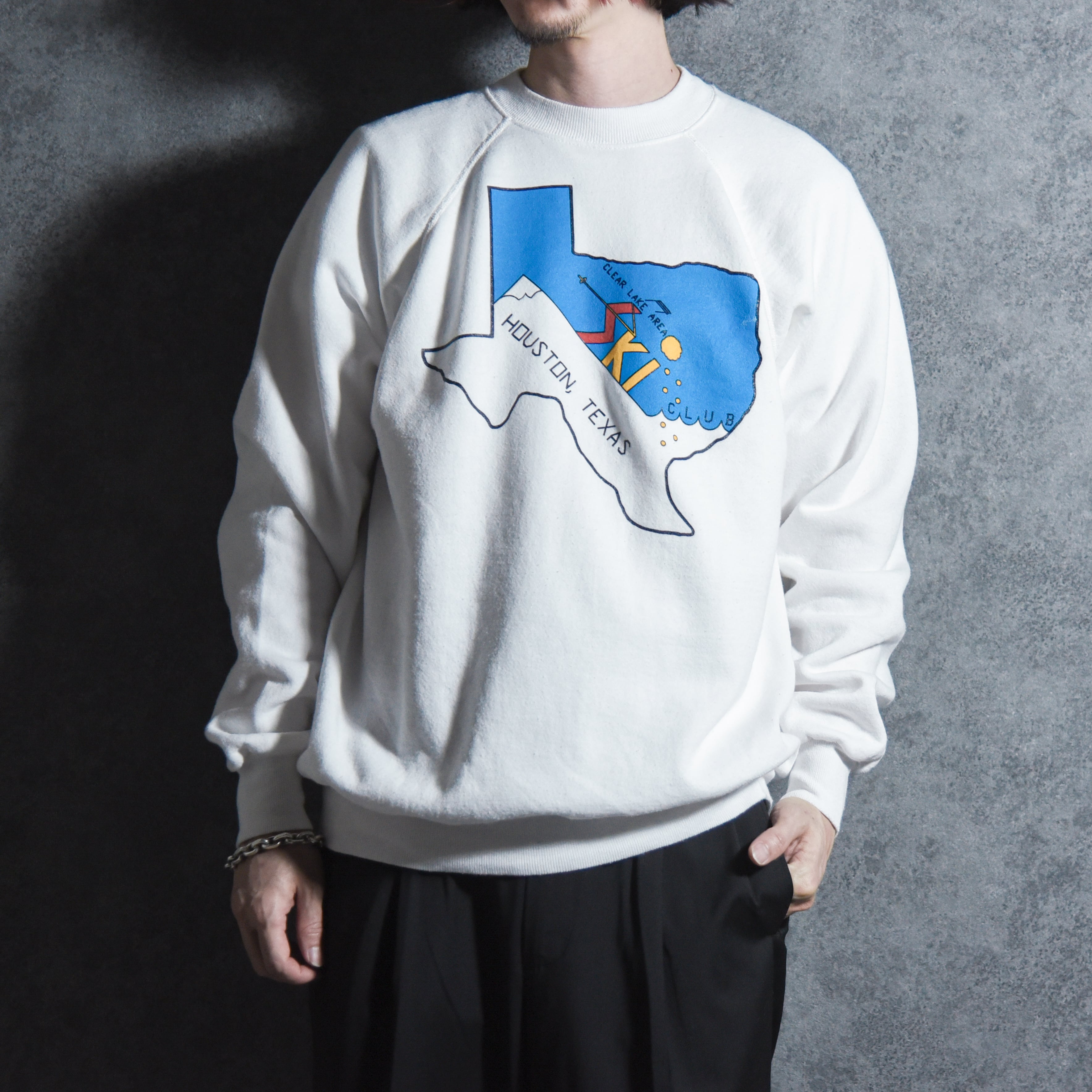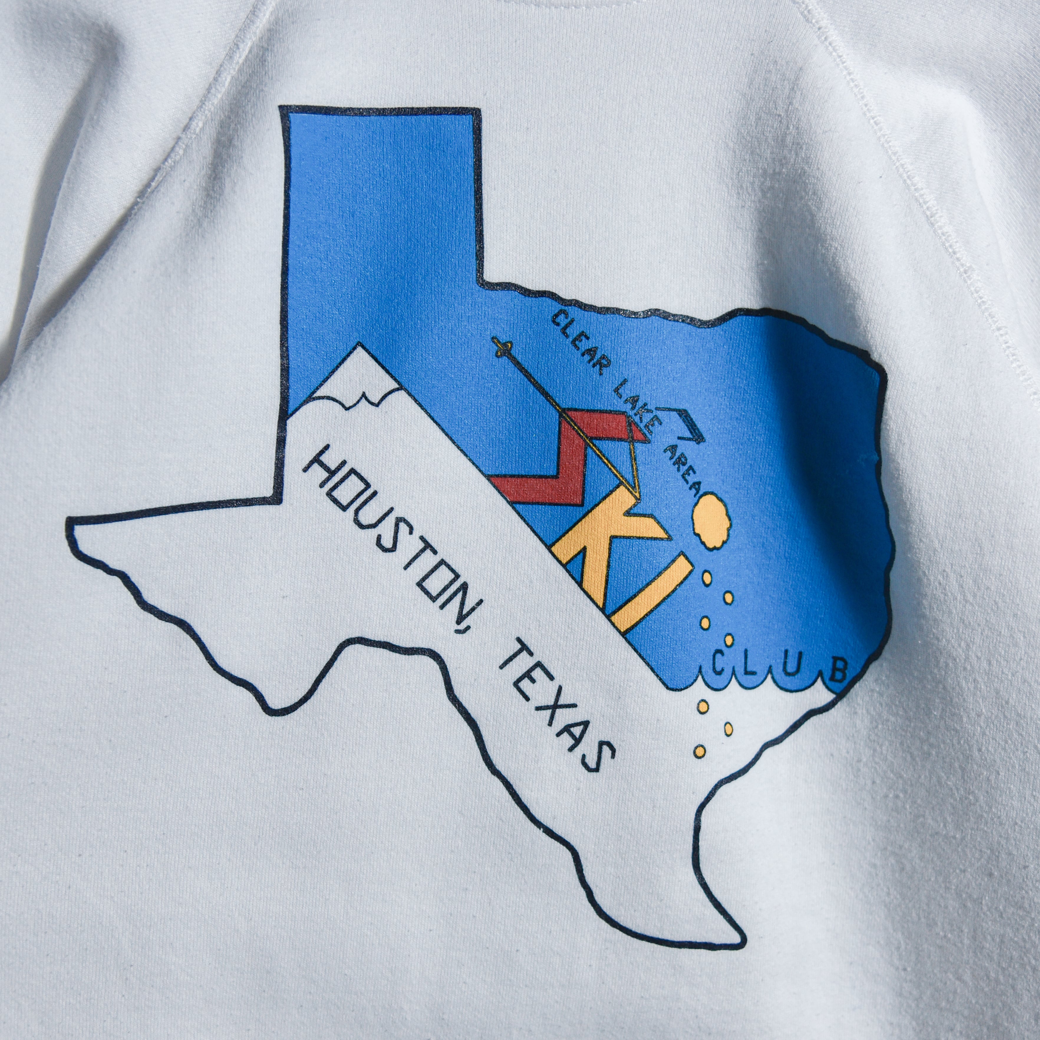 雪のような白いボディにテキサス州の輪郭の中の真っ青な空の中でSKIというロゴがスキーを楽しんでいるデザインセンスも抜群の一着。