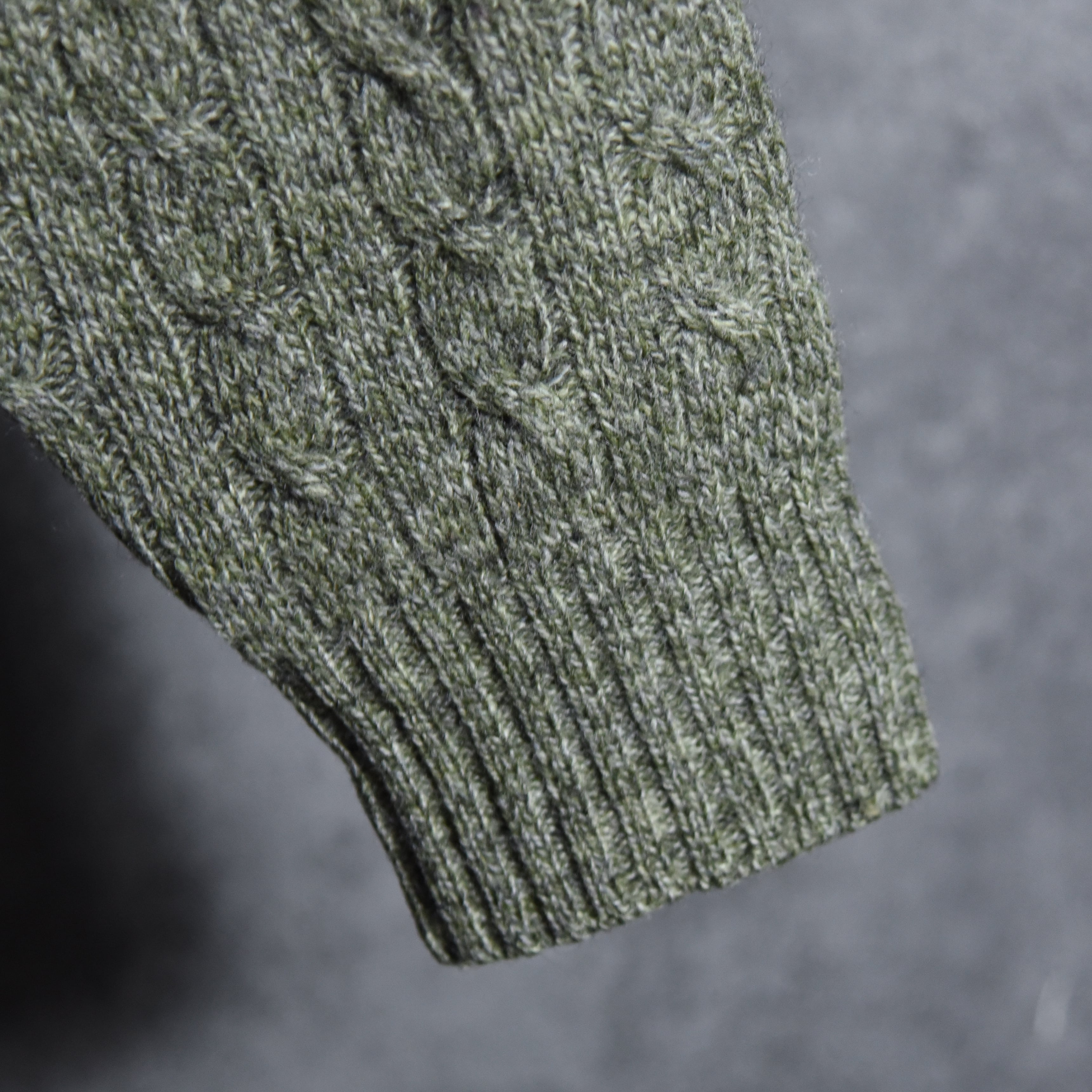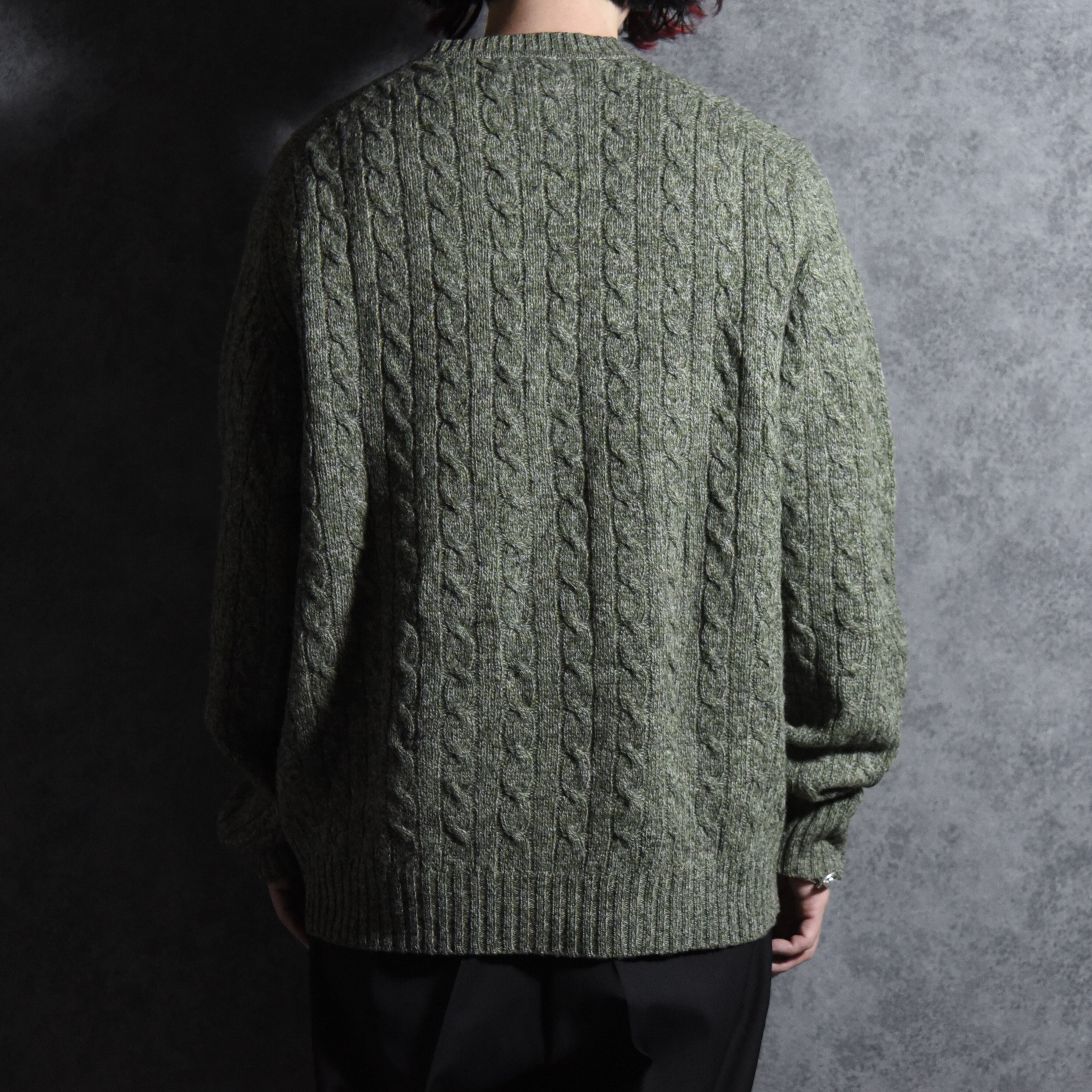 ウール100%の温かみのある素材感、シェットランドセーターらしいミドルゲージで王道の雰囲気ながらケーブル編みの意外とシャギードック系のニットには珍しいデザイン。