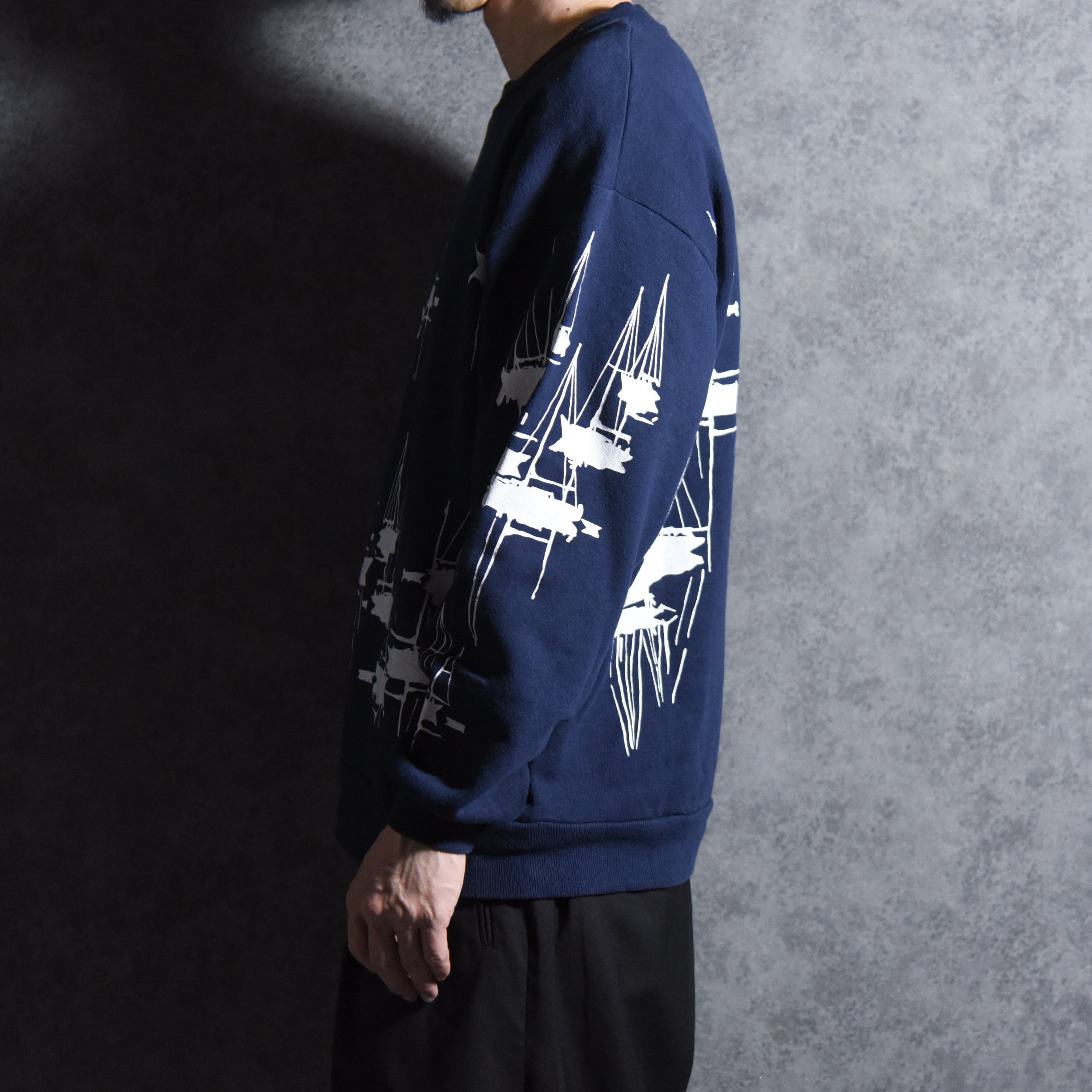 スウェットやヨットパーカーなどにマリンモチーフの総柄プリントを施したデザインが特徴で、今回入荷したのはその中でも人気テーマの一つ、まるで絵画のような抽象的なヨット柄を大胆にあしらった一着。