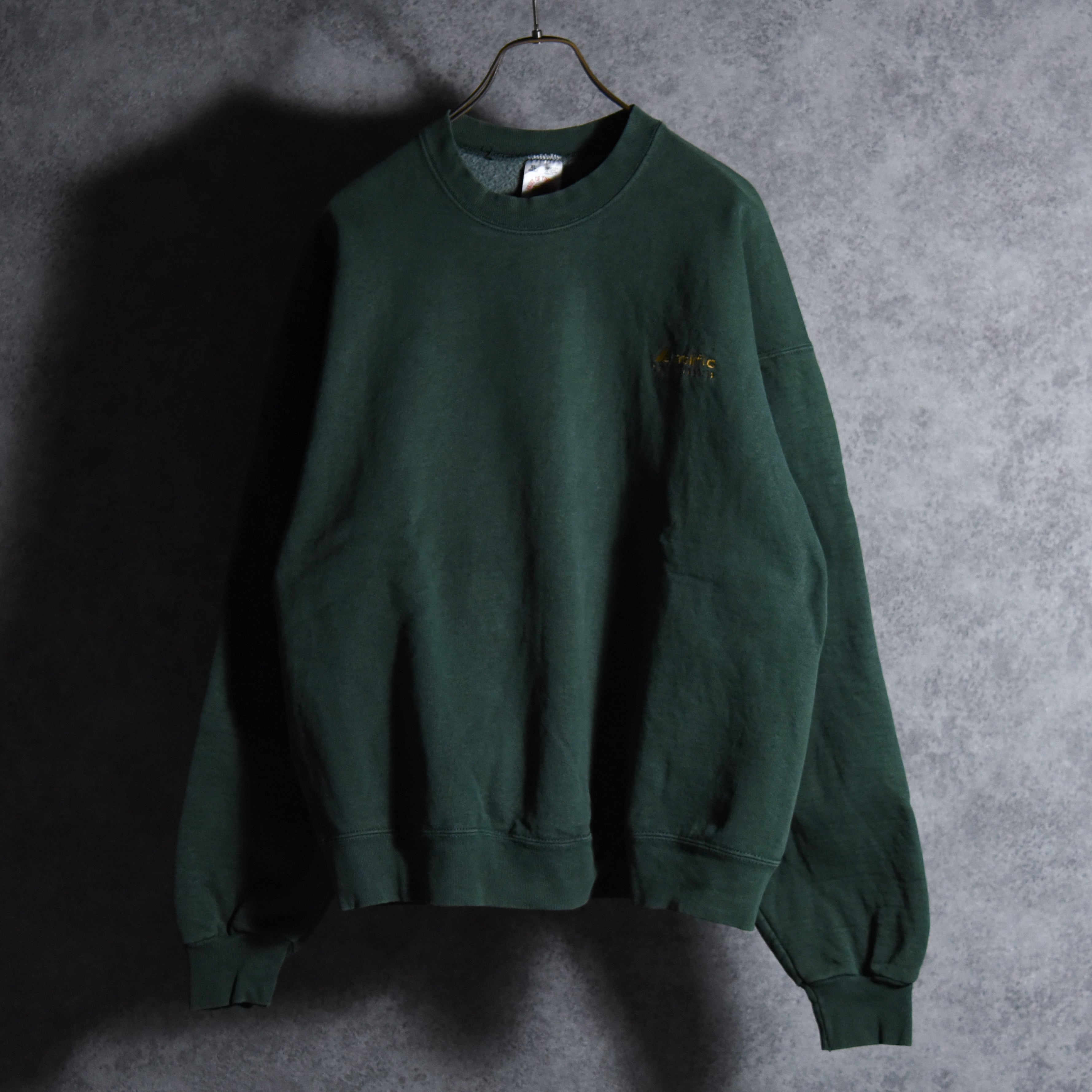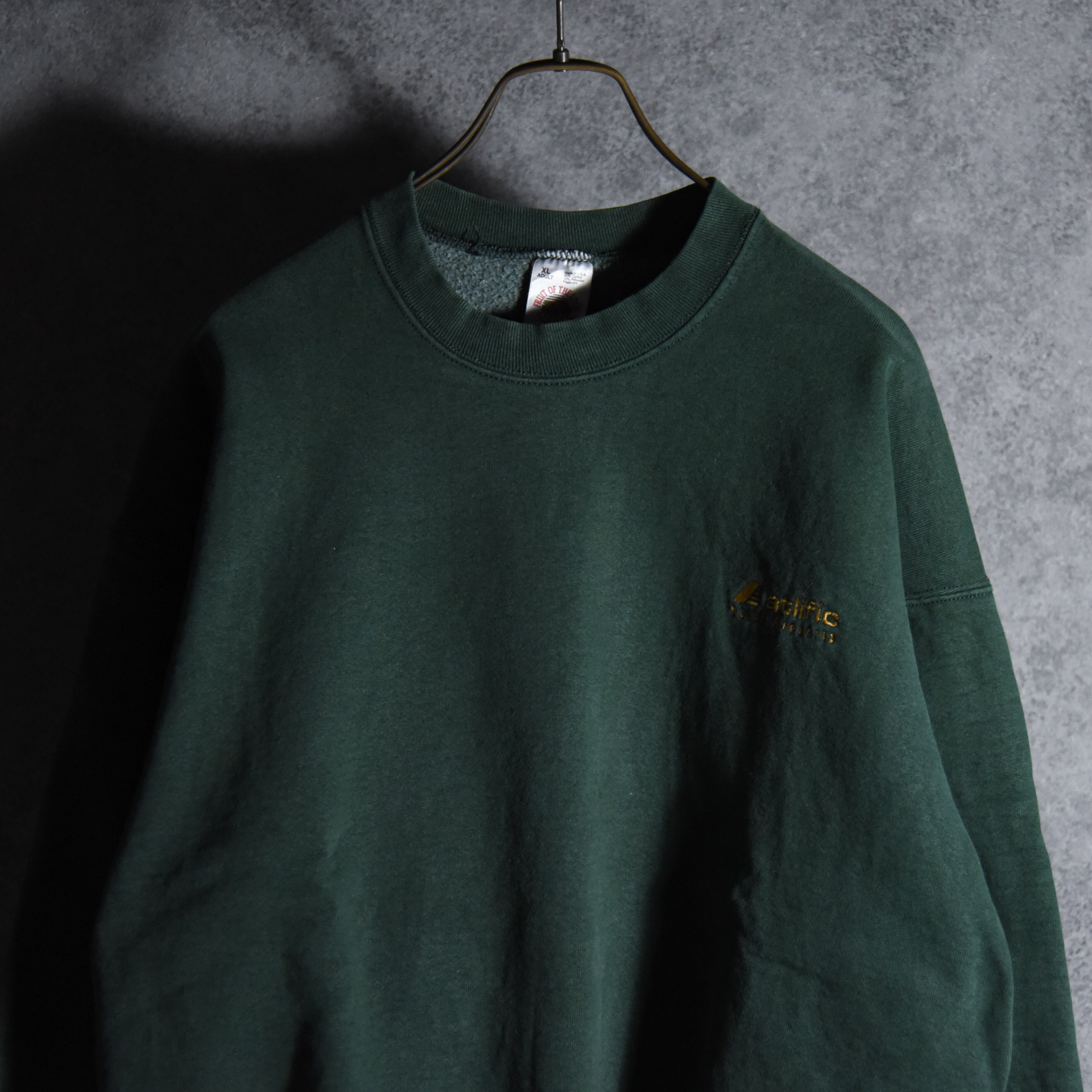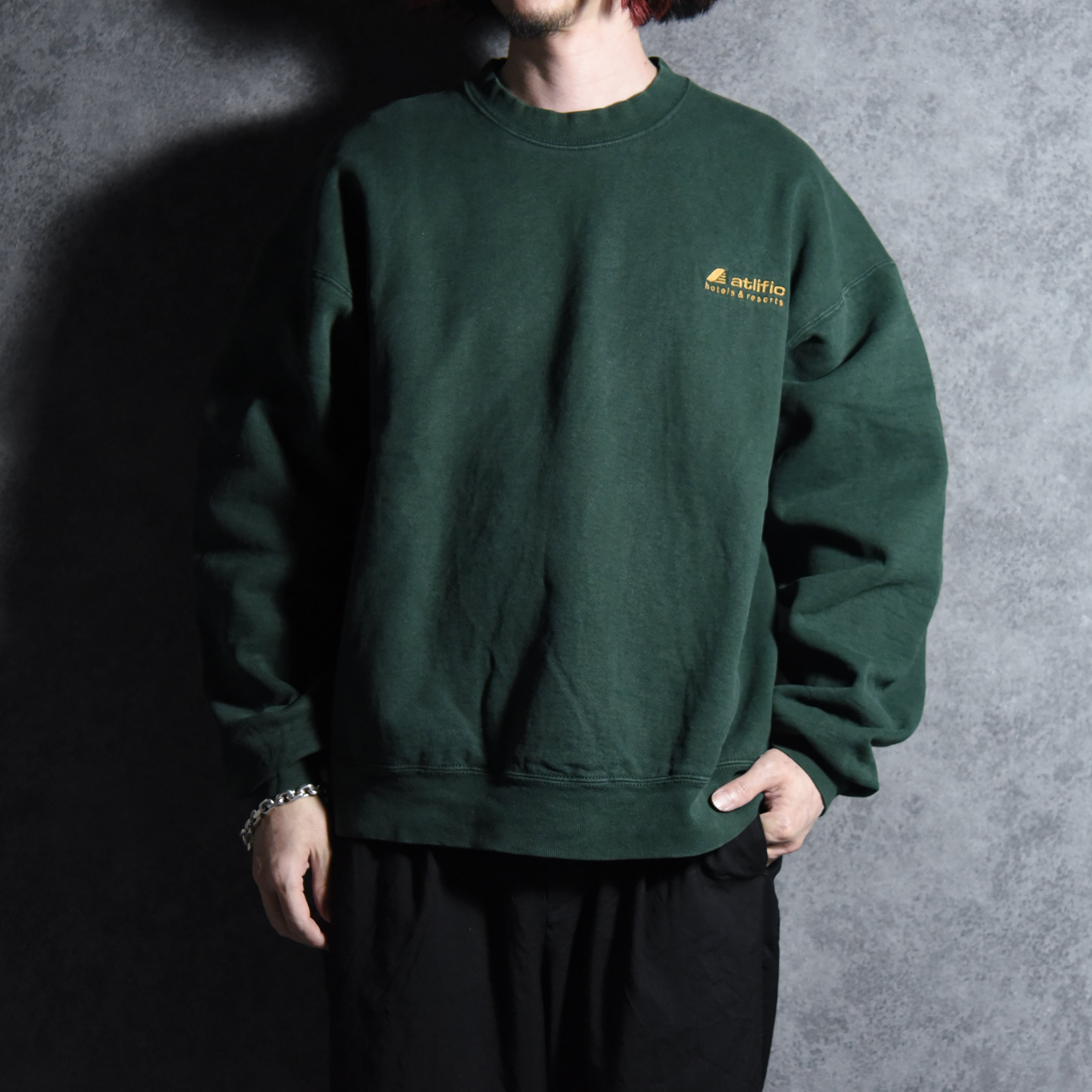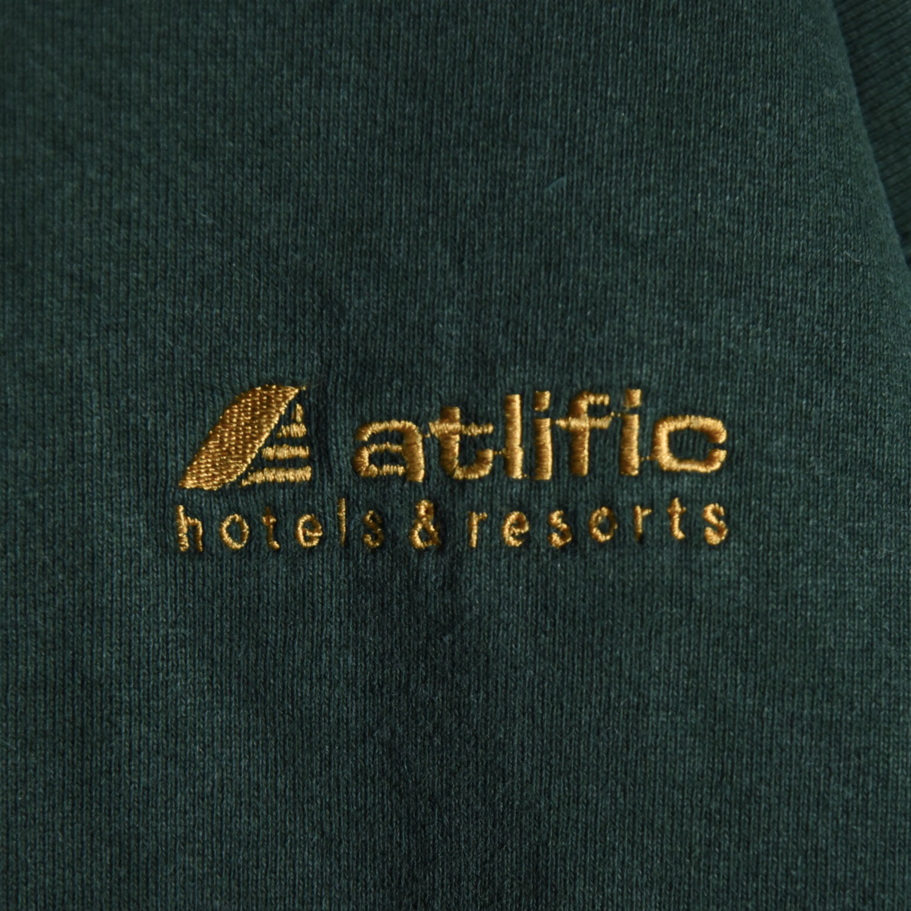 90s FRUIT OF THE LOOM Atlific hotels & resorts Advertising Crew Neck Sweat Made in USA Black フルーツオブザルーム 企業スウェット アドバタイジング クルーネック スウェット アメリカ製 ダークグリーン ホテル