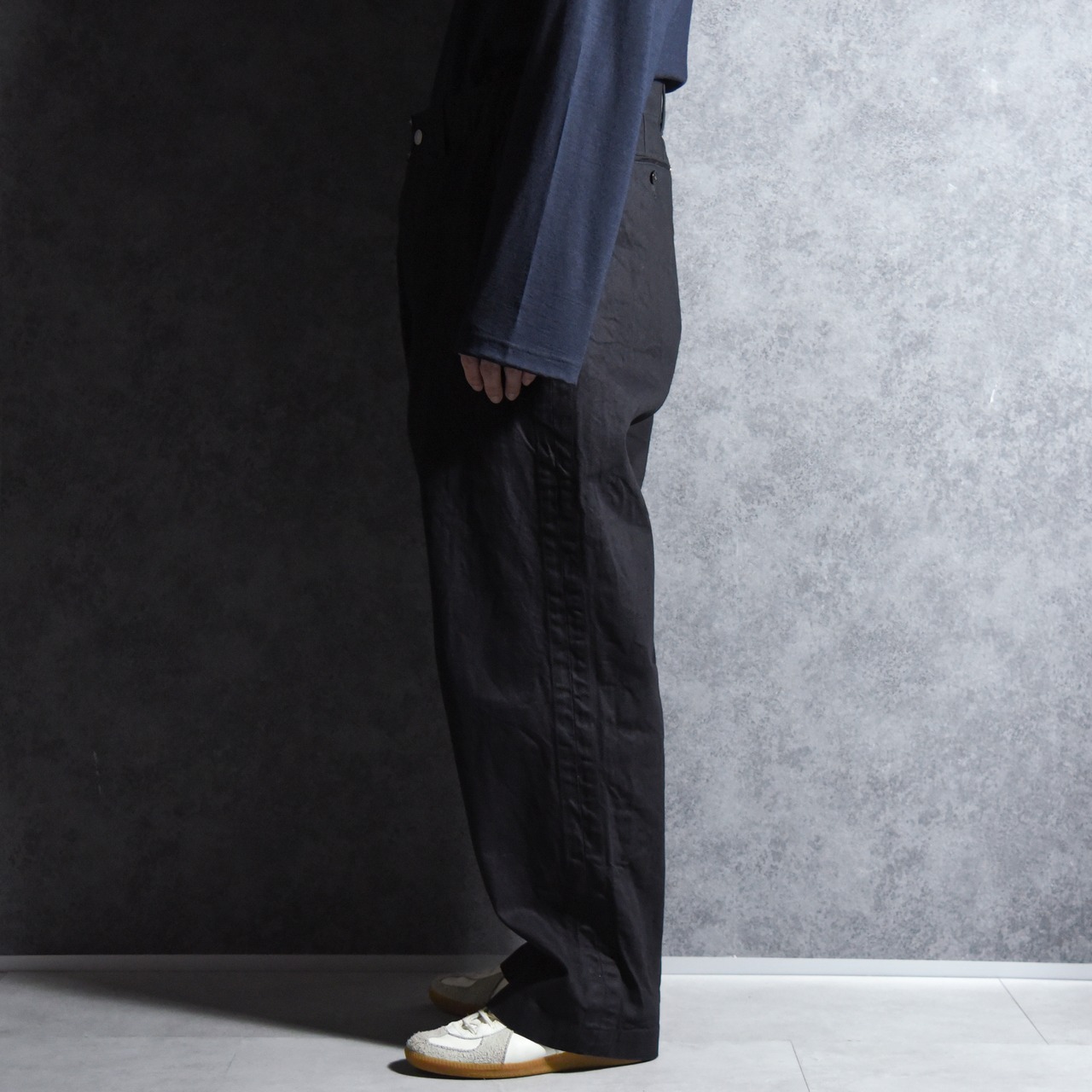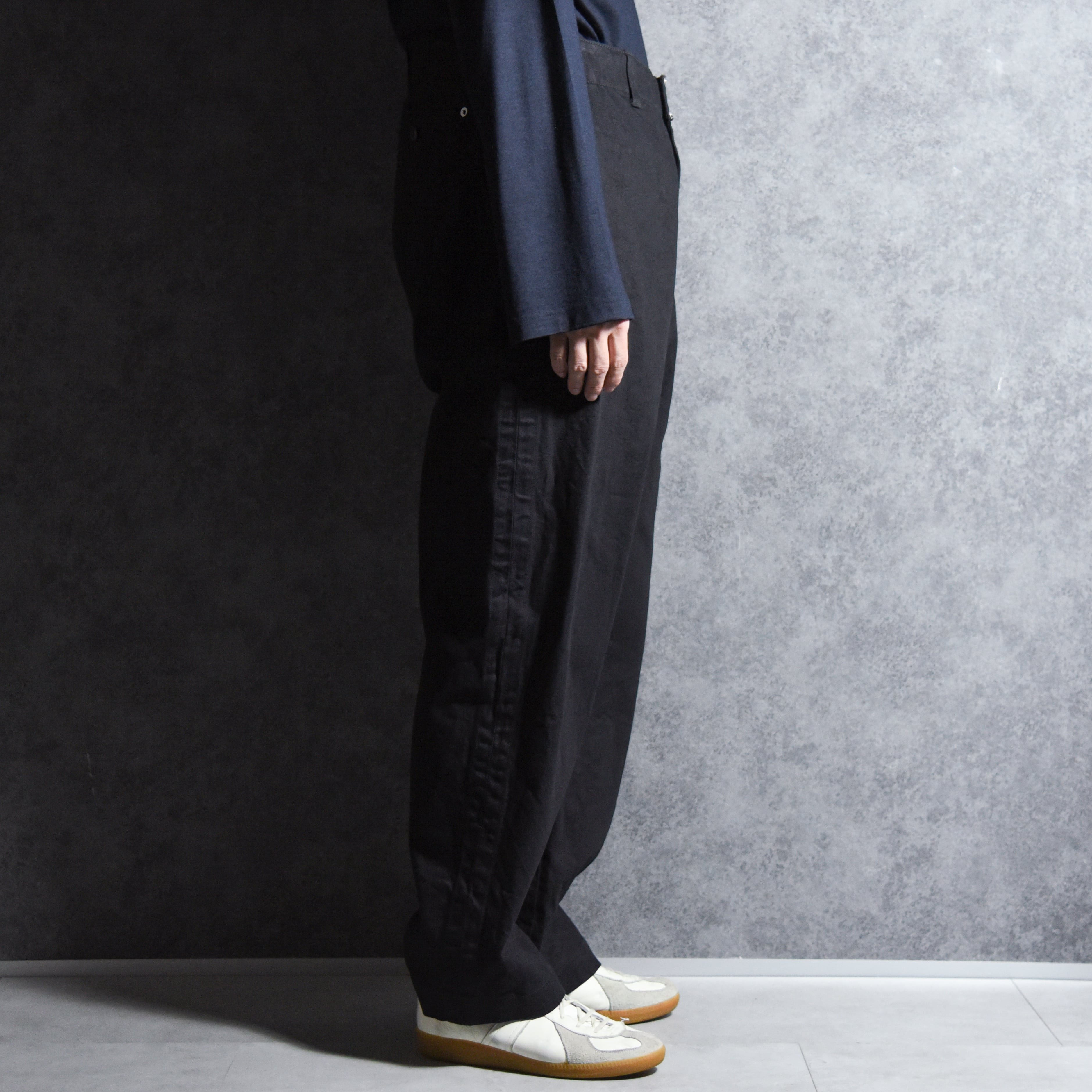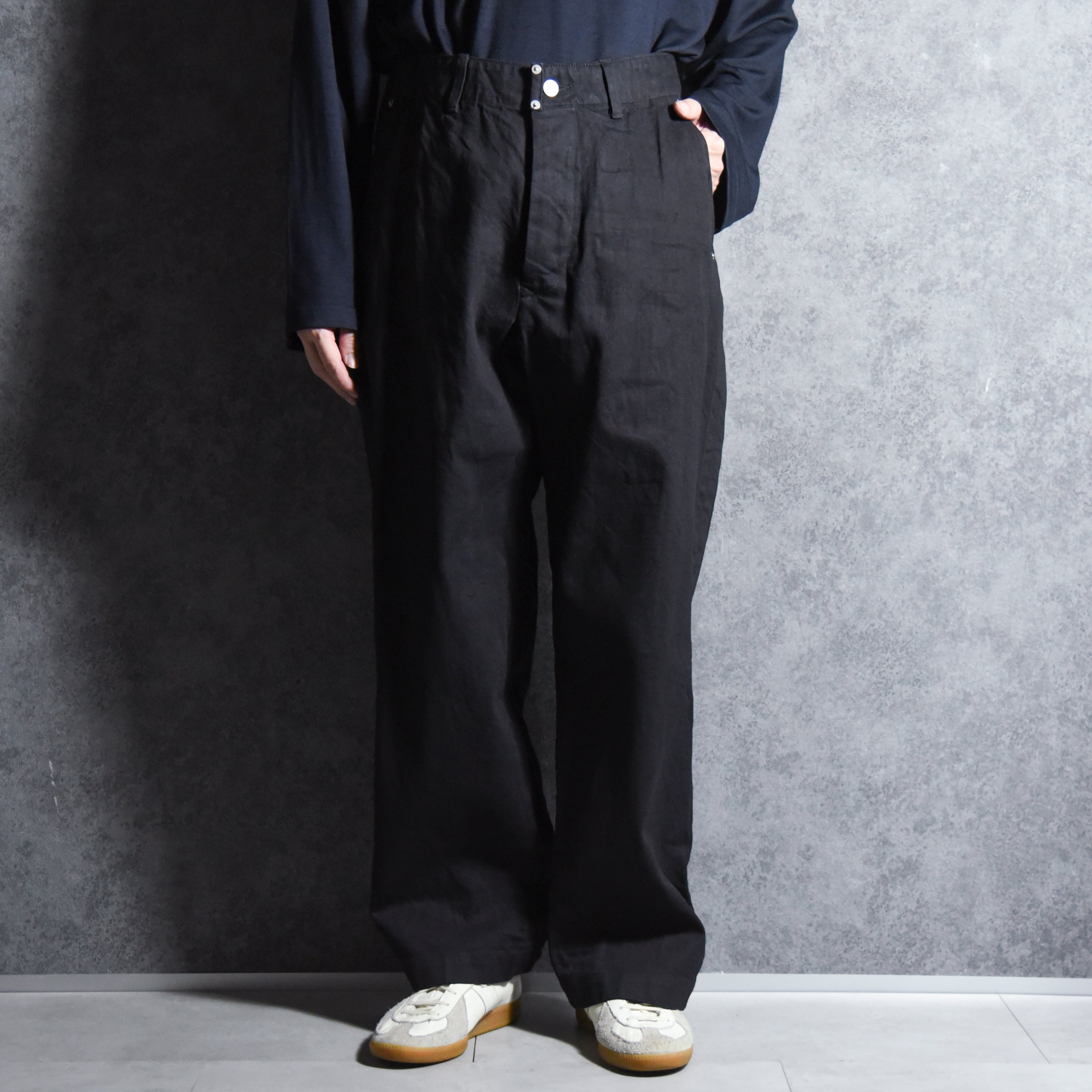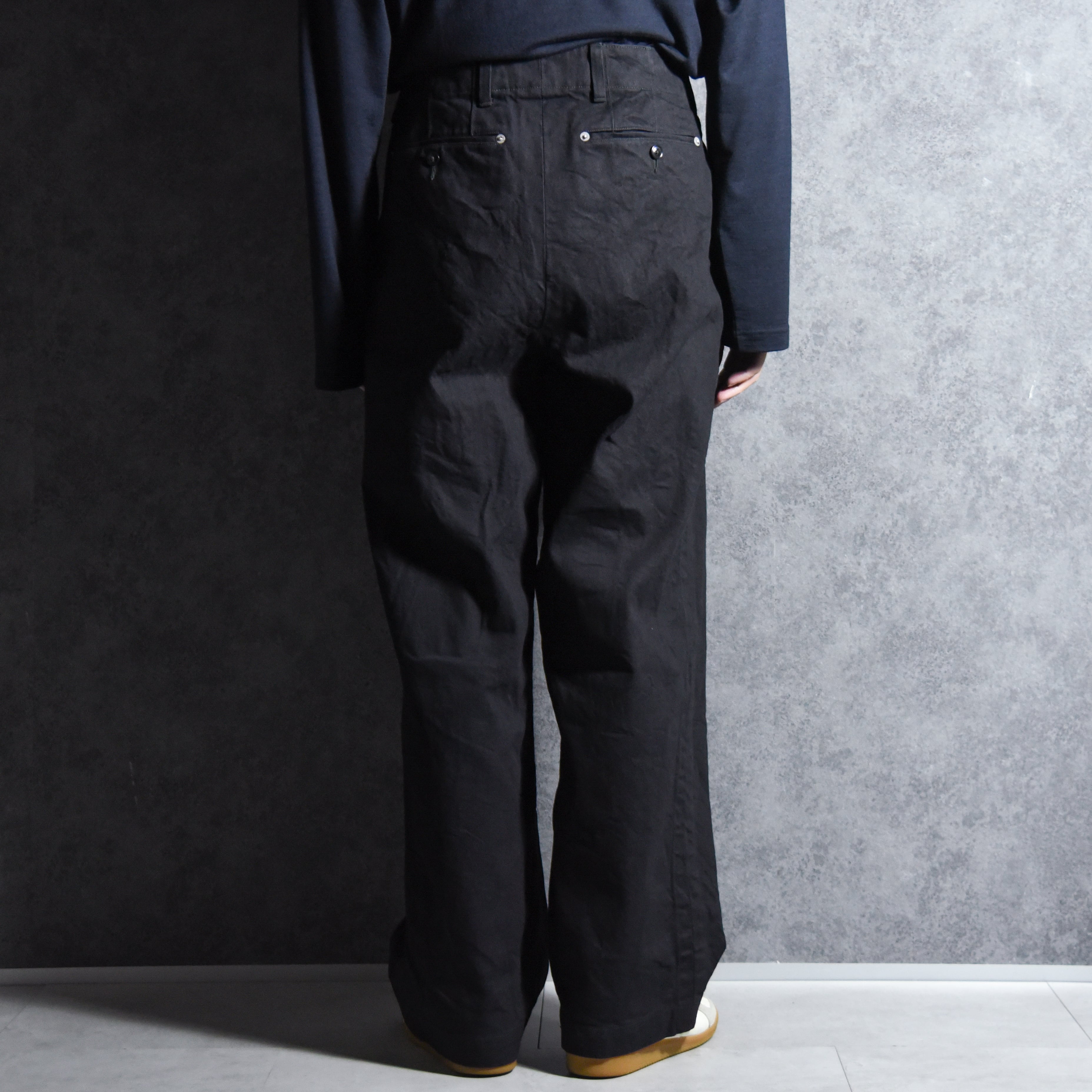 シルエットはユーロヴィンテージのフィールドパンツを基調にしており、大きく取られたゆとりの中にどこか綺麗さを感じるシルエット。