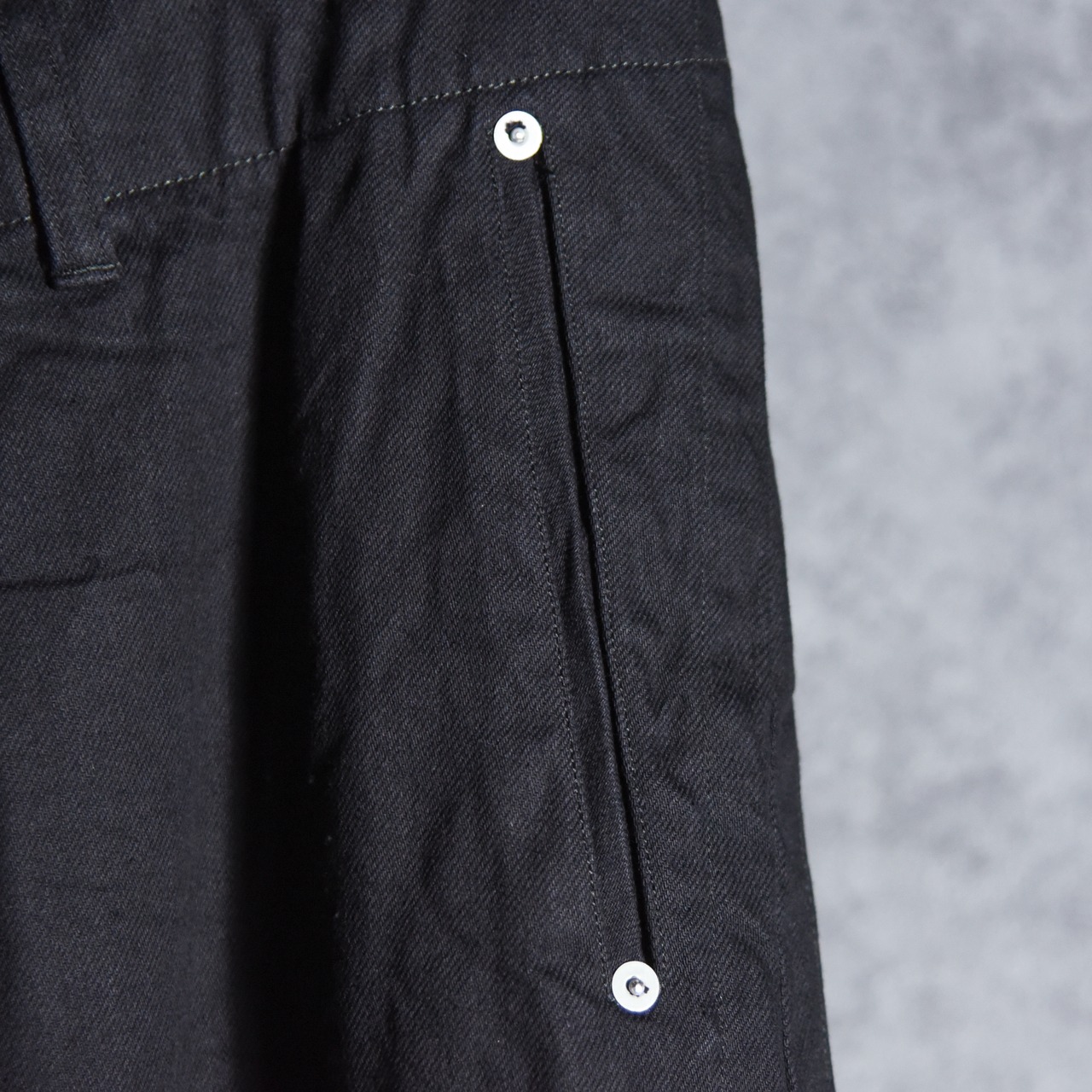 素材には経緯共にムラ感の少ない空紡糸で織り上げたデニム生地を使用。