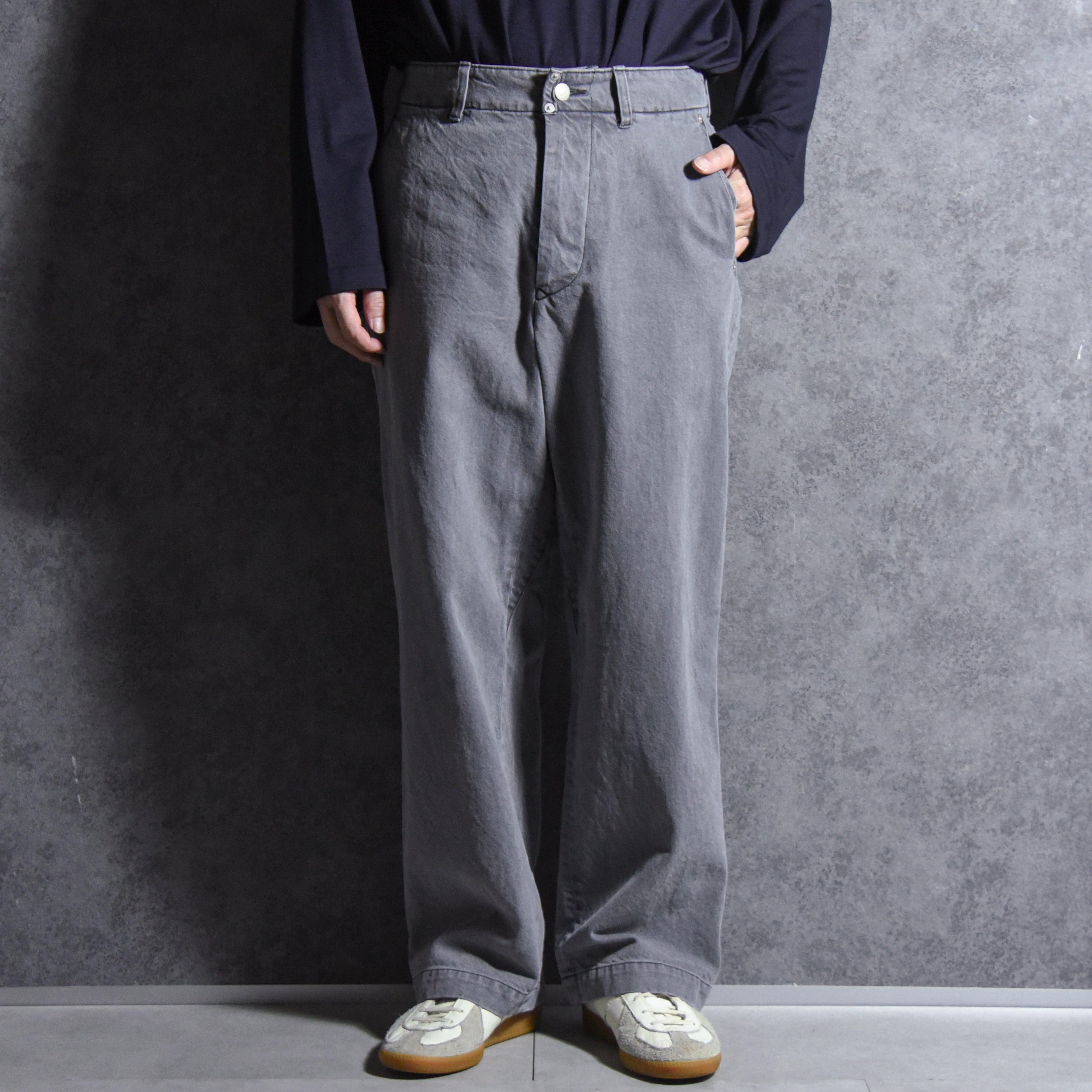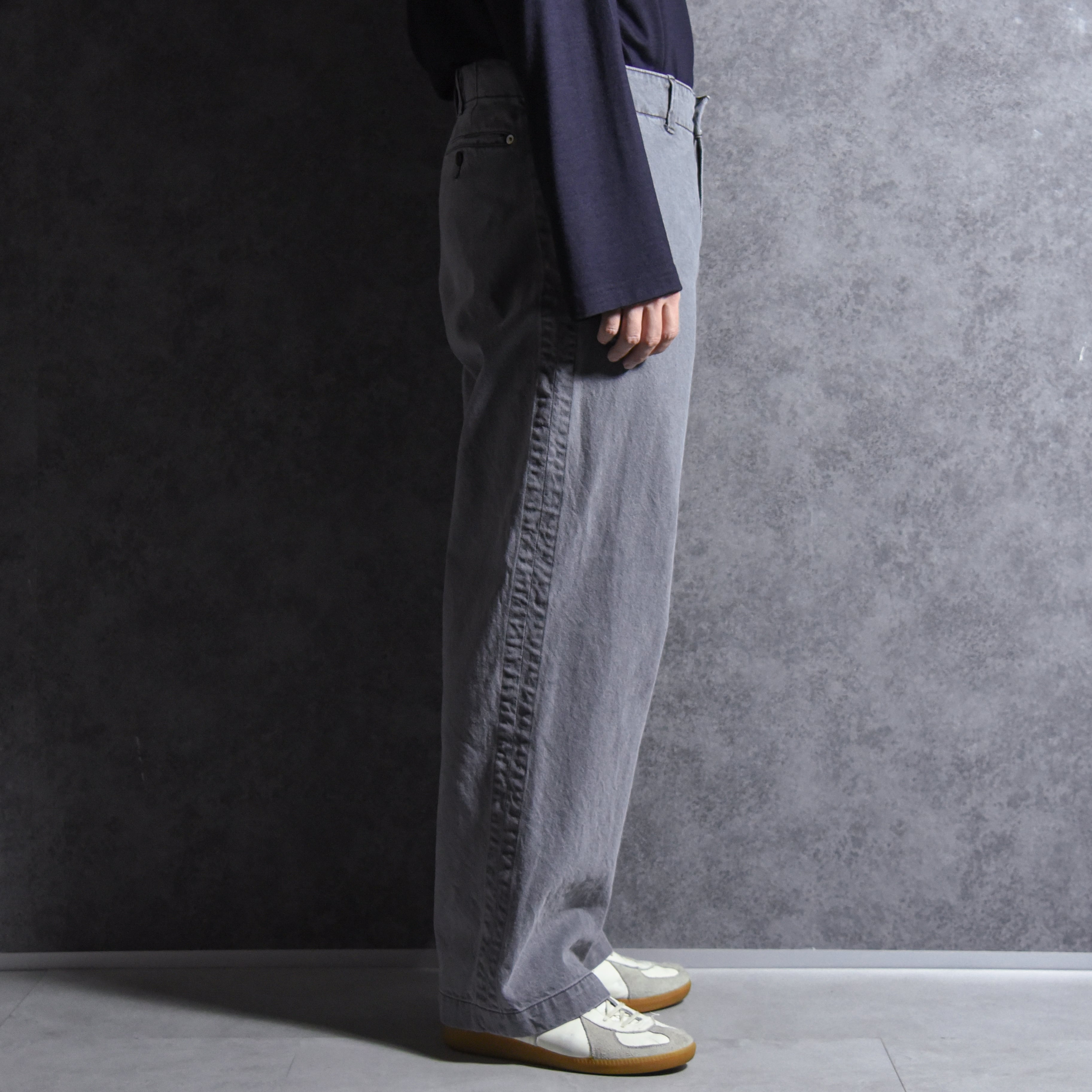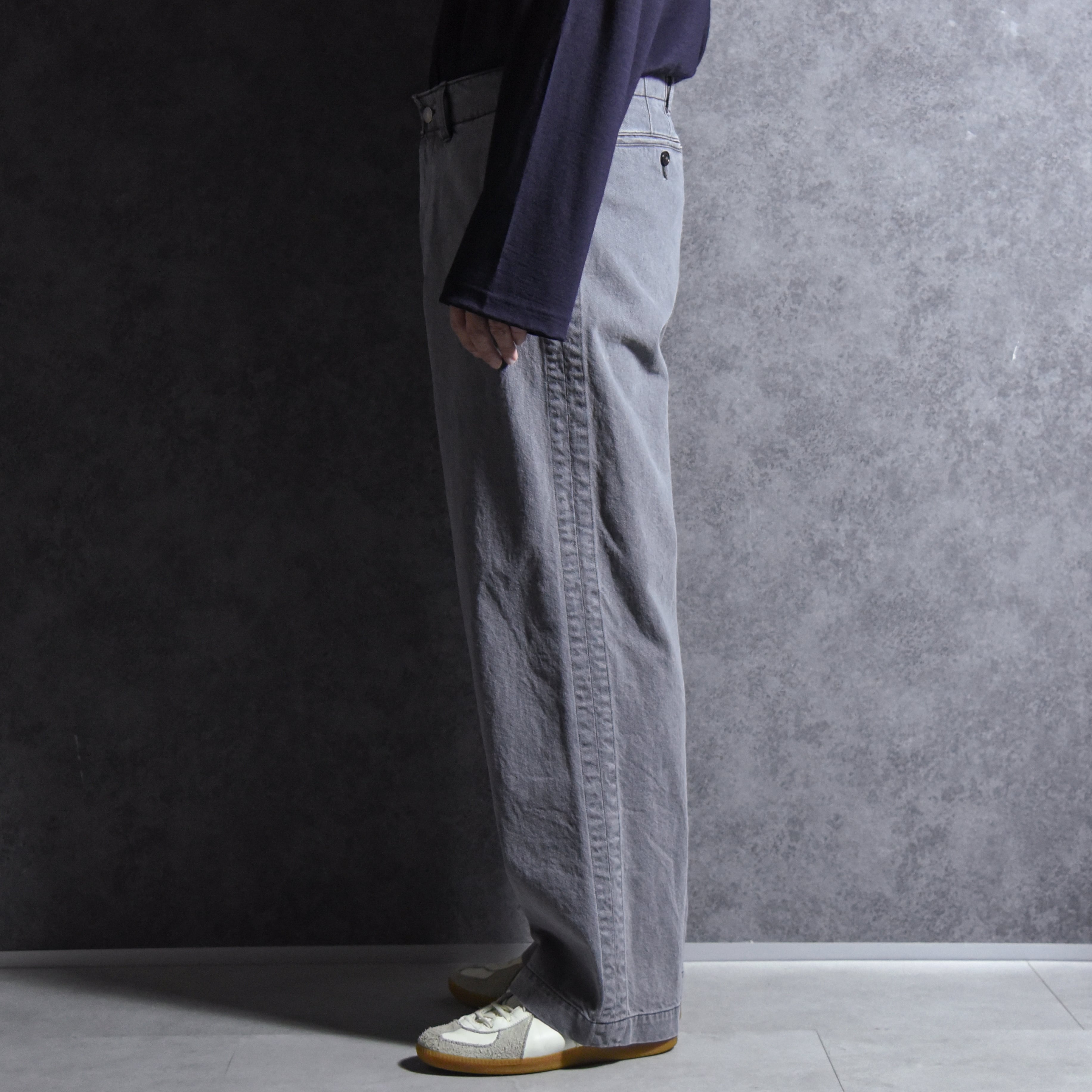 シルエットはユーロヴィンテージのフィールドパンツを基調にしており、大きく取られたゆとりの中にどこか綺麗さを感じるシルエット。