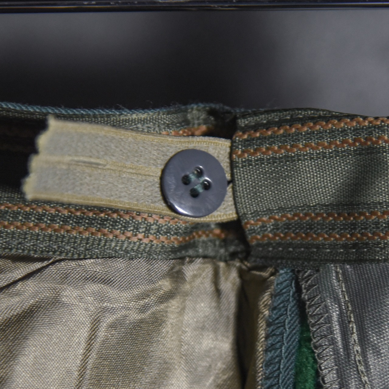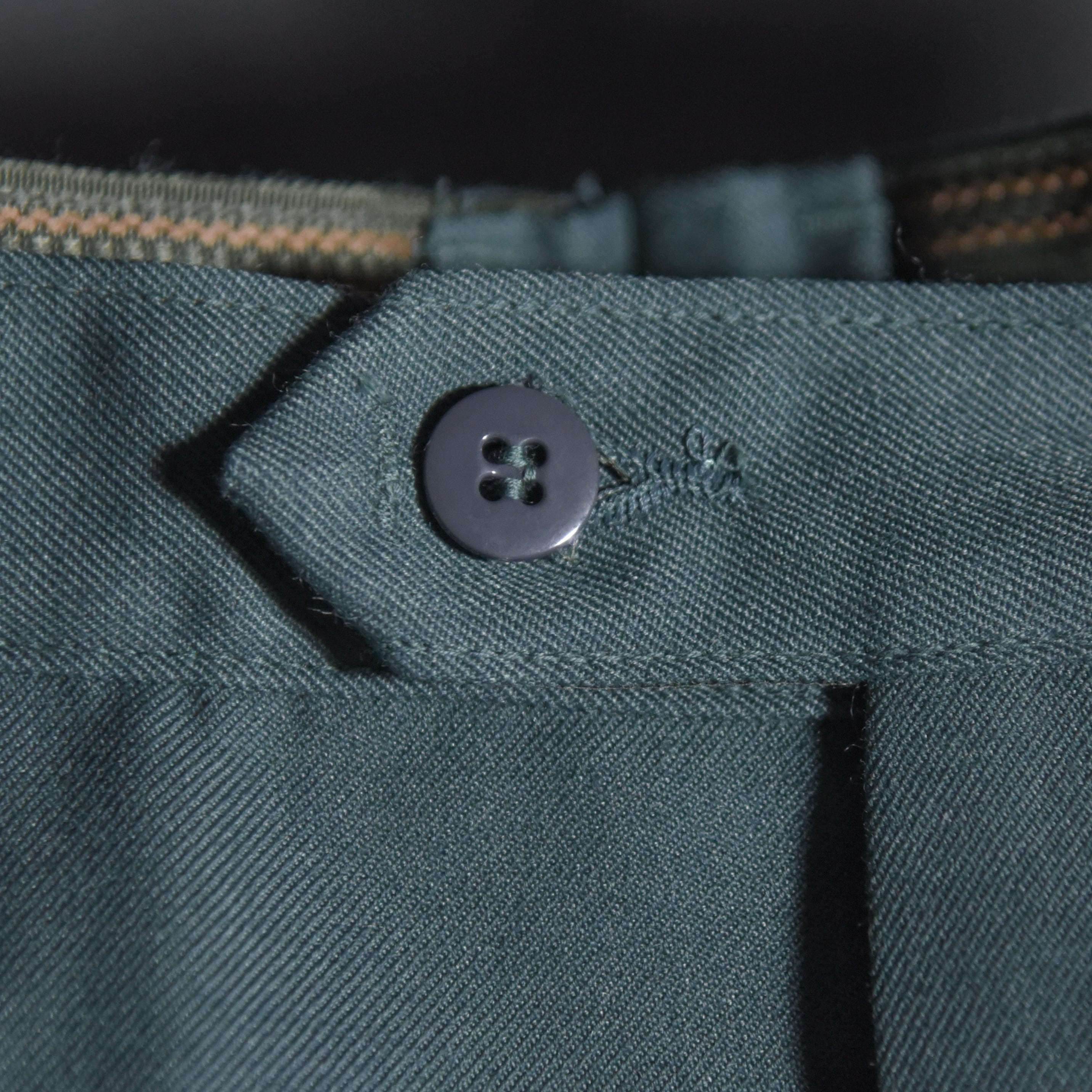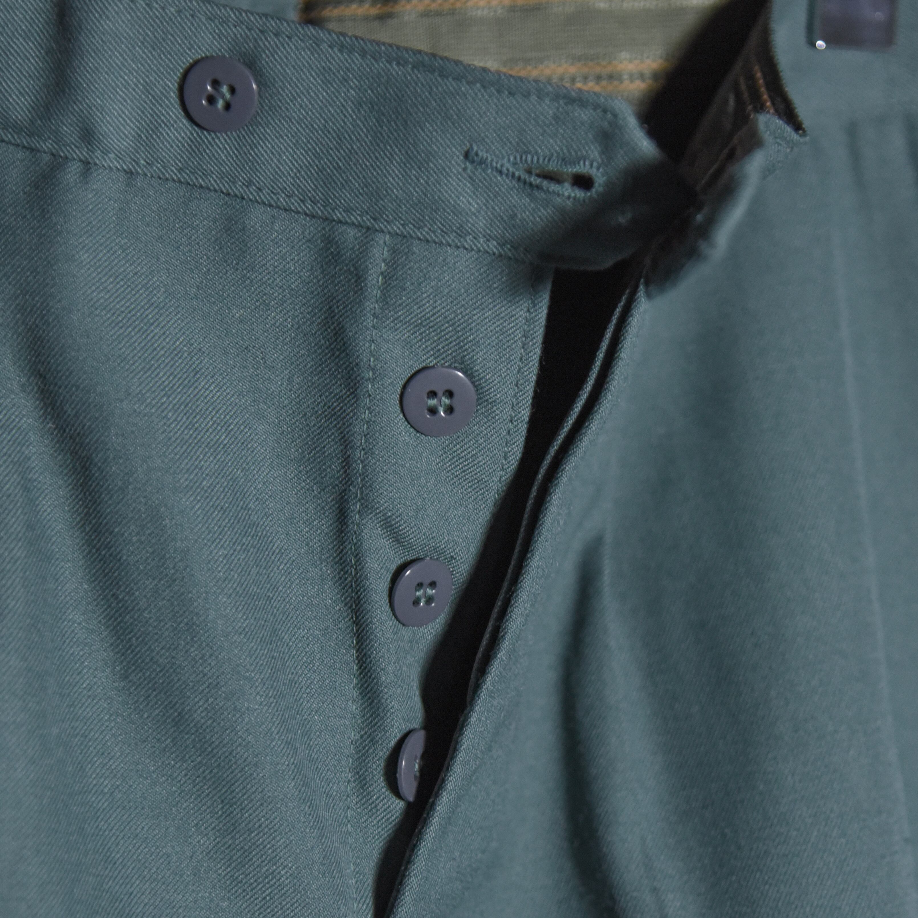 1980年代に採用されていたドレスパンツで、ネイビーにグレーの側章、ベルトループがつかない上品でエレガントな印象の一本。