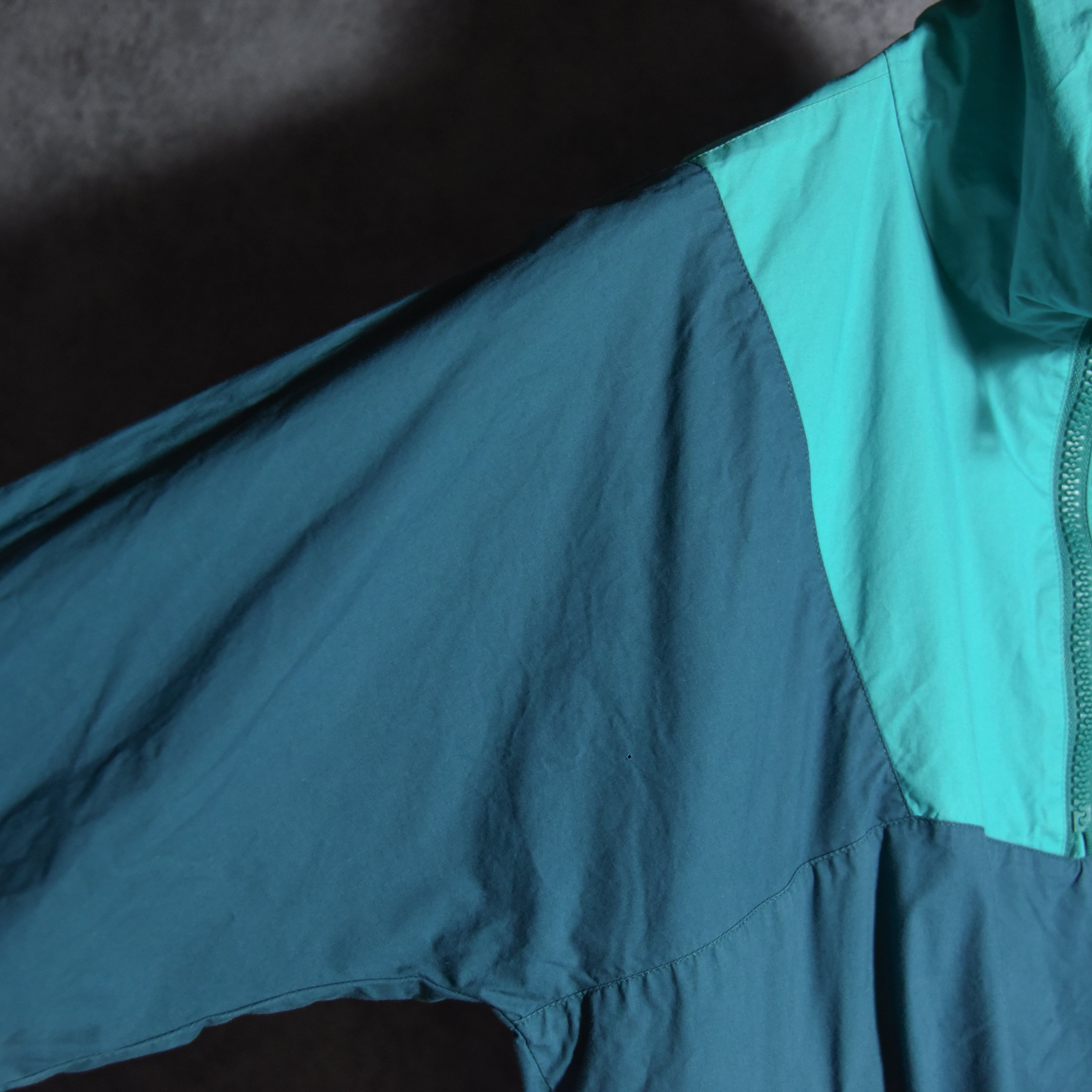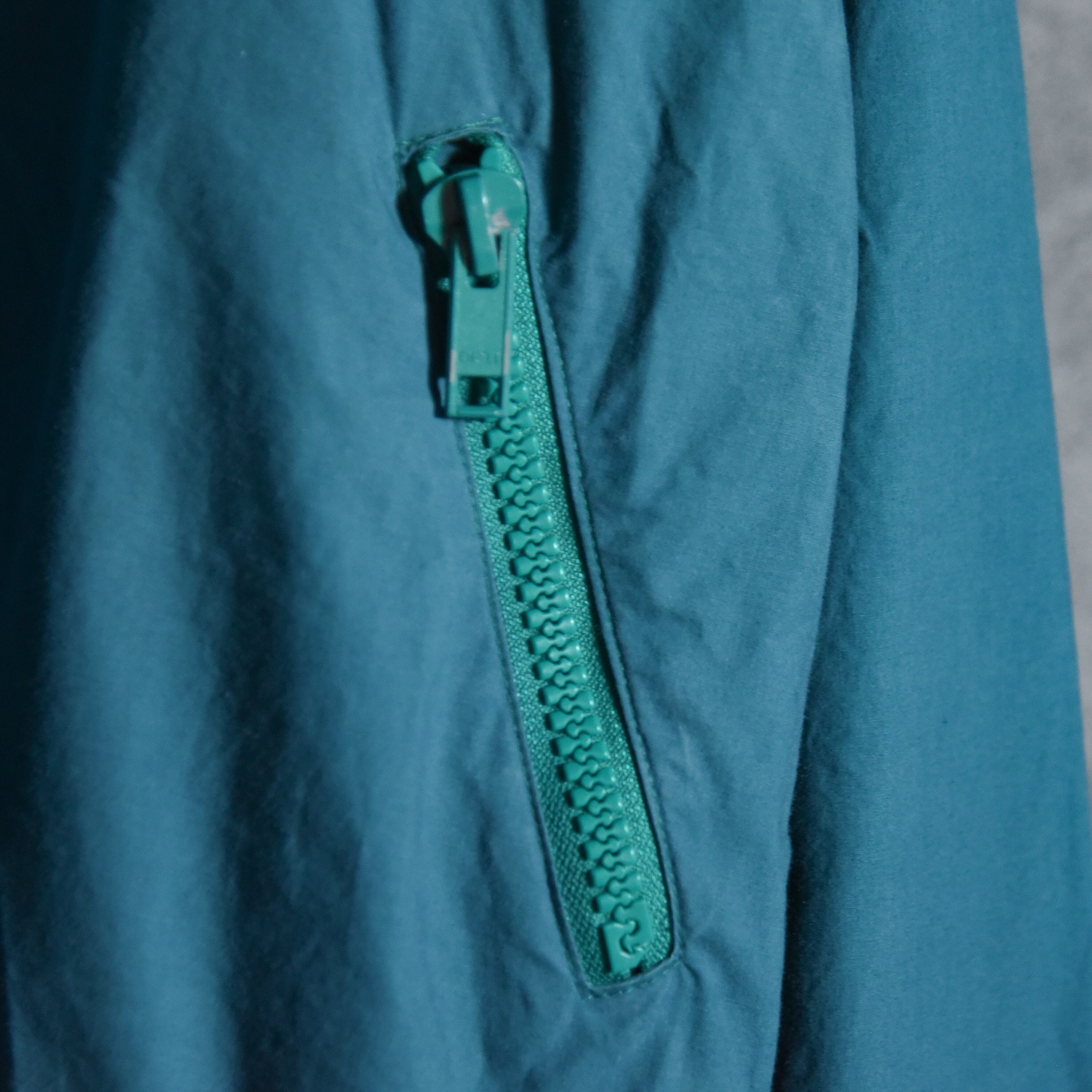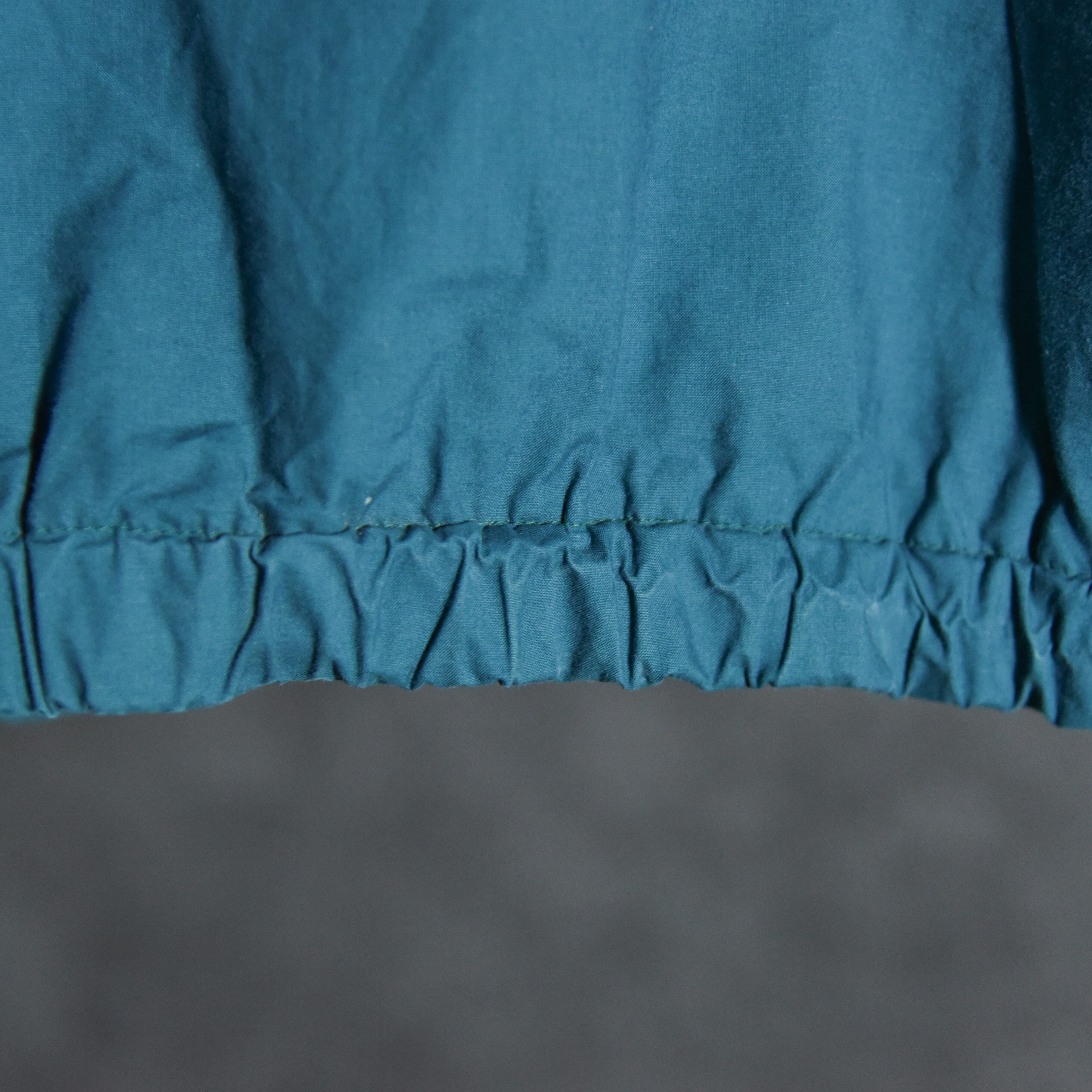 ターコイズブルーとダルブルーのバイカラー、Vラインの切り替えは、当時のスキーアノラックやトラックトップらしいカラーリングとディテール。