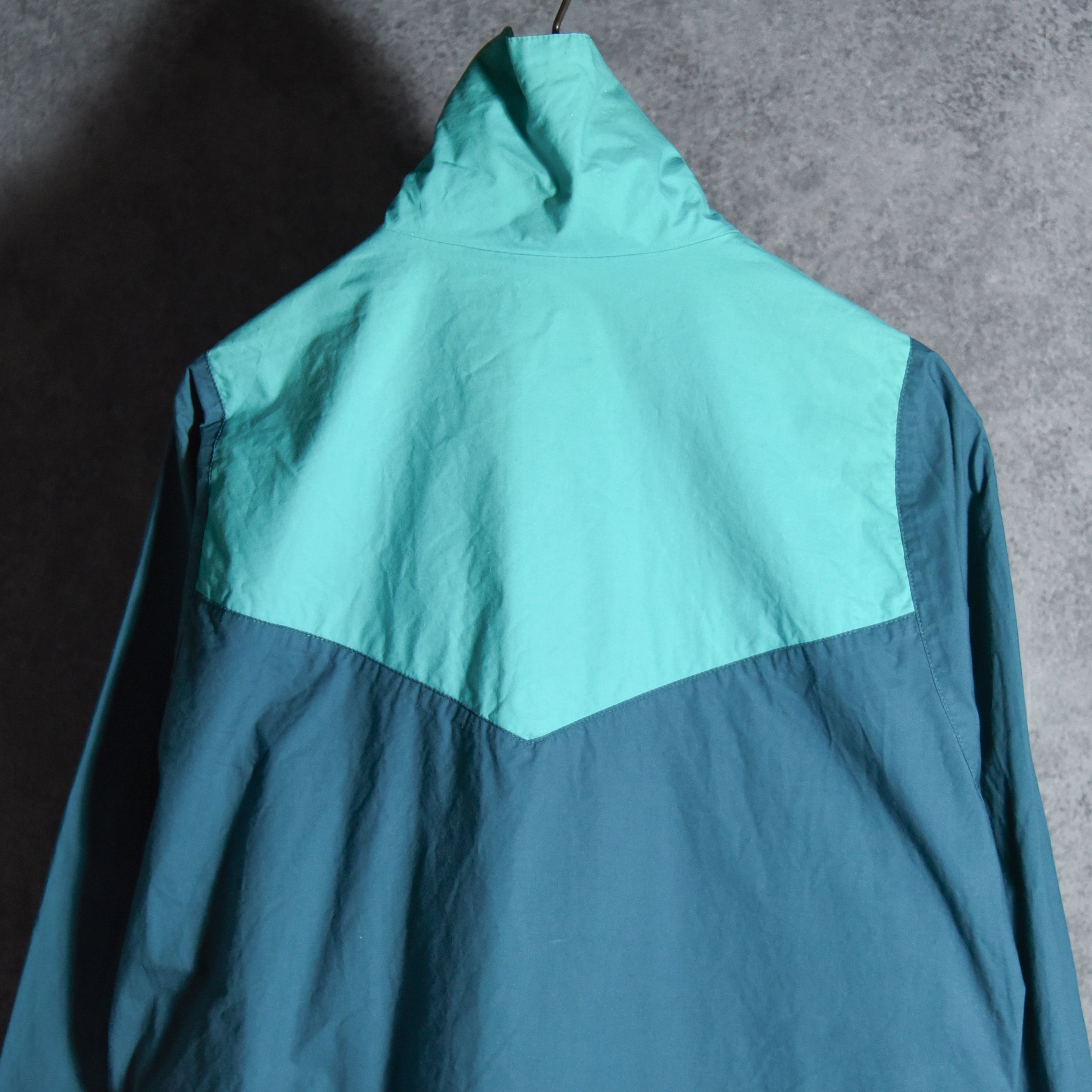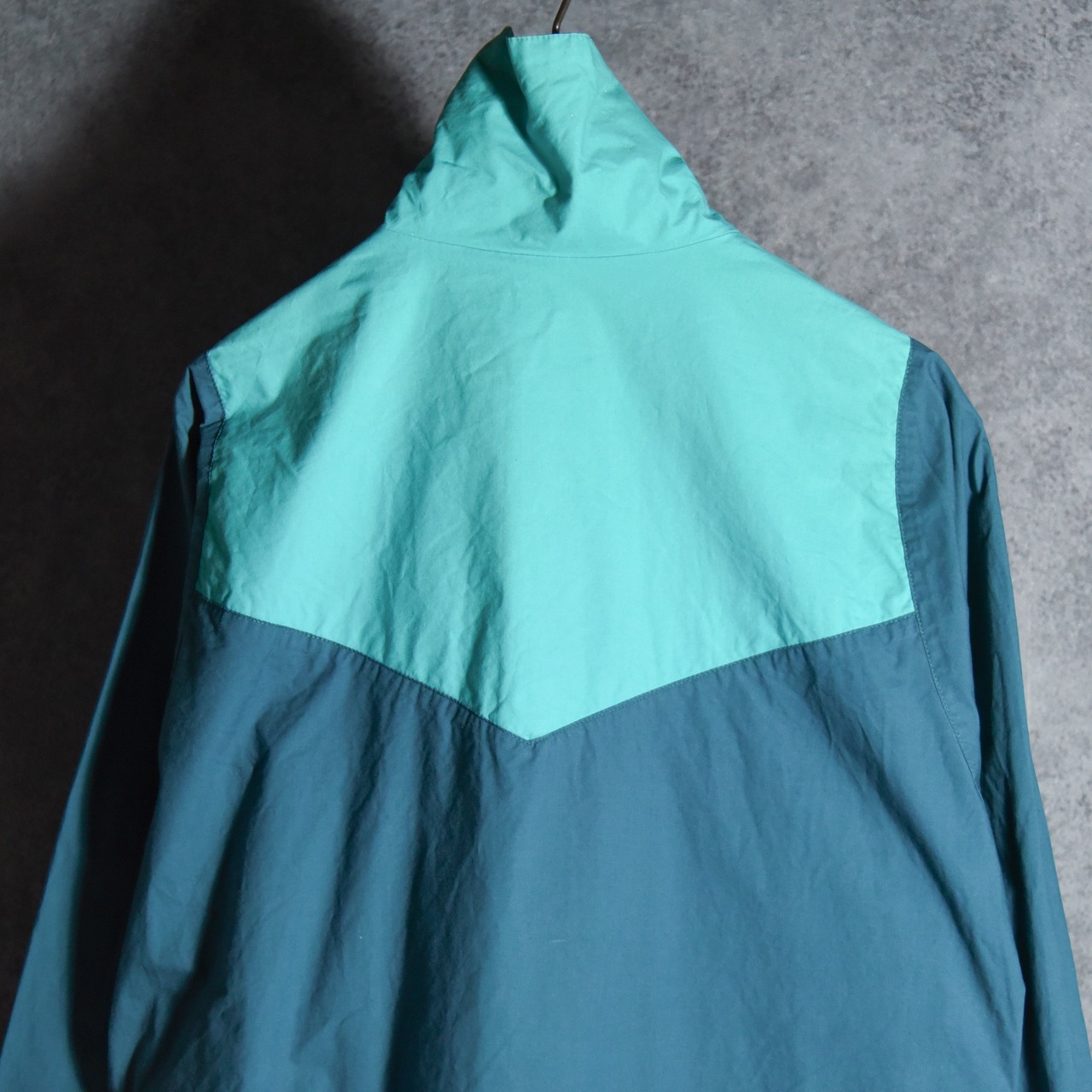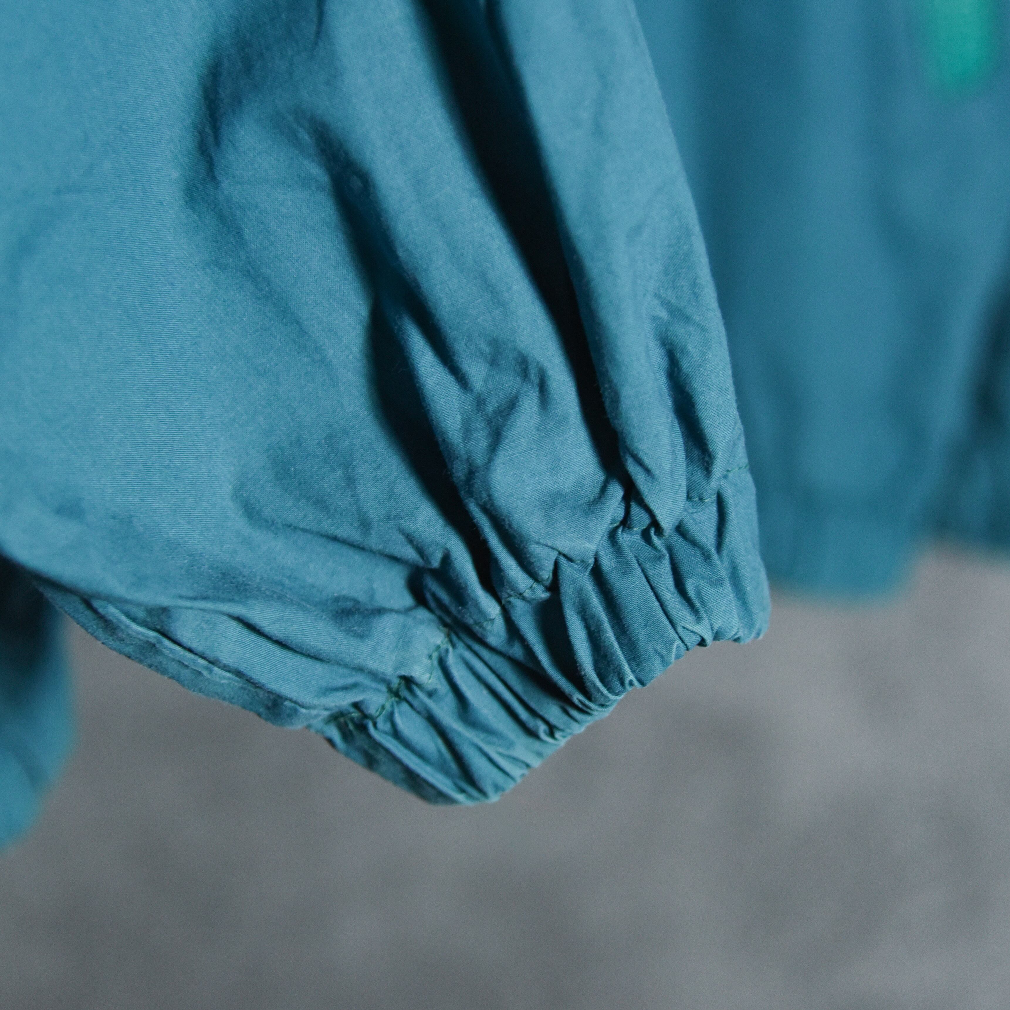 ターコイズブルーとダルブルーのバイカラー、Vラインの切り替えは、当時のスキーアノラックやトラックトップらしいカラーリングとディテール。