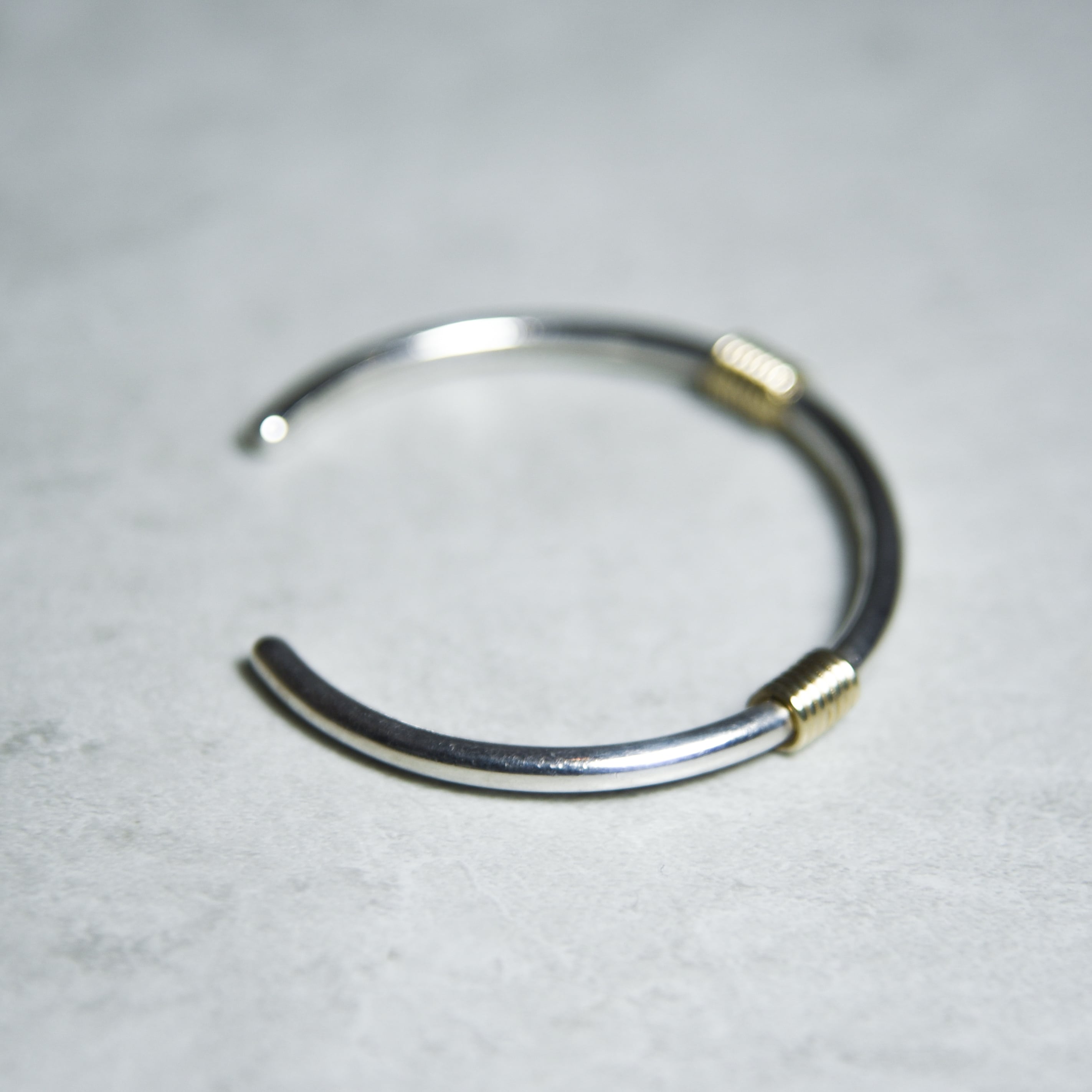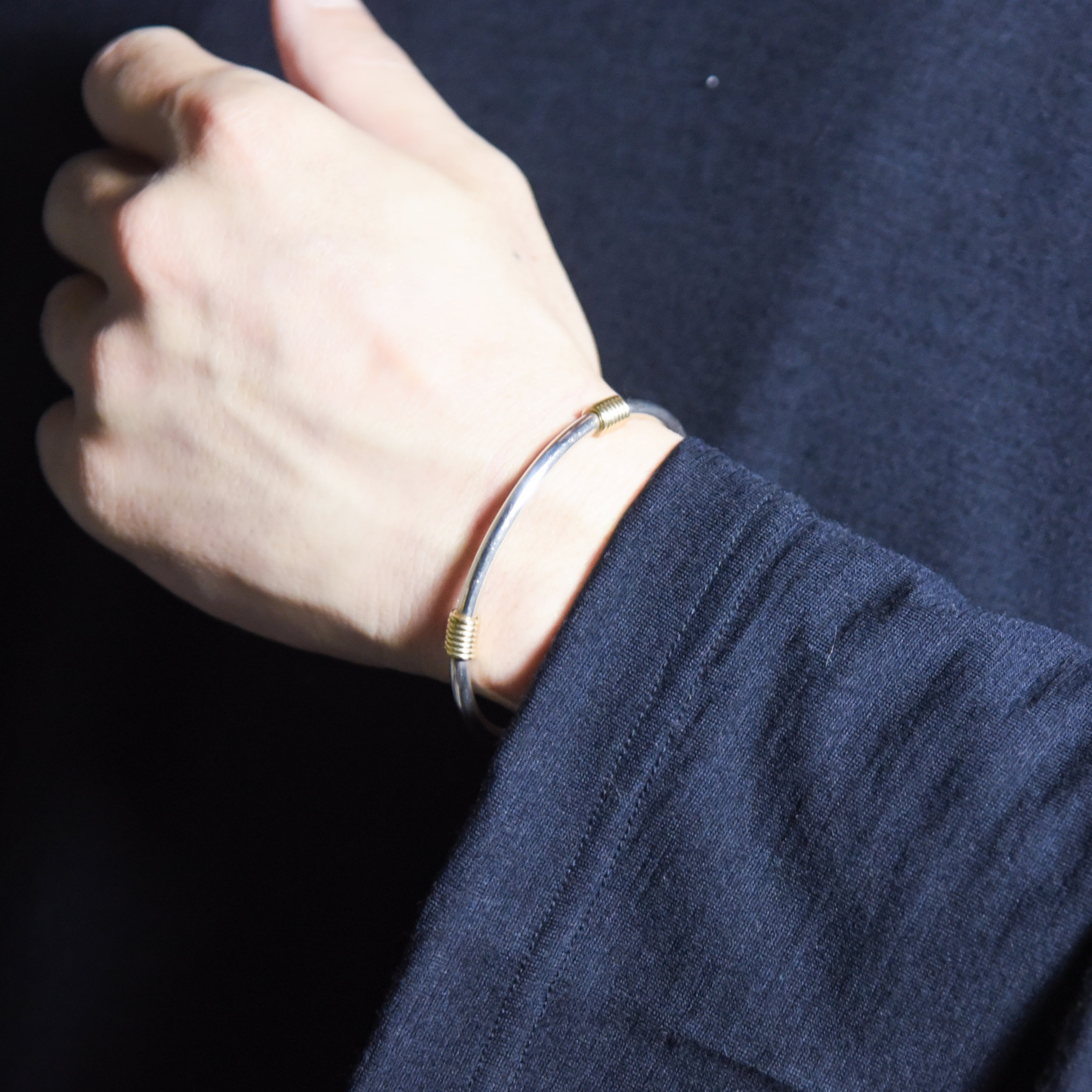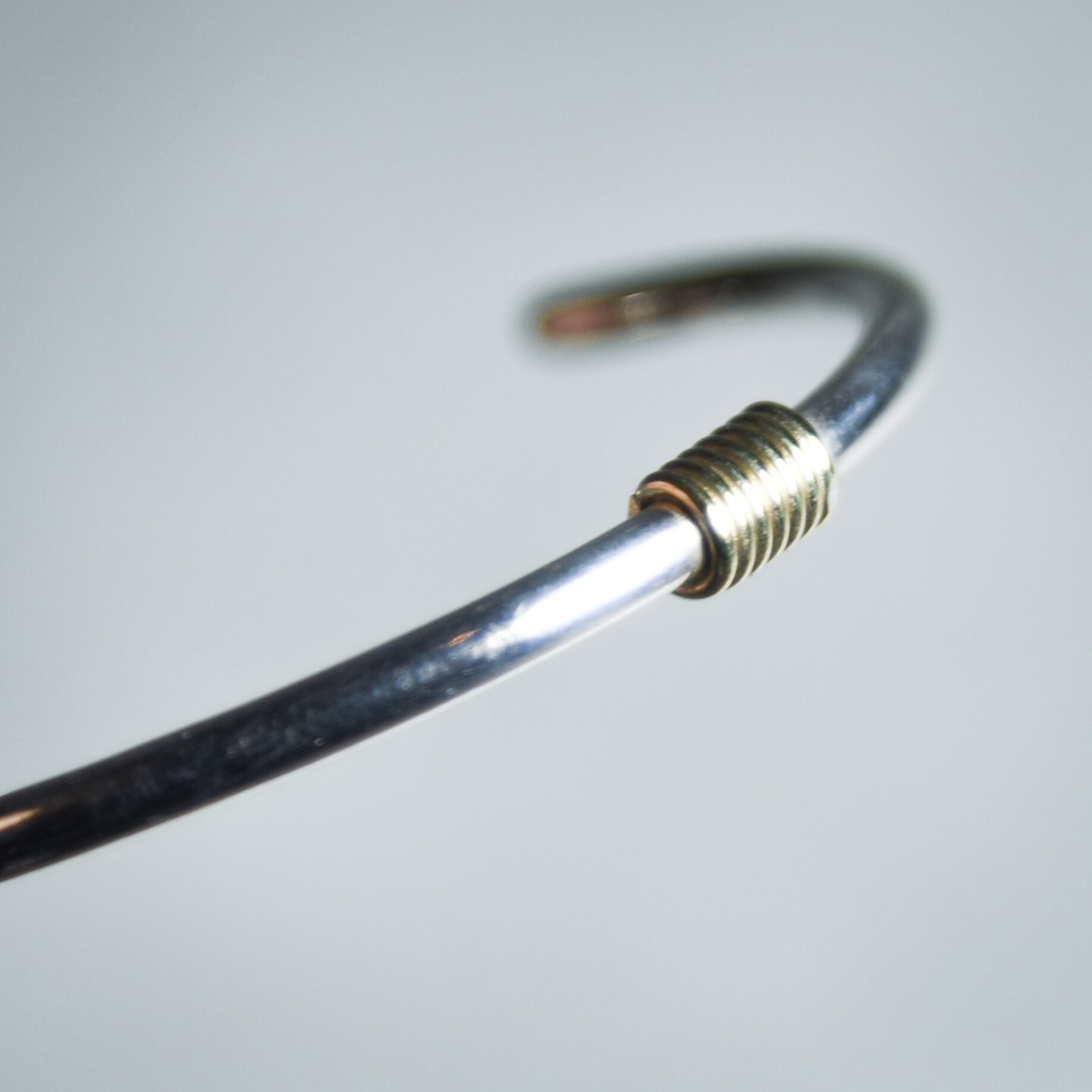シンプルなシルバーのラウンドバーに、2箇所ブラス(真鍮)のワイヤーが巻き付けられたデザインです。