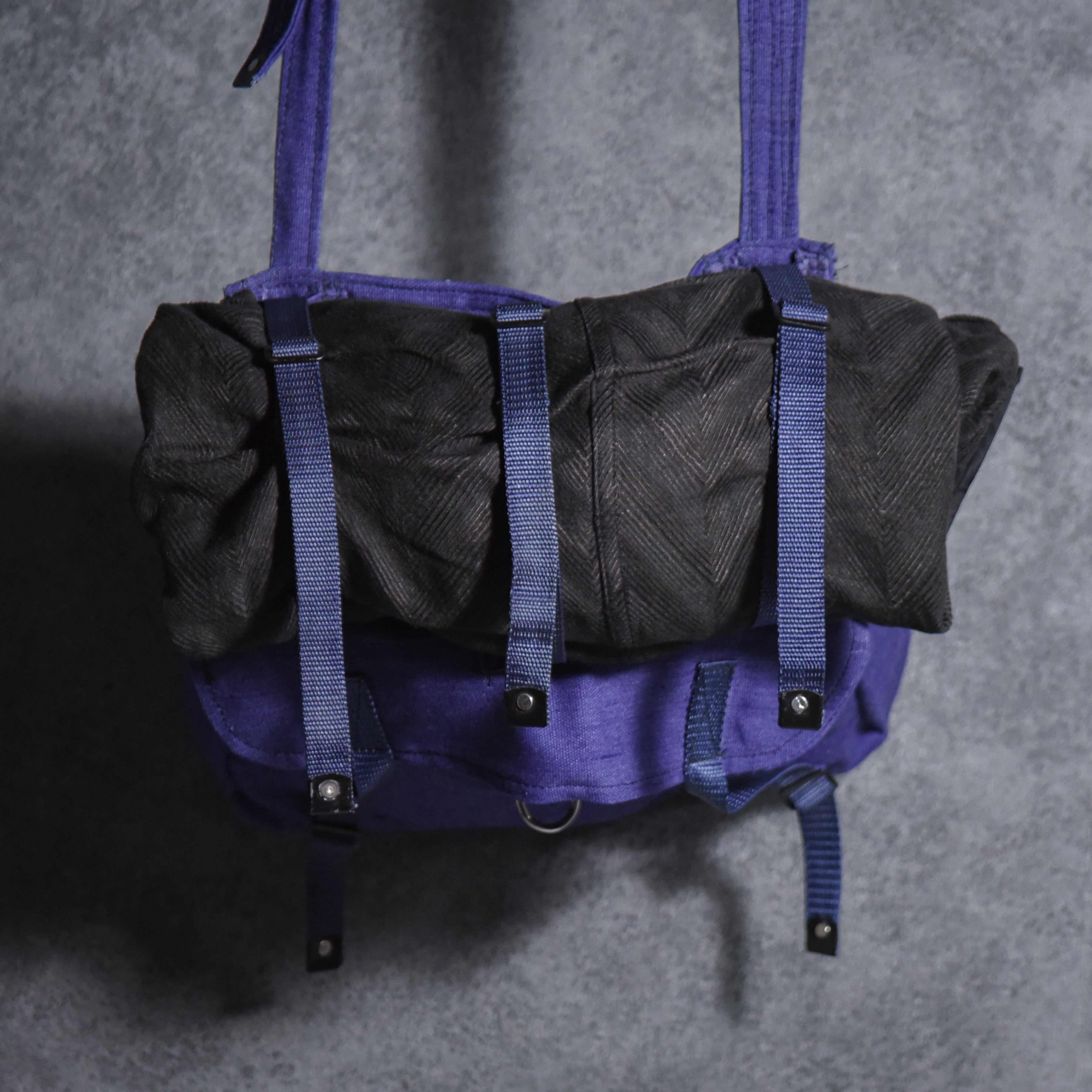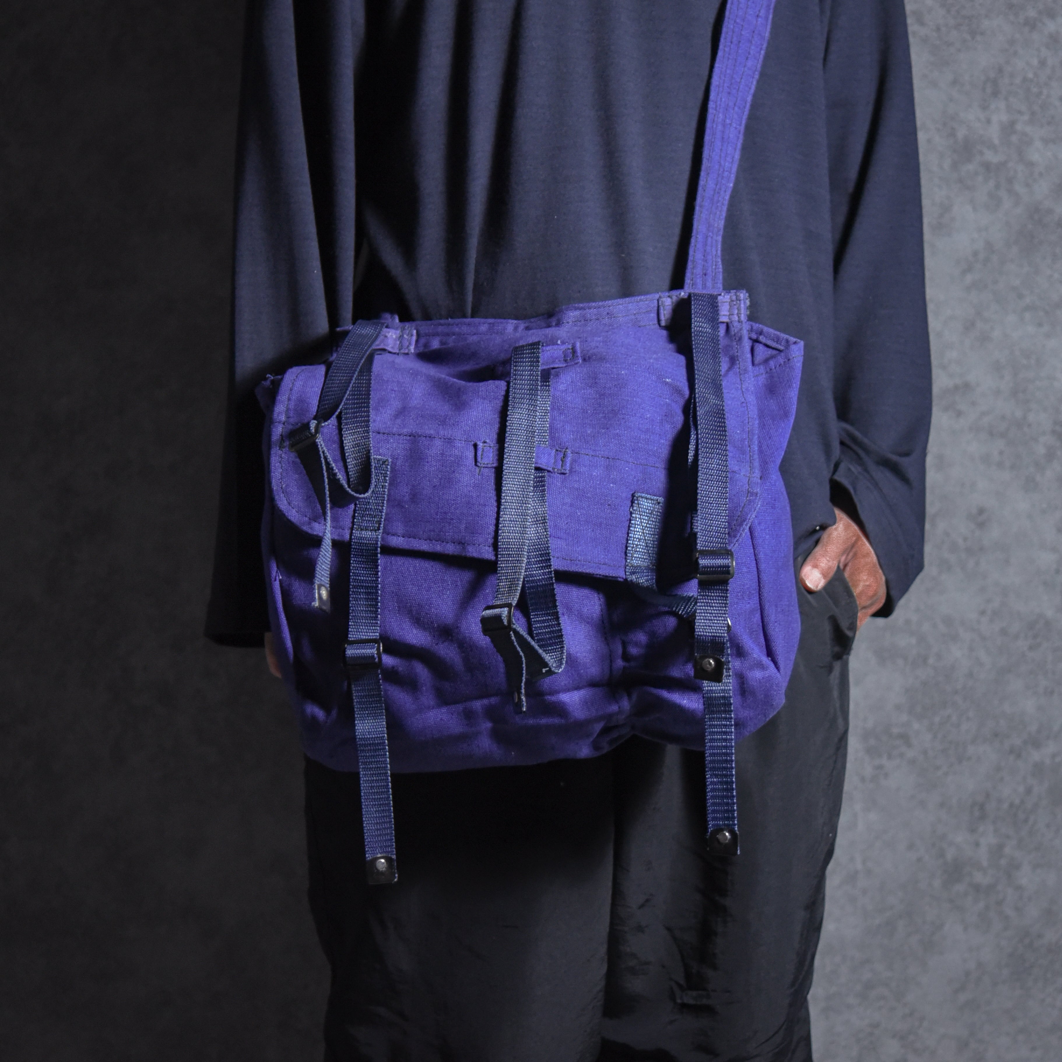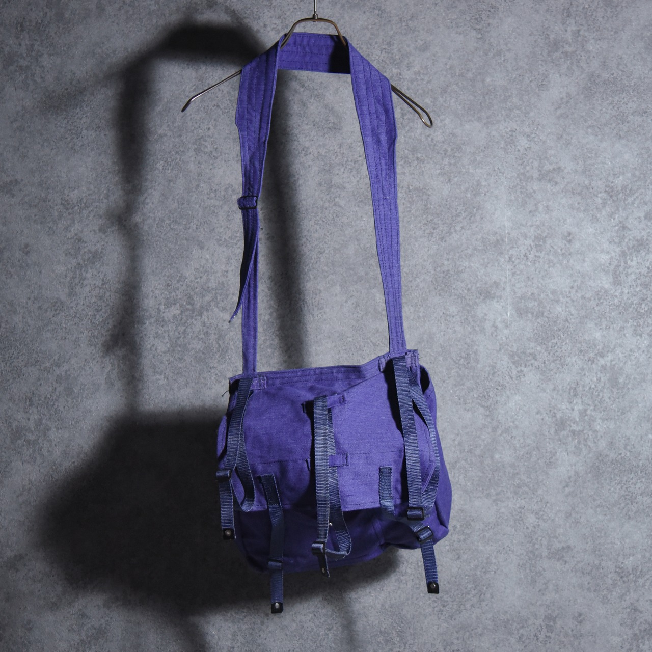 頑強なコットンキャンバスと3本のナイロンストラップがコンビになった、雰囲気のあるショルダーバッグ。