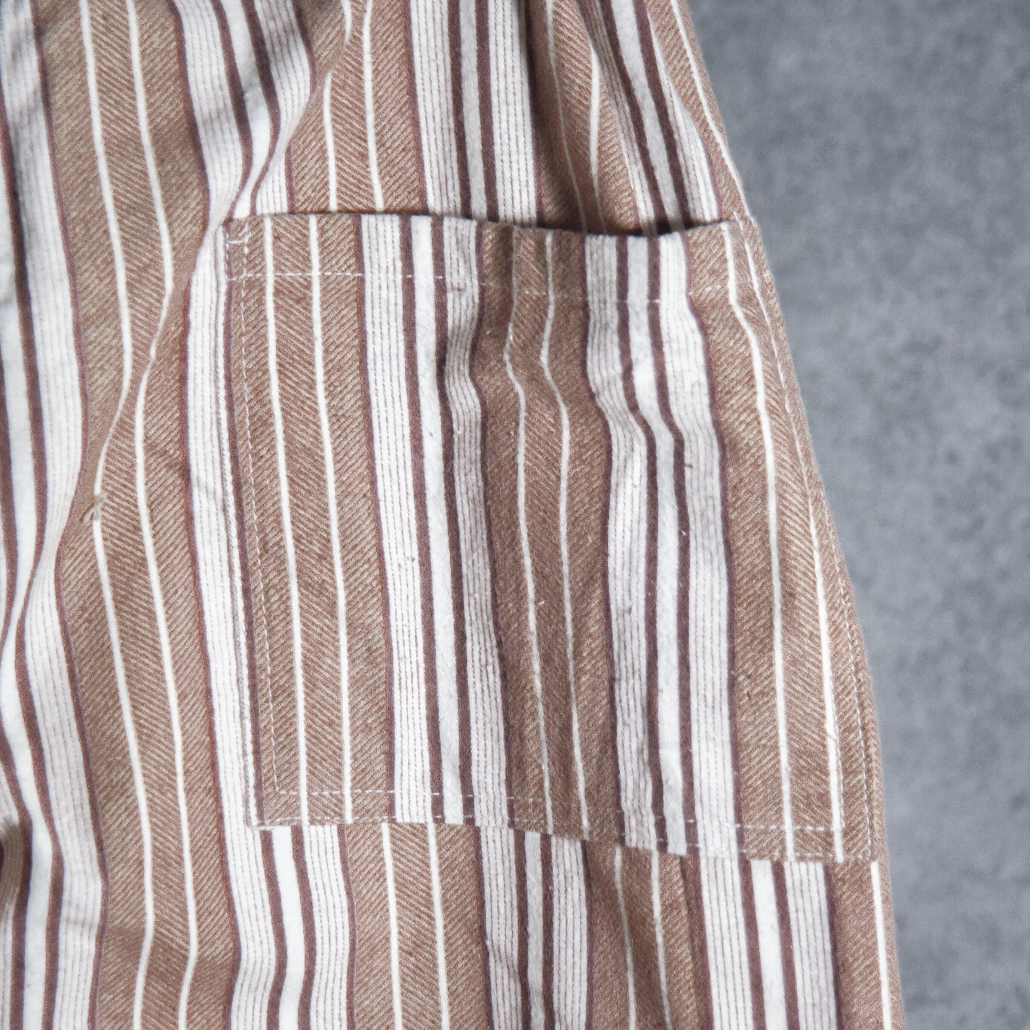 スリーピングパンツとして採用されていた一着で、本来開いているフロントを縫い閉じ、両サイドにパッチポケットを付け、さらにウエストゴムを入れ直すリメイクによって、室内着としてだけではなく、ファッションにも取り入れられるカジュアルなイージーパンツに仕上げました。