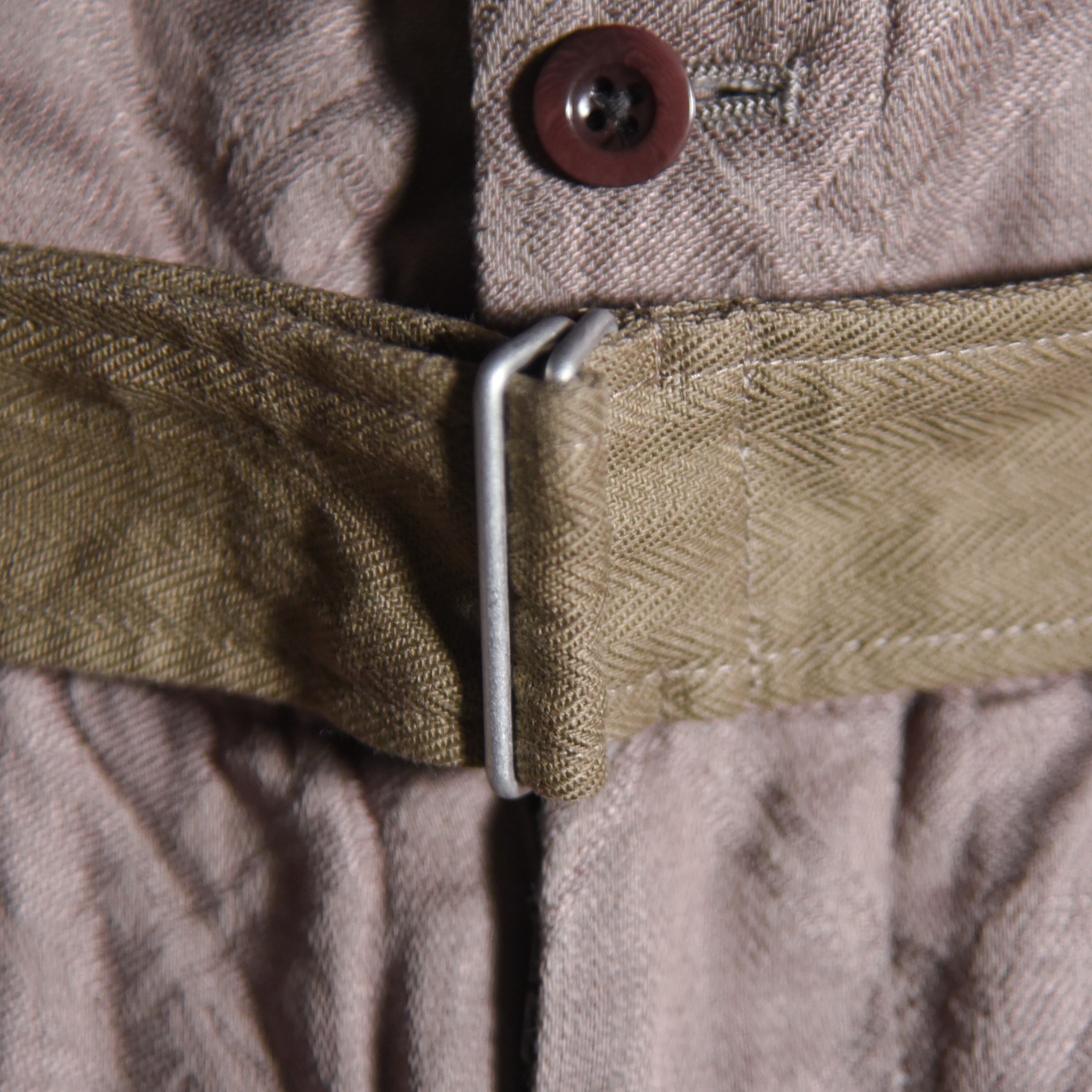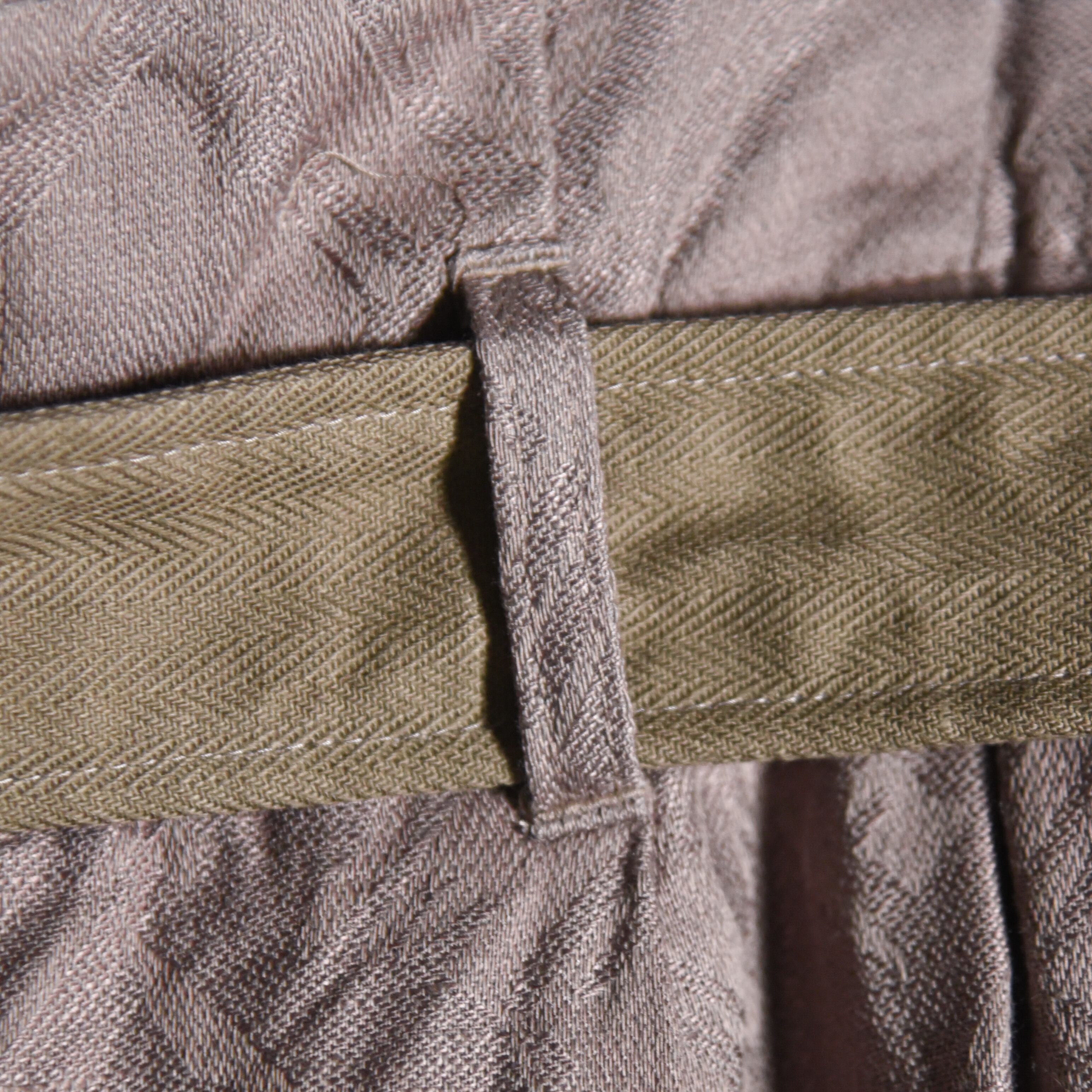 トップスをタックインした時に映えるハイウエストの仕様で、コットンヘリンボーンのベルトも付属しまし、ウエスト部分はベルトで隠れる位置にシャーリングゴムが入っているので、イージーパンツのような快適な穿き心地も魅力です。