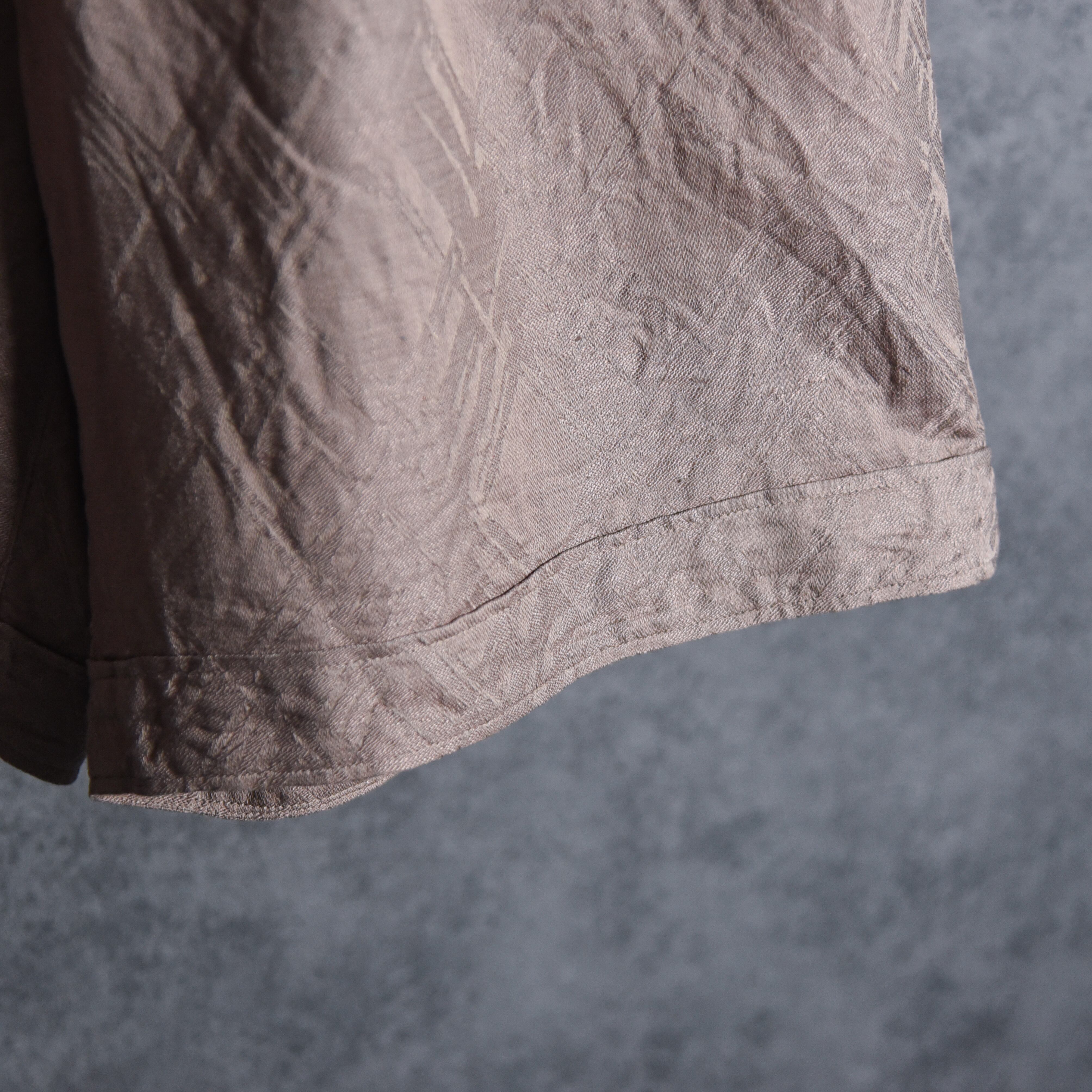 スラブ感のあるリネン糸と細番手のコットン糸を交織し、表情豊かな幾何学模様のジャガード柄に織り上げた特徴的な生地を使用。