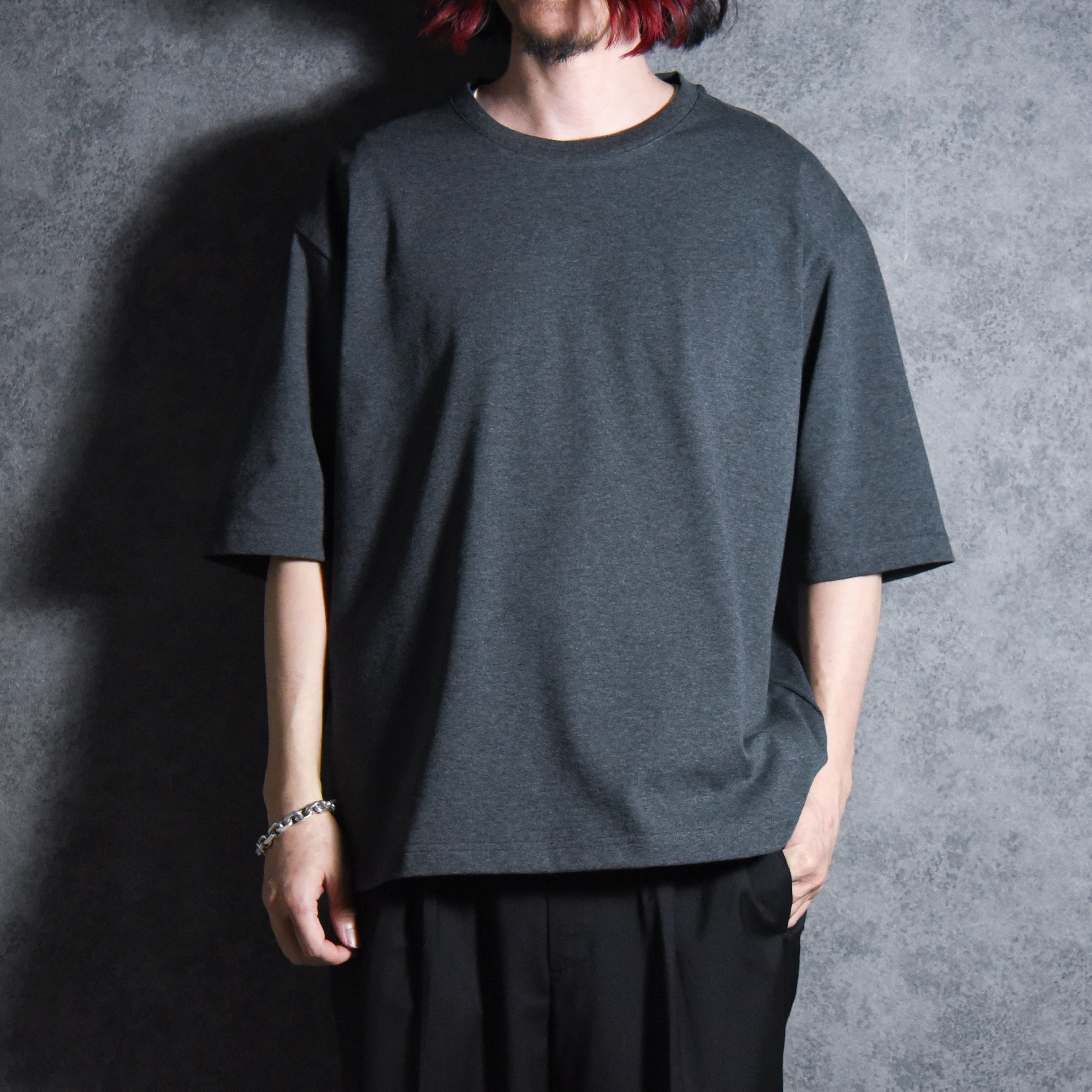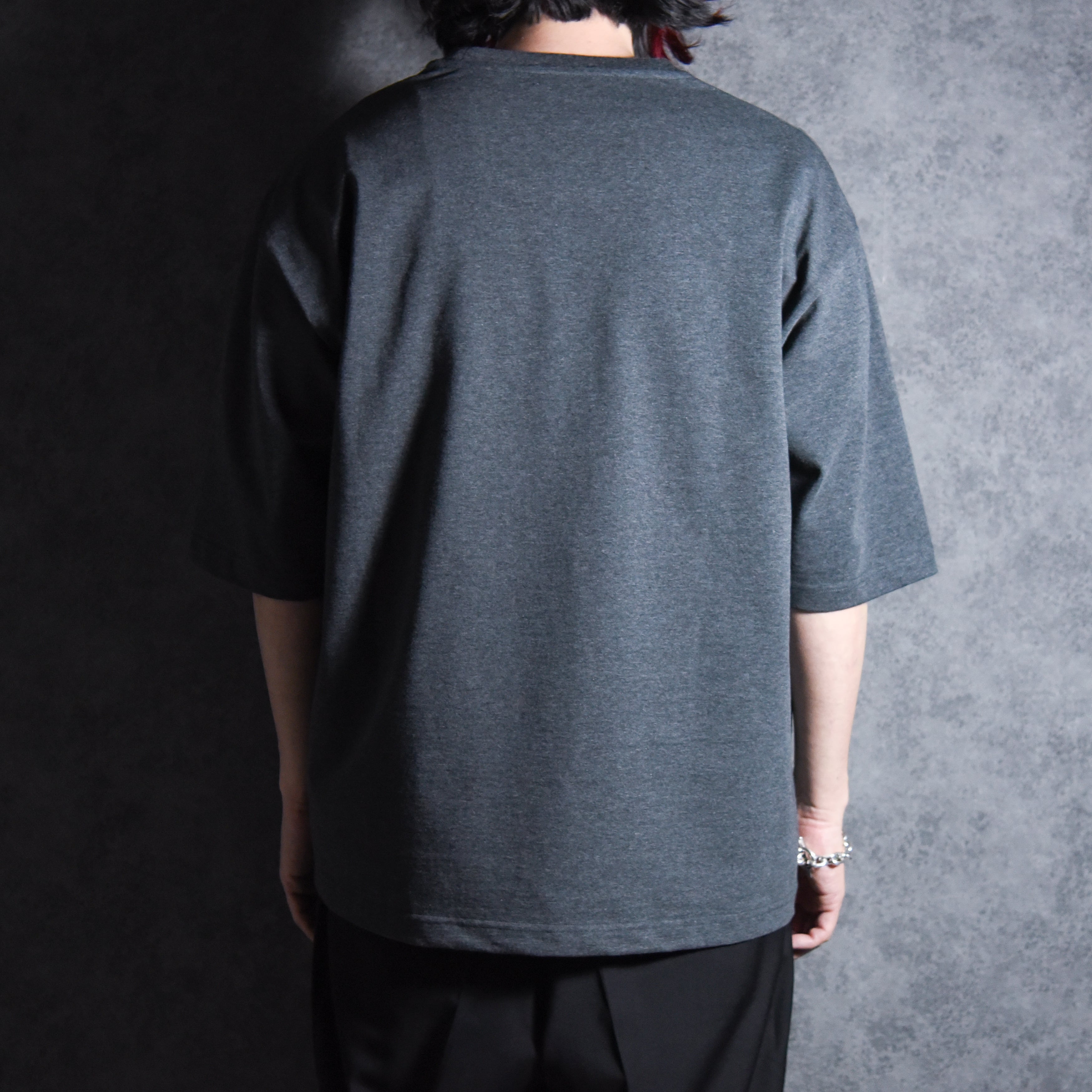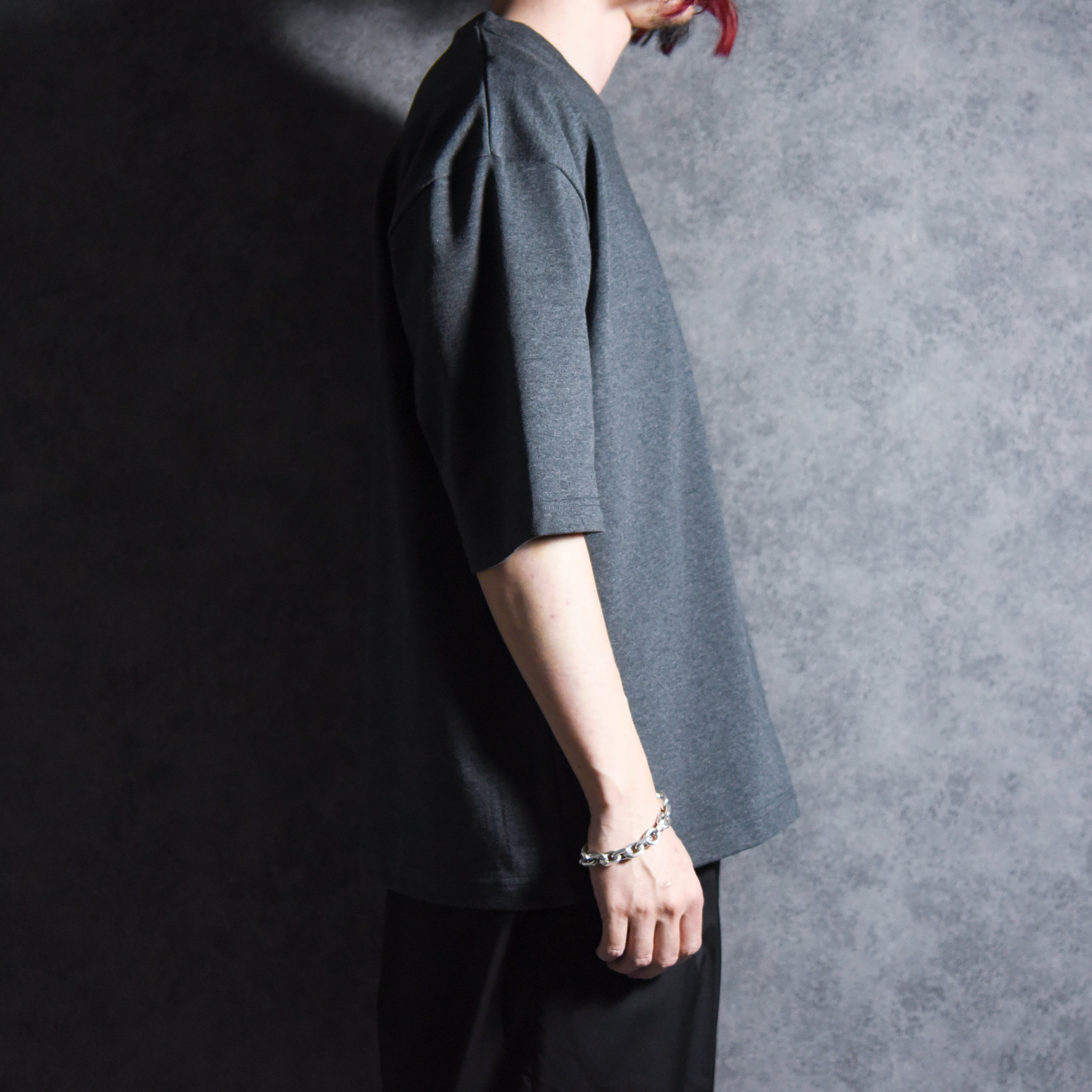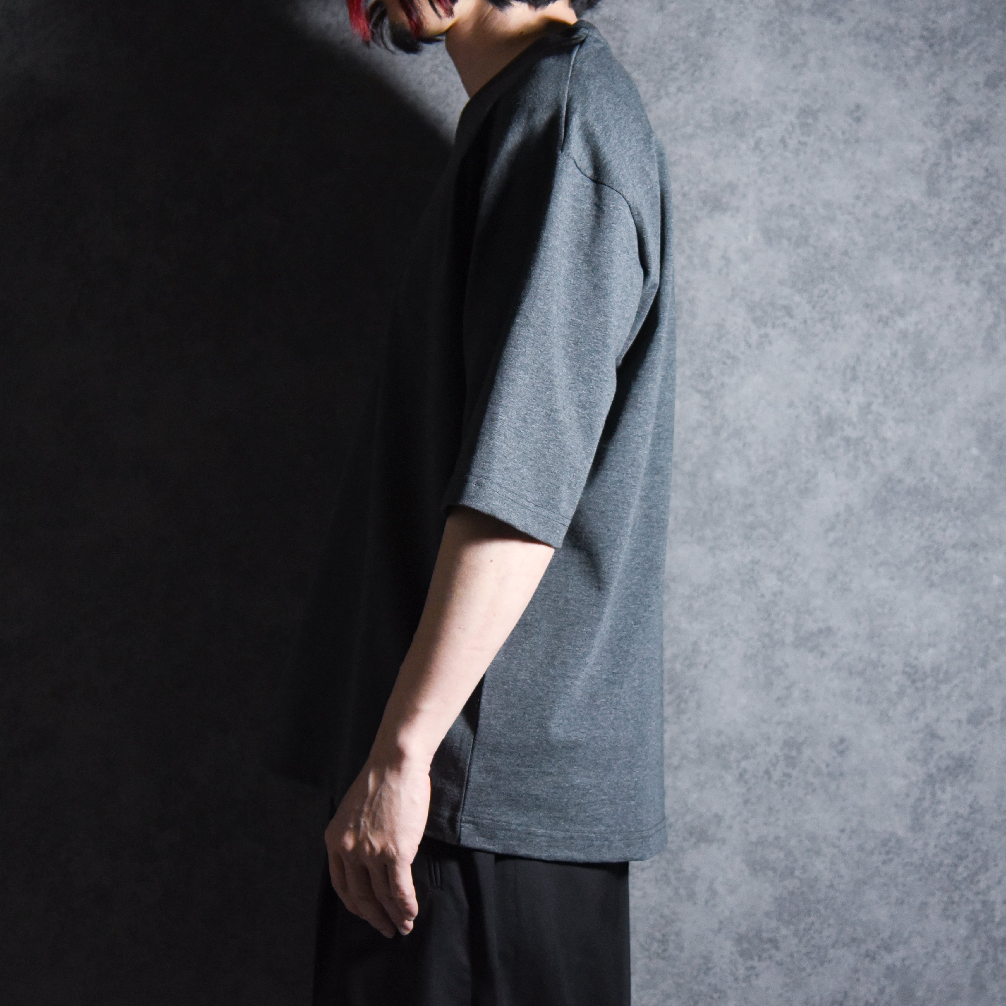 着用感はM、L共に身幅にゆとりを持たせつつ身丈はすっきりとさせており、袖をやや長めでにすることで着用画像の通りバランスのいいシルエットに仕上げています。