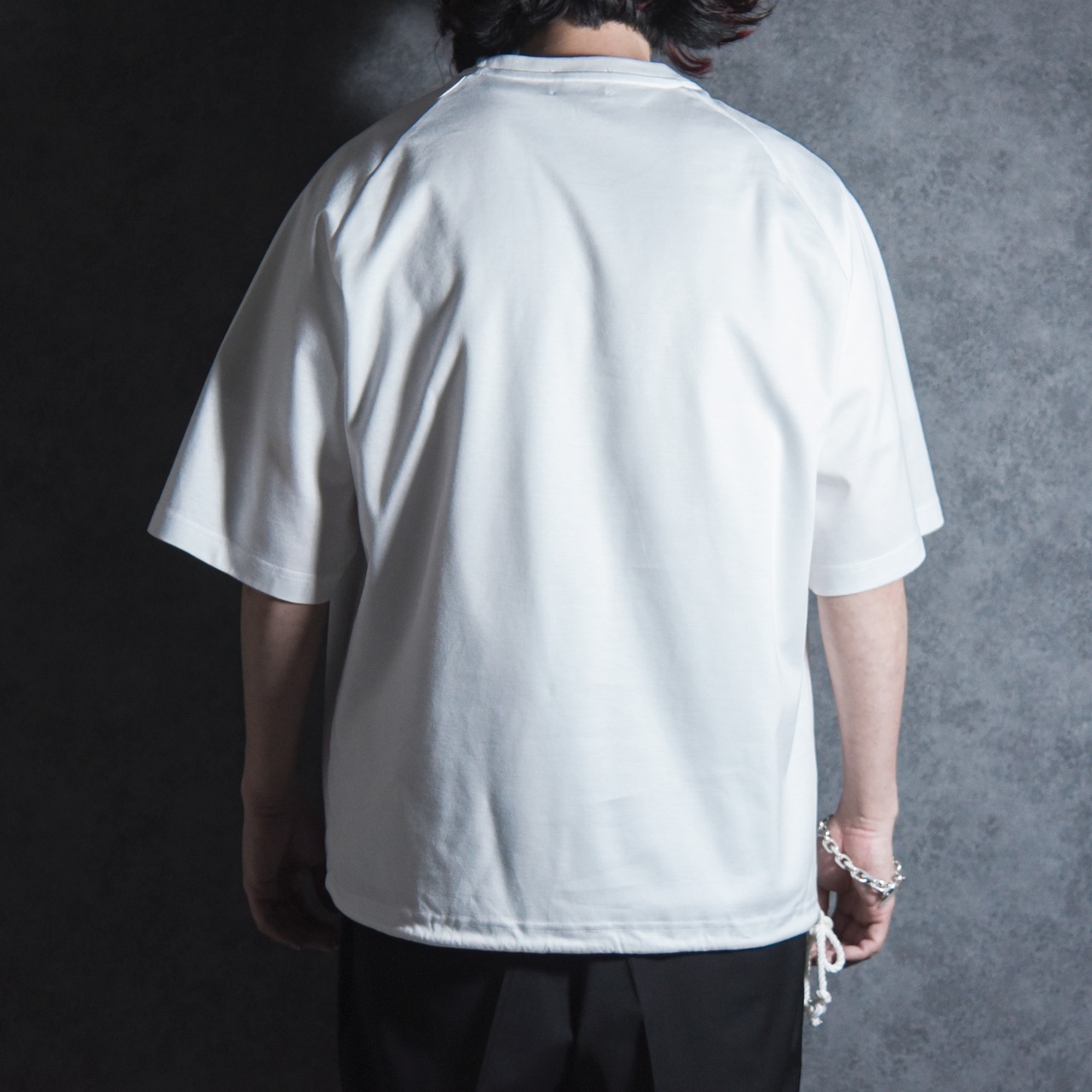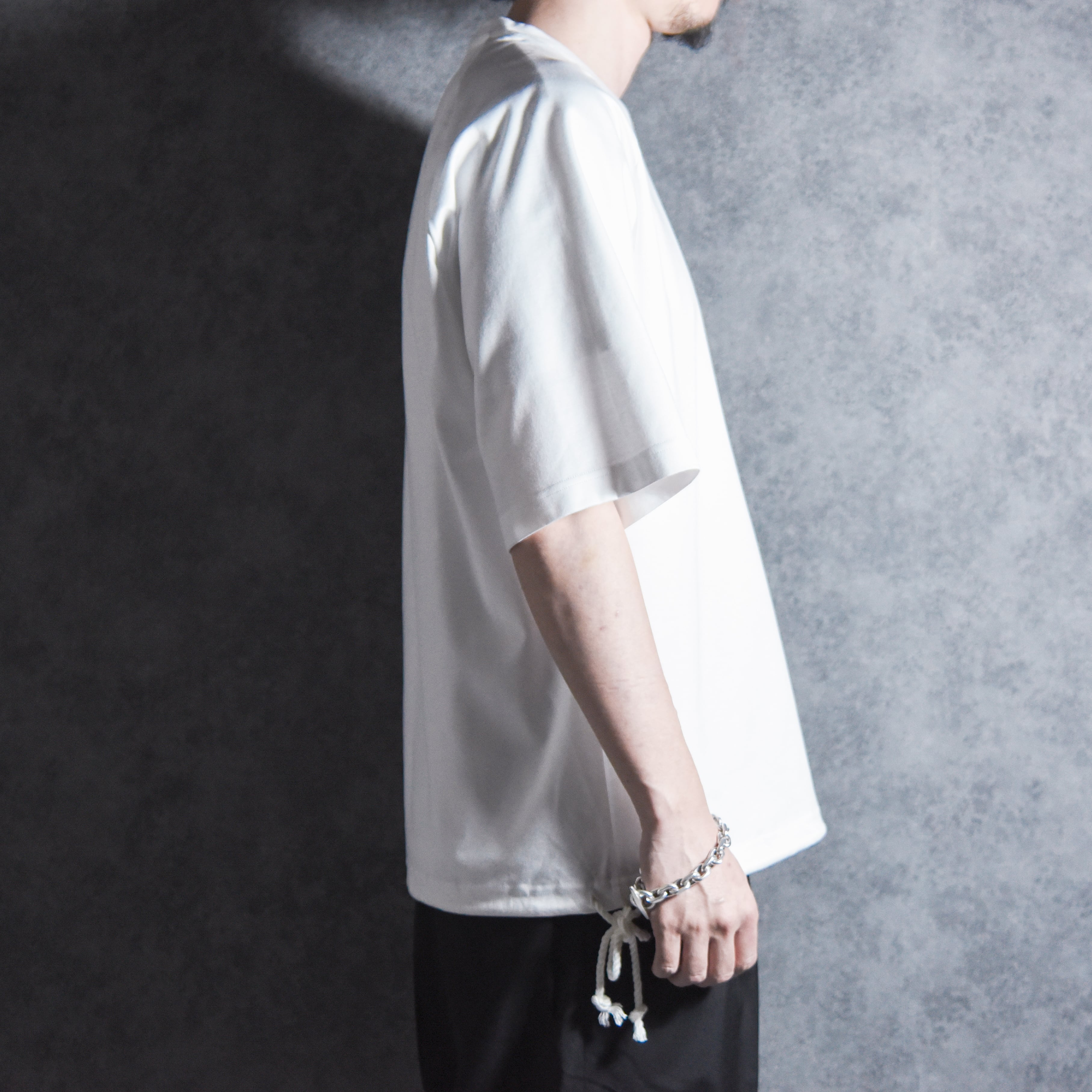 一見シンプルなクルーネックですが裾はコットンコードを絞ることでシルエット変化を楽しめ、コードもプラスチックのストッパーなどは付けずに結ぶだけの仕様なので、スポーティな雰囲気になりすぎない大人も着やすいデザインに仕上がっています。
