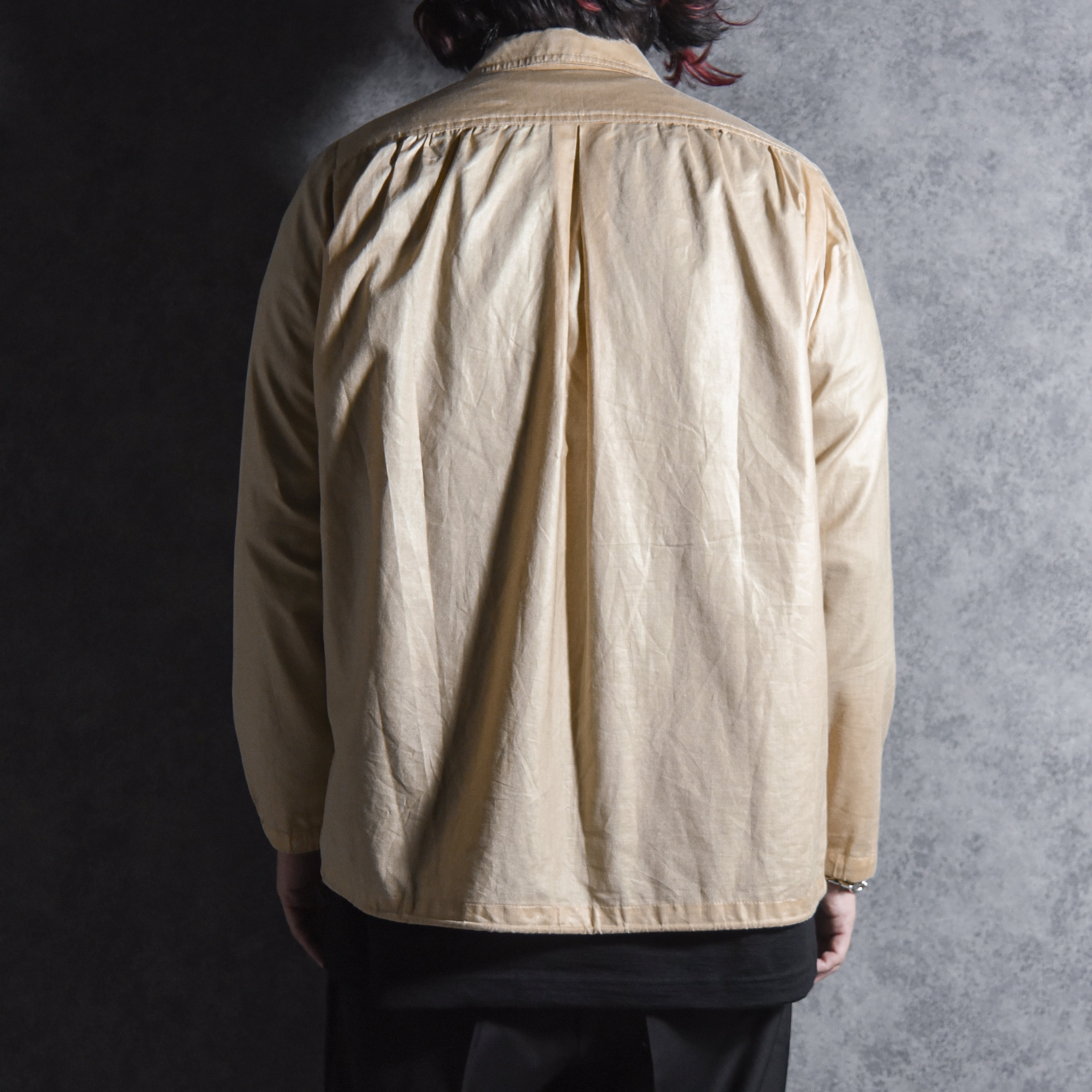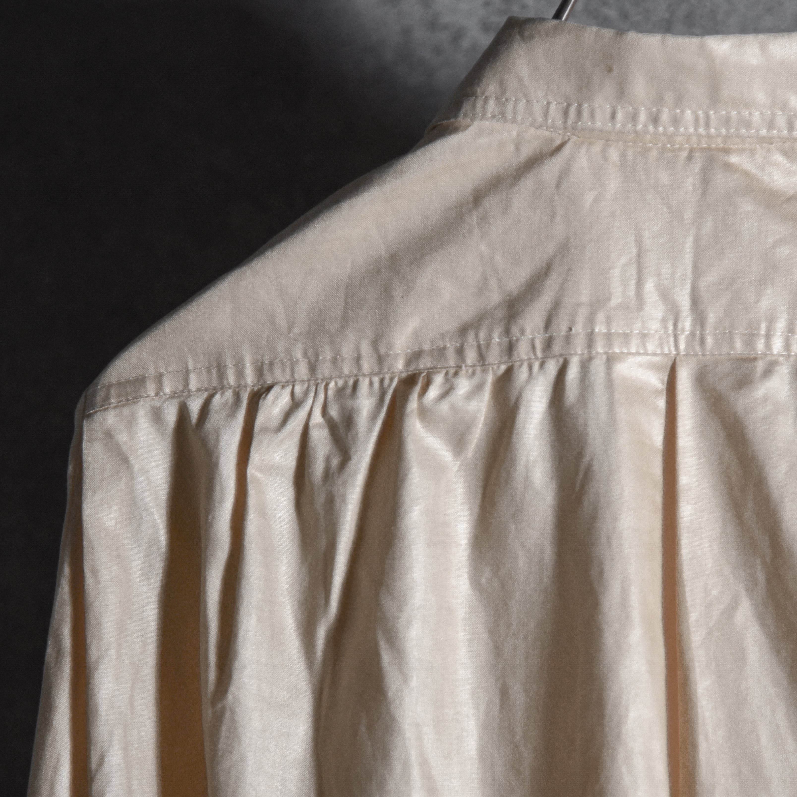 ヴィンテージシャツに見られる背面と前見頃にも施されたギャザーによって、つくられる丸みのあるシルエット、コットン製の上品な光沢など当時のフレンチ・カジュアルや、少しドレッシーなワークスタイルを意識したデザインの一着。