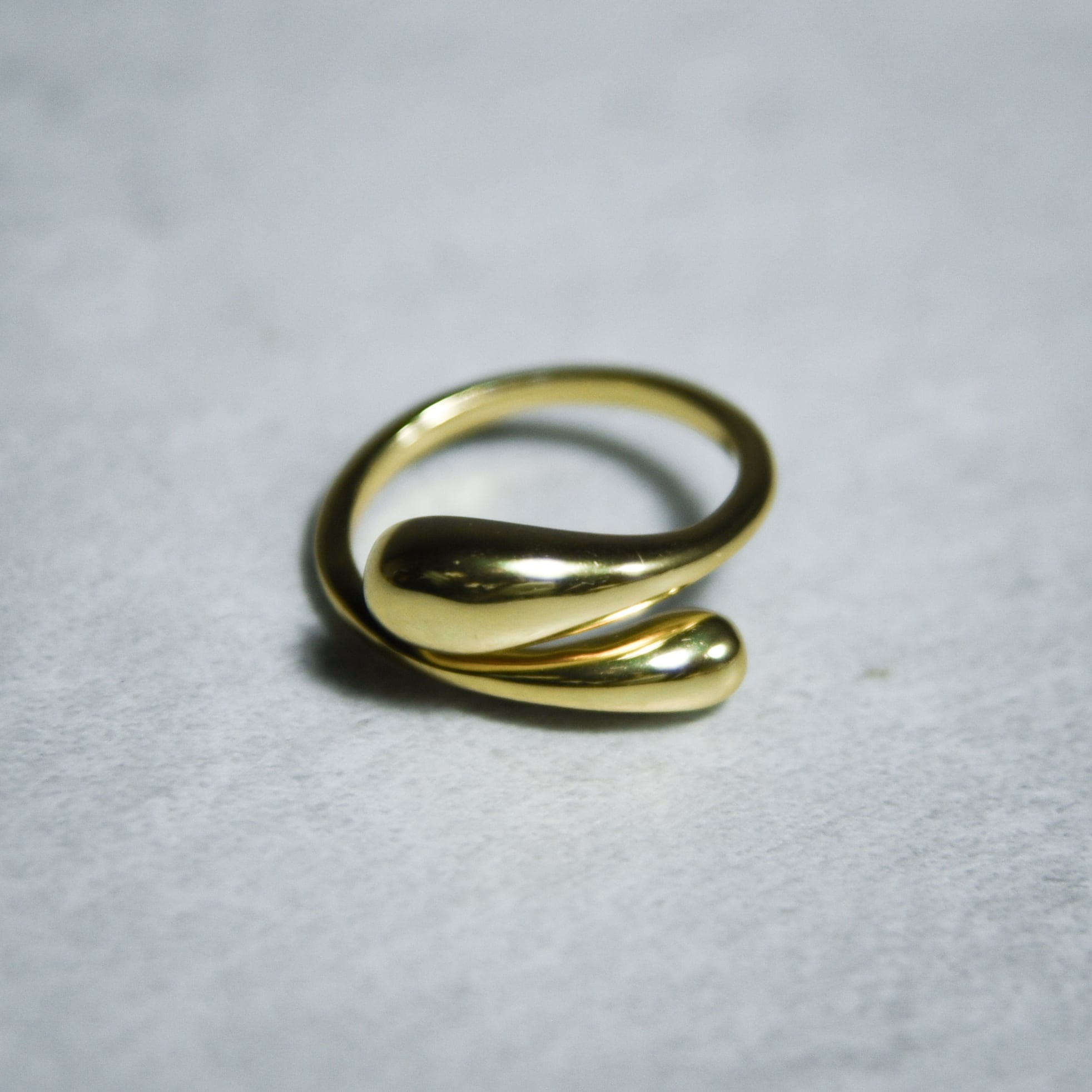 先端に向かってふっくらと膨らむドロップモチーフが対極に配置されていますが、リングアームが指を周回するように重なり合うデザインになっています。