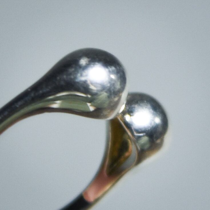 全体的にシルバーの光沢が美しく、先端に向かってふっくらと膨らむドロップ状のモチーフが対極に配置されています。