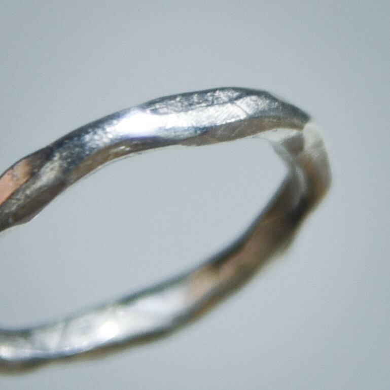 クラフト感のあるハンマード仕上げ特徴のリングで均一な円形ではなく、あえて表面に不規則な凹凸や歪みを残すことで、光の反射が柔らかく分散し、シルバー特有の奥深い輝きを引き出しています。