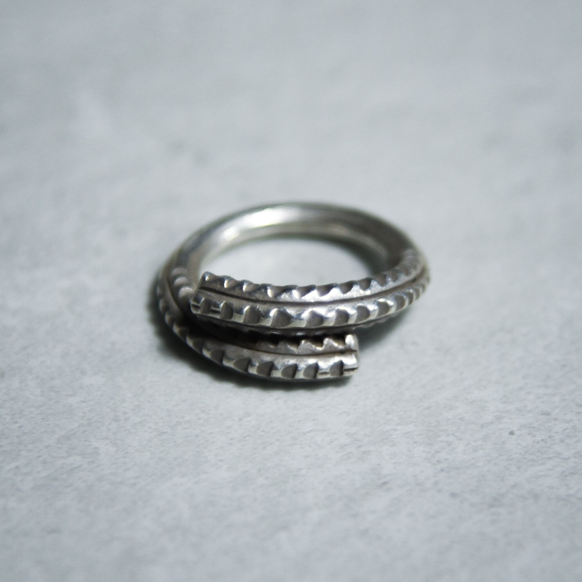 一本の地金を螺旋状に重ねたスパイラルデザインで、魚の骨のような有機的なモチーフの特徴のリング。