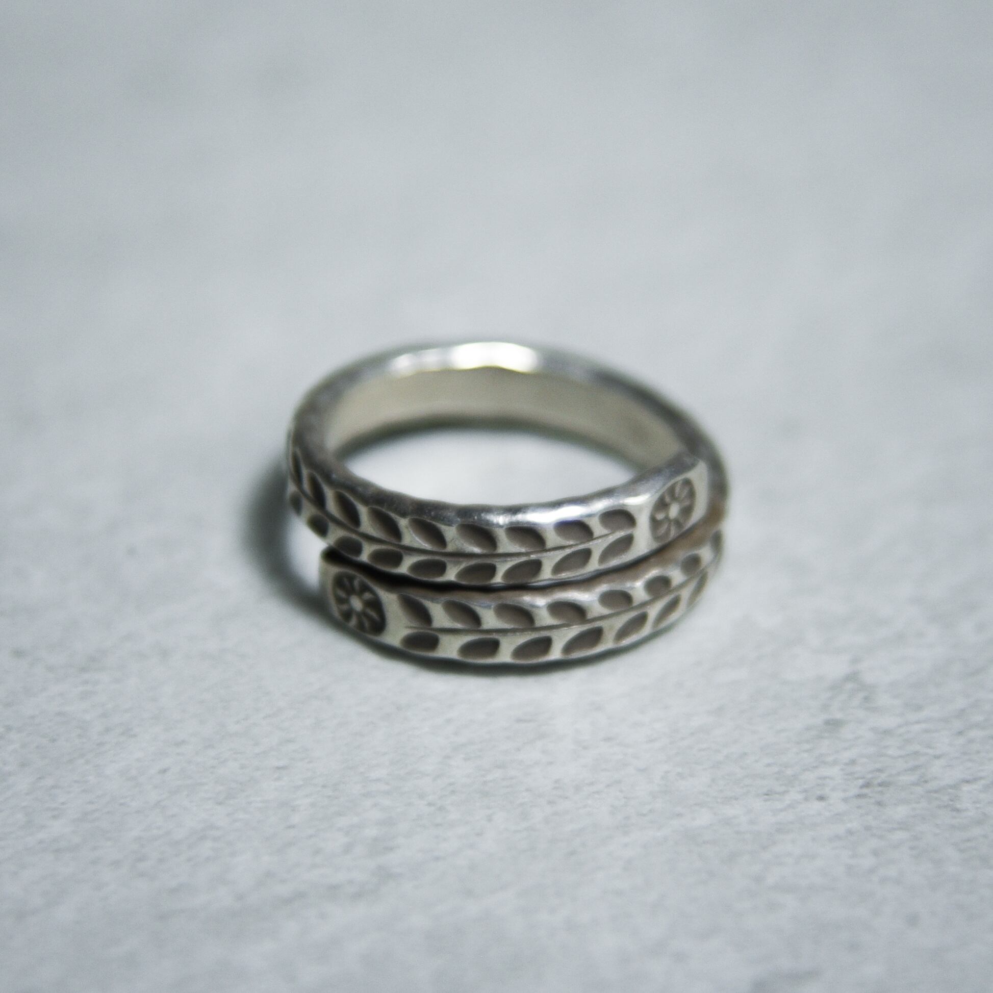 このリングは、一本の地金を螺旋状に二重に巻き付けた、スパイラルデザインが特徴です。