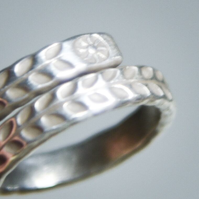 二重に重なることで指元に程よいボリューム感が生まれ、自然をモチーフにしたクラフト感あふれる温かみと、無骨でアーティスティックな表情を併せ持ったデザインです。