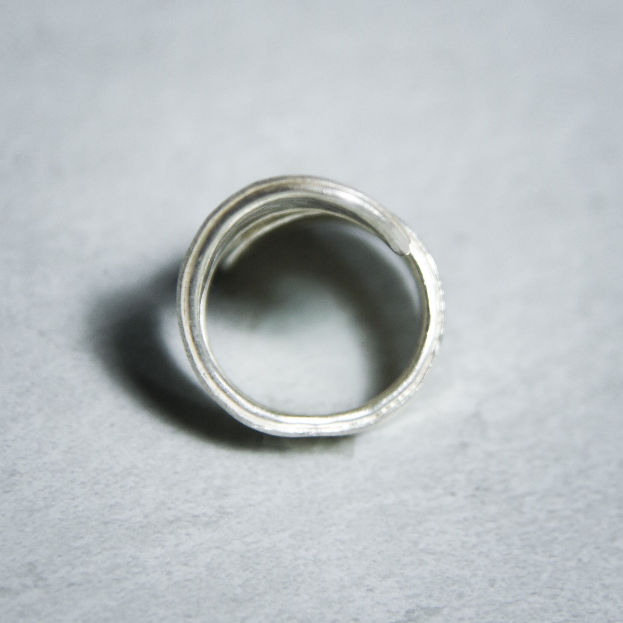 素材の存在感と彫刻的な造形が融合した、プリミティブな雰囲気とミニマルが同居した存在感を放つリングです。