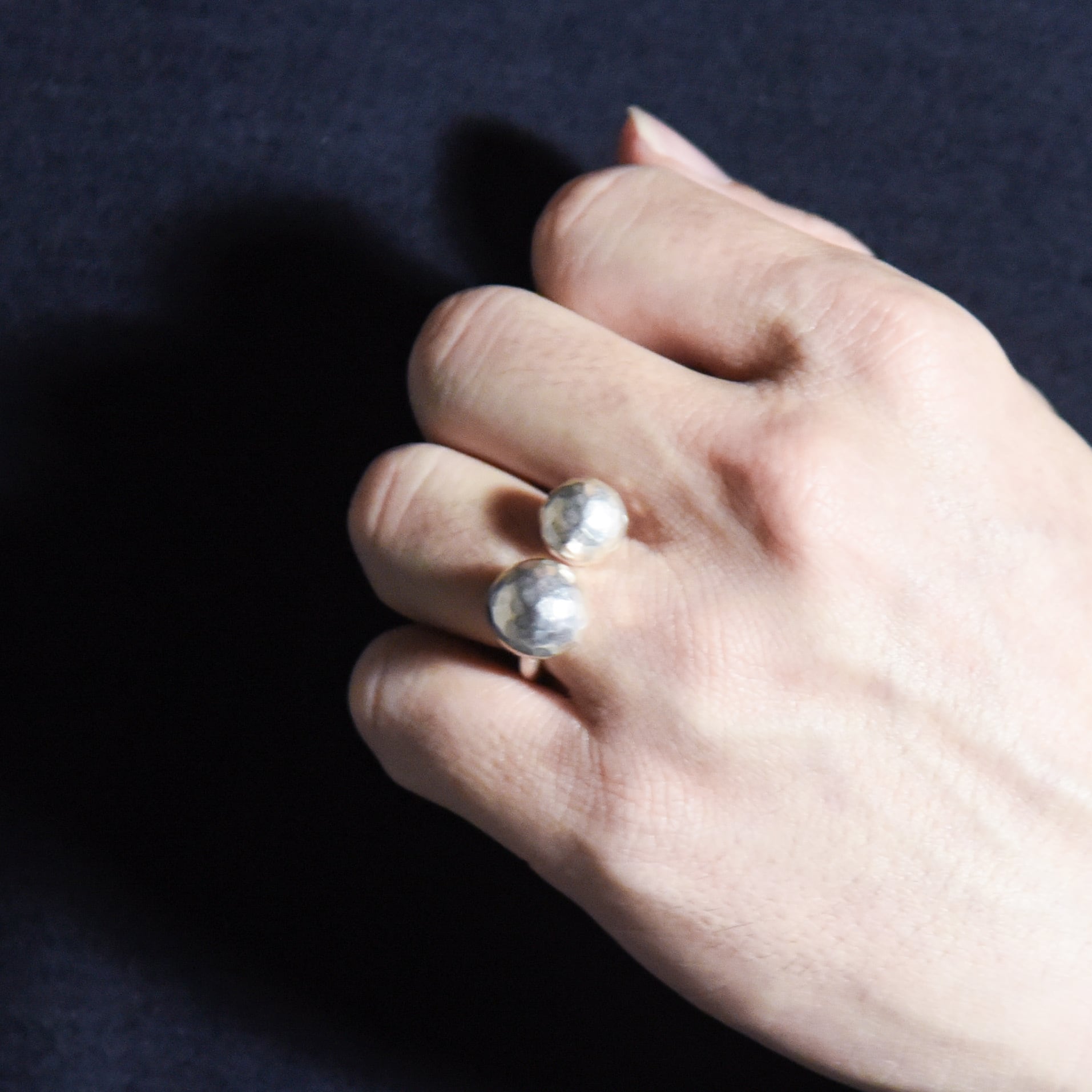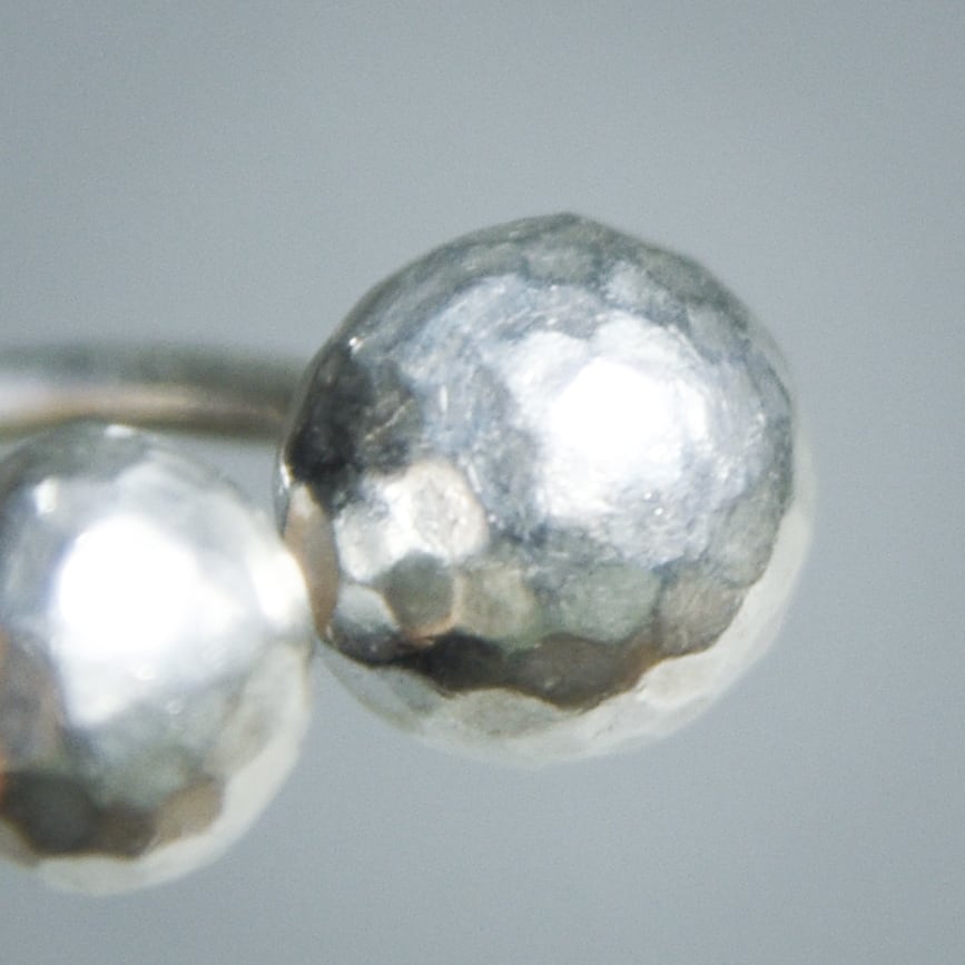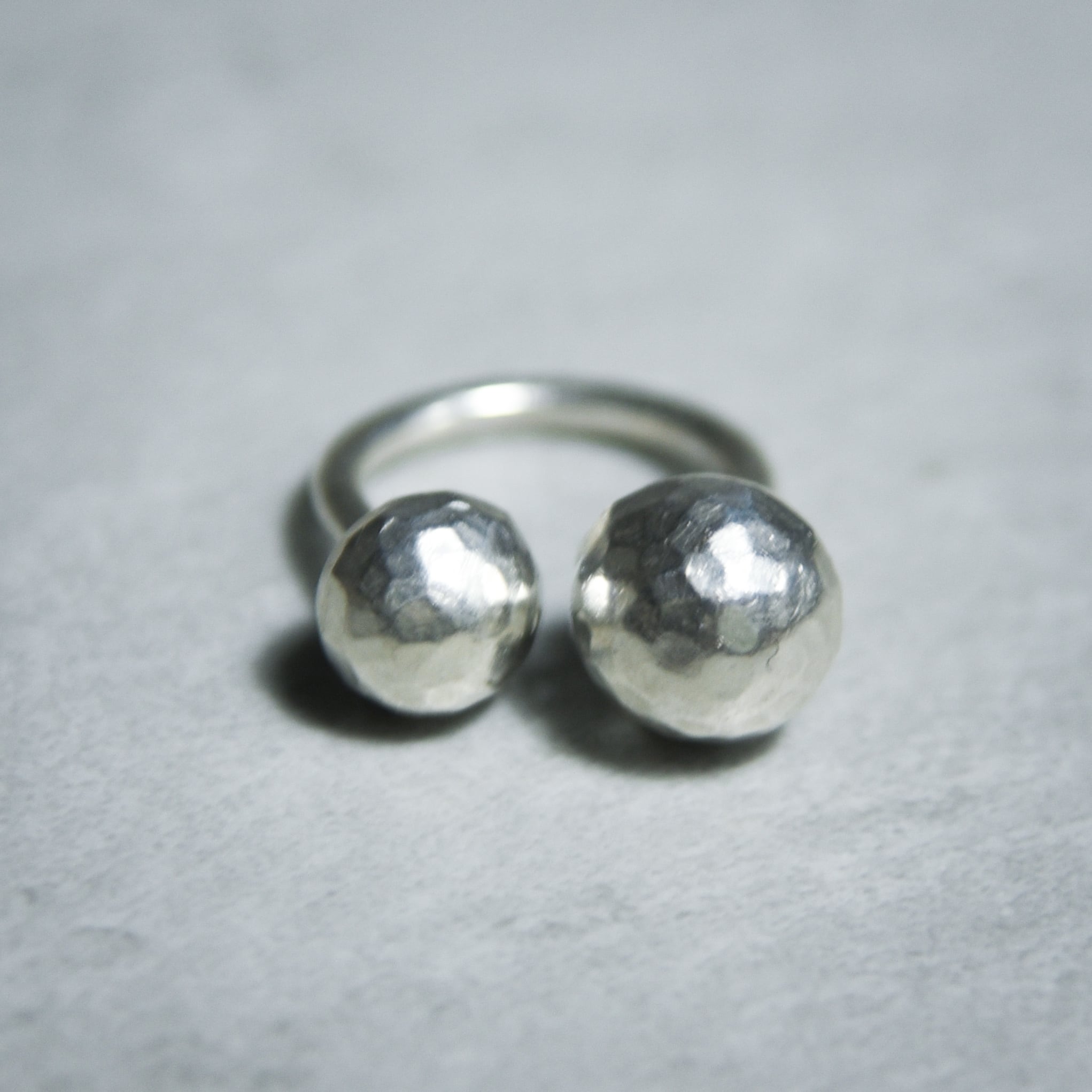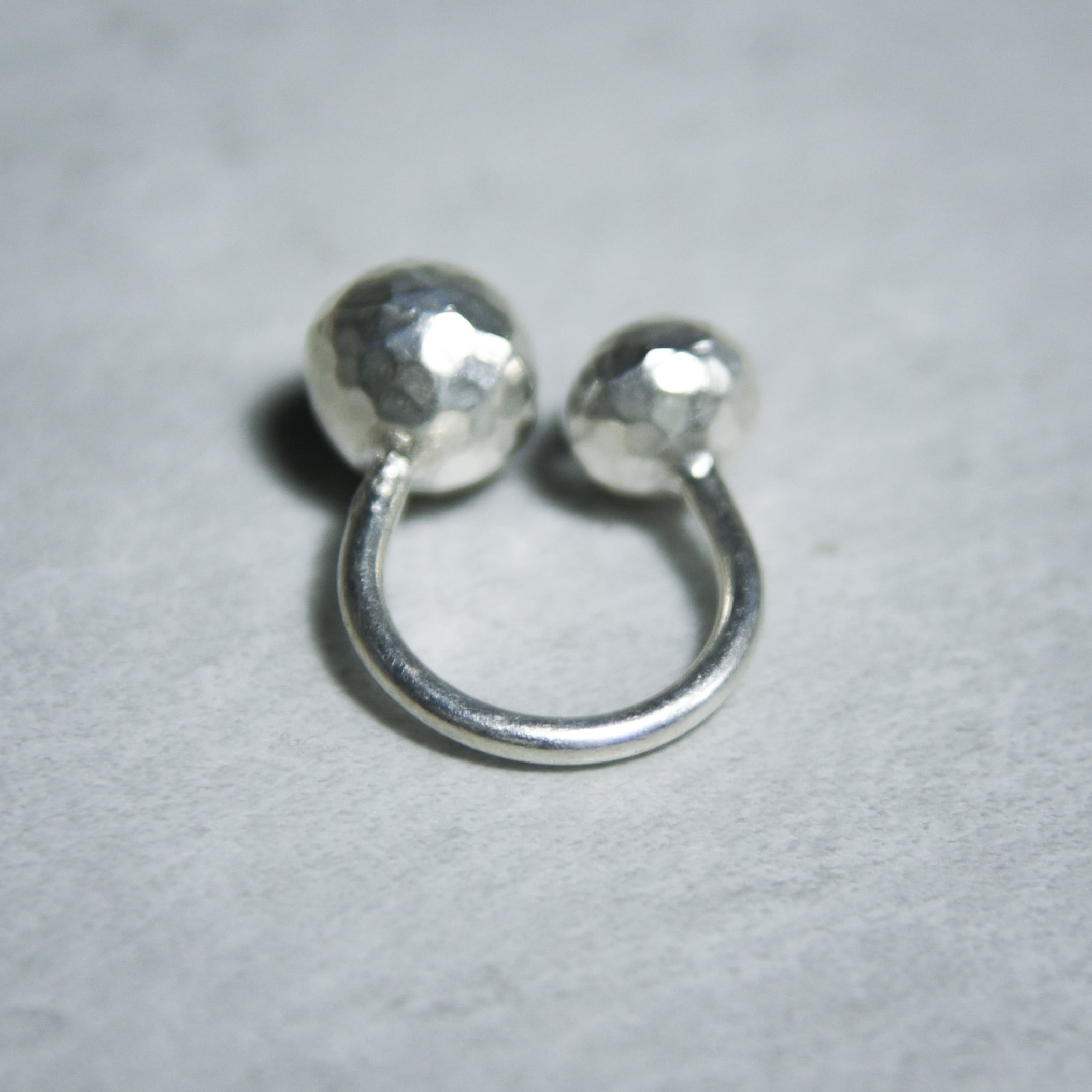 このリングは、大小異なる二つの球体を対角に配置したフォークリング(オープンリング)デザインです。