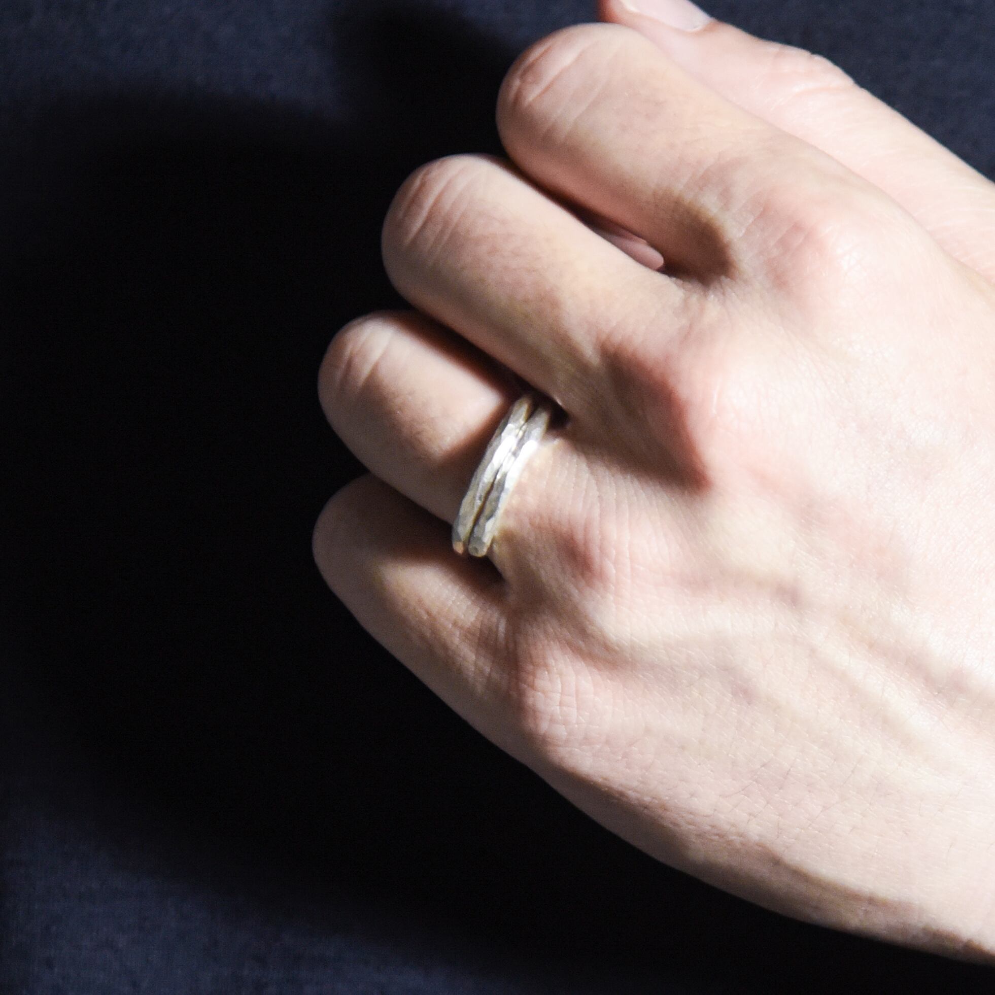 立体的なボリューム感: シンプルな一本のリングよりも奥行きがあり、手元に程よい存在感を与えます。