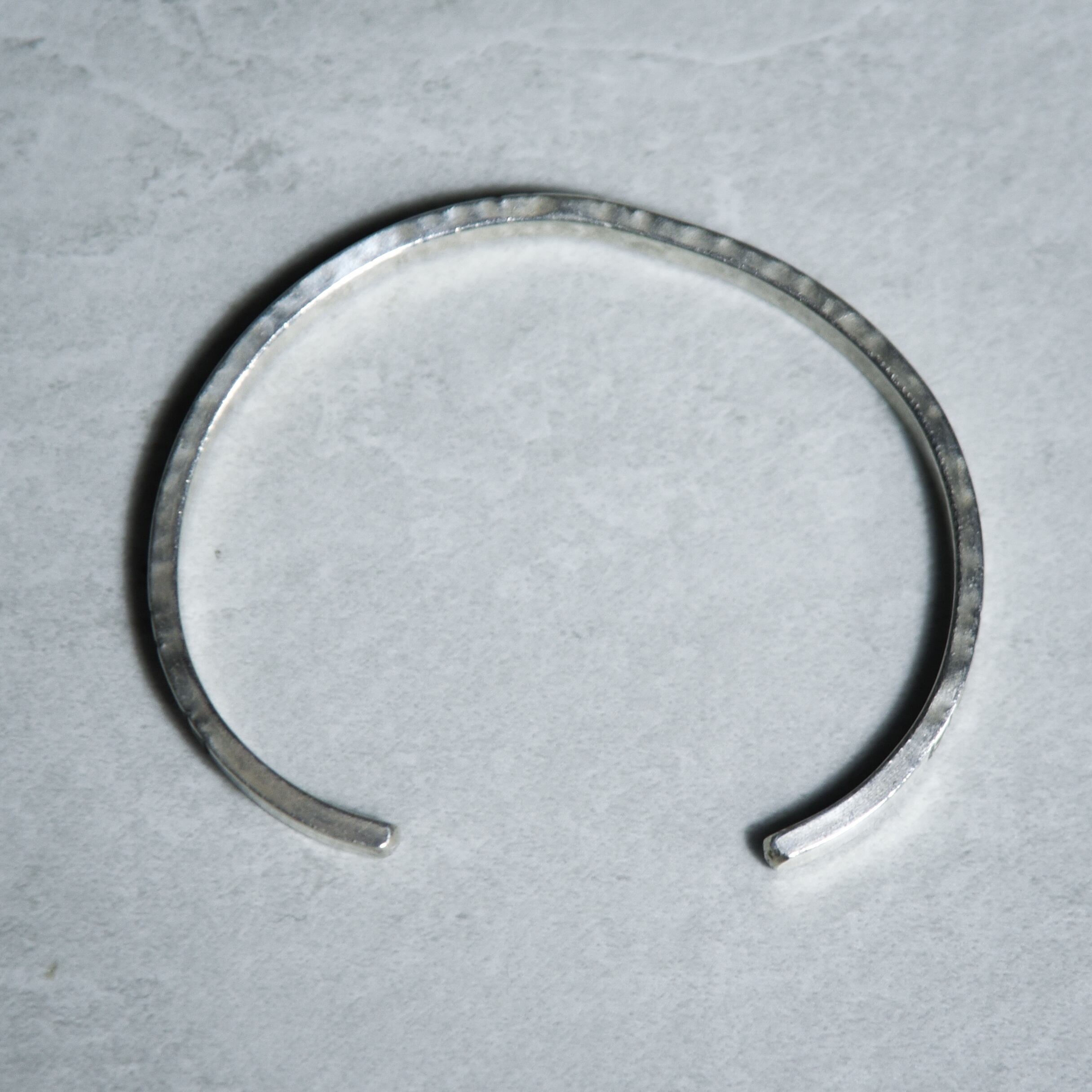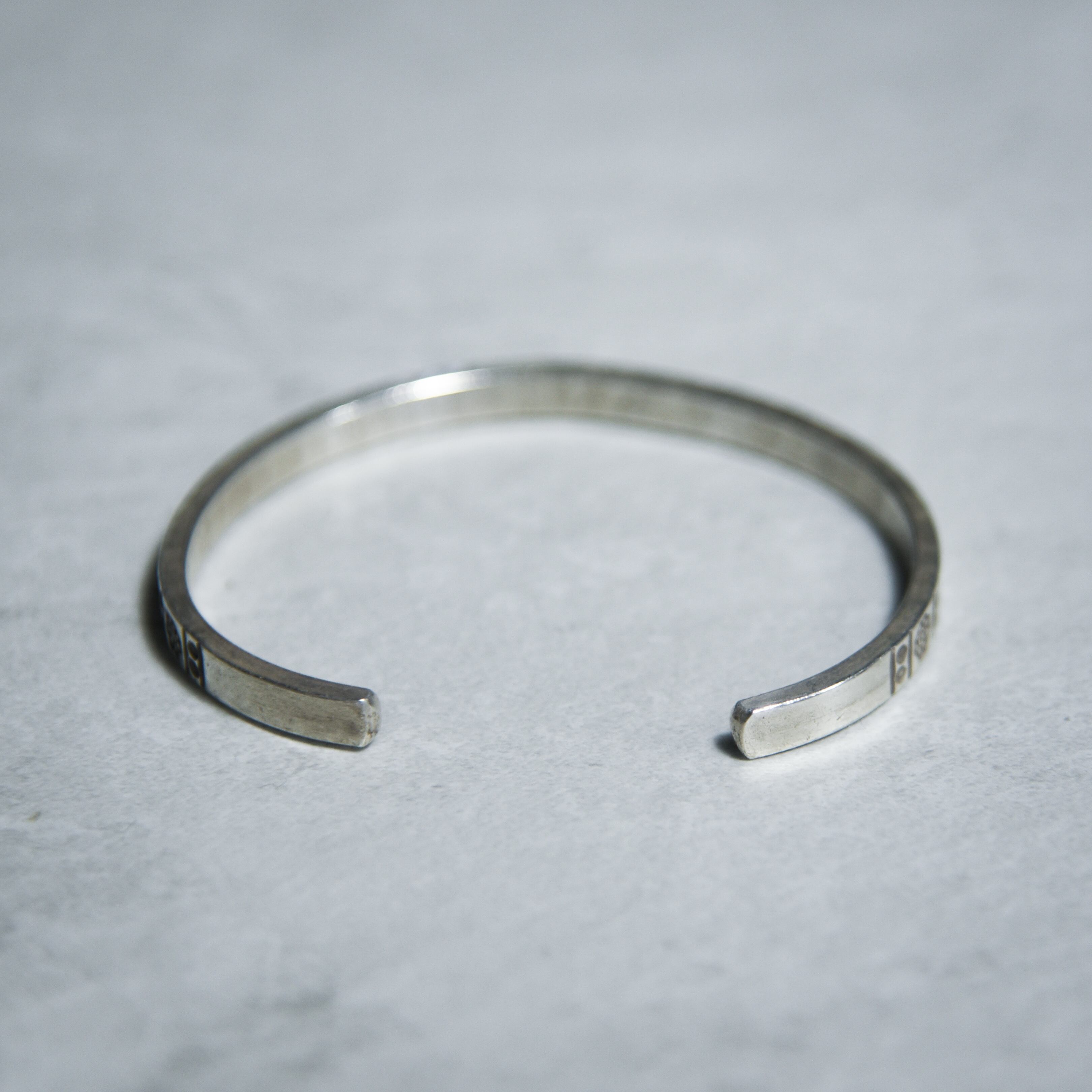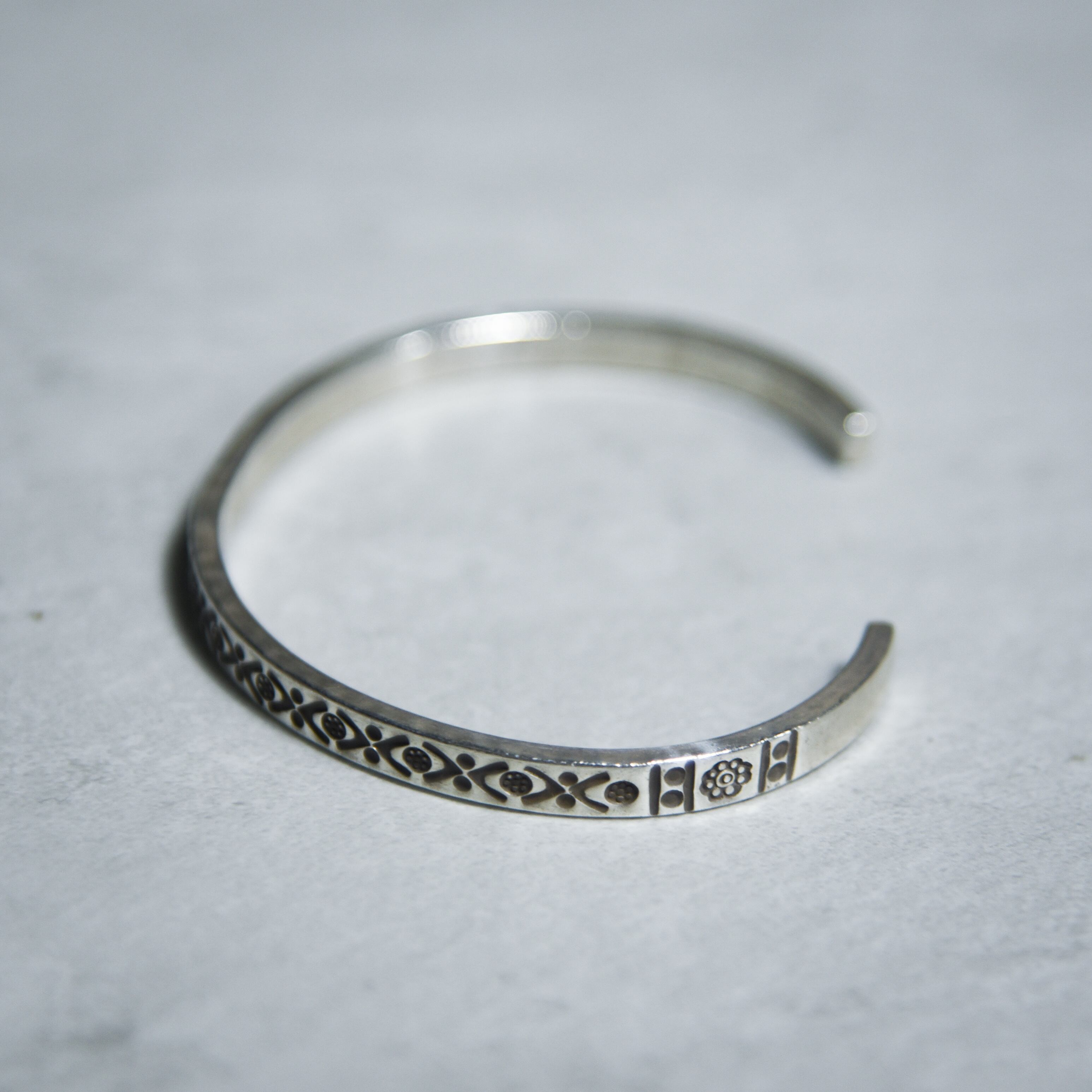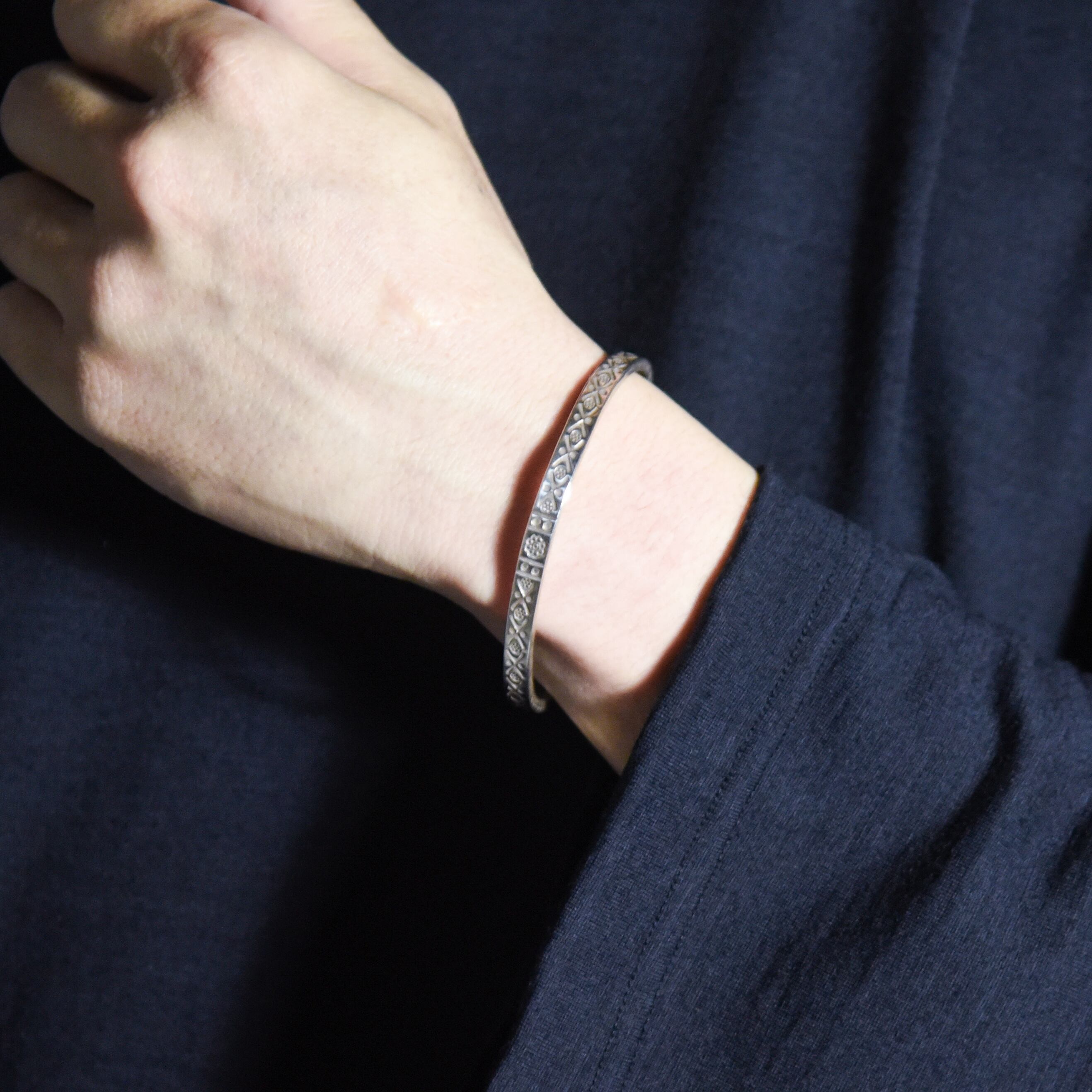 平打ちタイプは知的で落ち着いた印象があり緻密なスタンプを整列させたデザインはカジュアルはもちろん、ジャケットスタイルなどのクリーンな装いにも溶け込む、端正な顔立ちのバングルです。