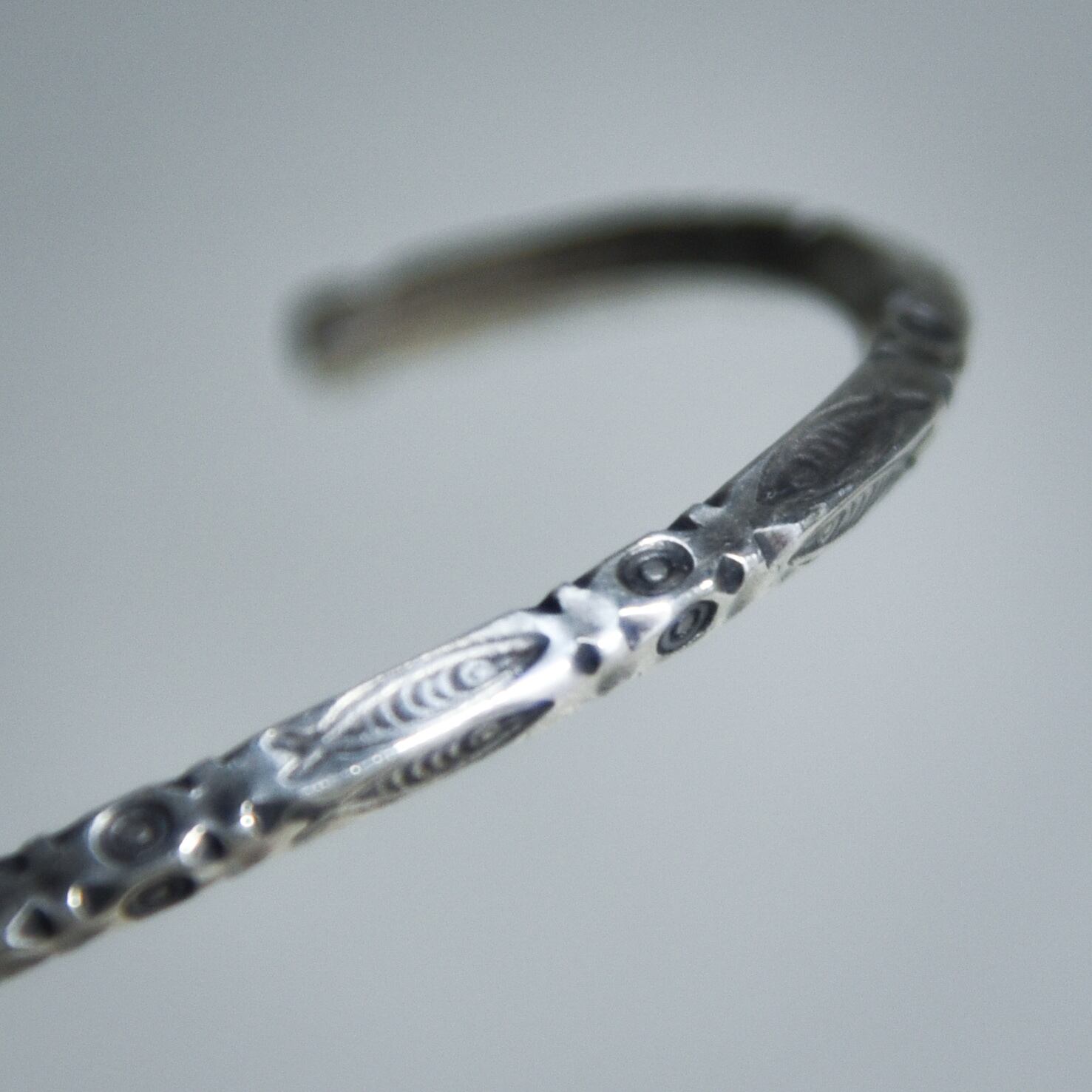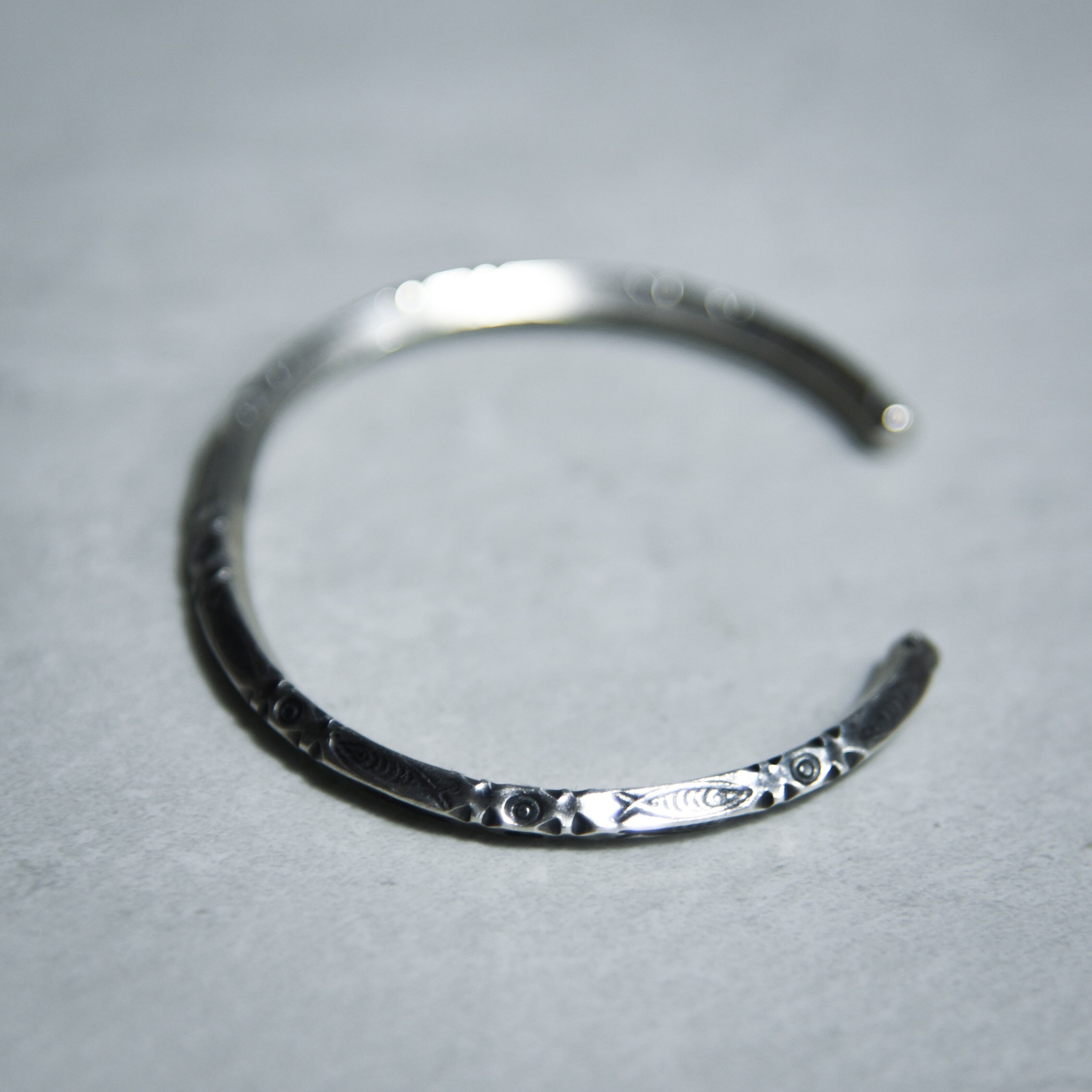 表面に施されたモチーフは、職人がタガネを使い、一つひとつ手作業で打ち込んだスタンプワークによる今回のシリーズの象徴的なバングル。