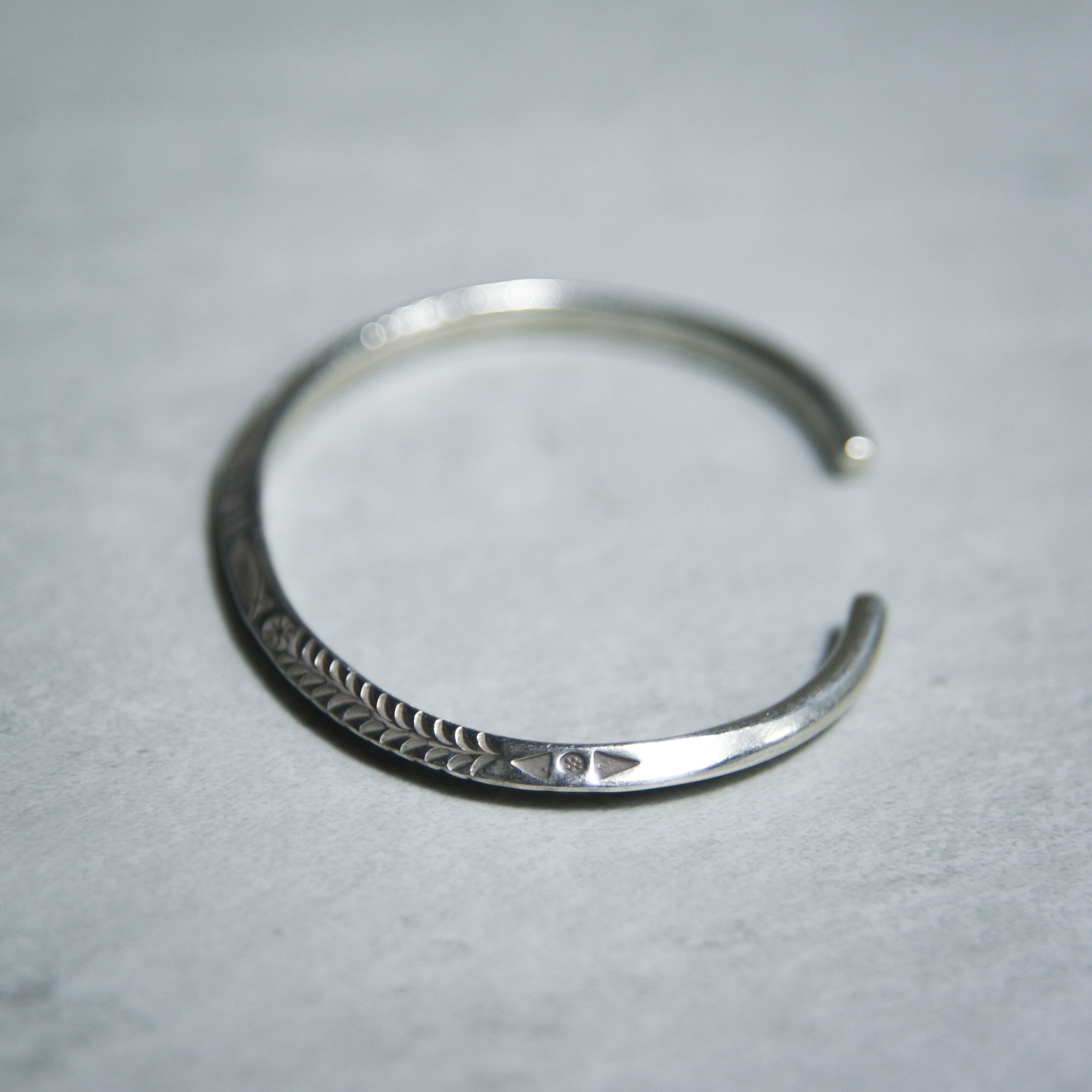 表面に施されたモチーフは、職人がタガネを使い、一つひとつ手作業で打ち込んだスタンプワークによる今回のシリーズの象徴的なバングル。
