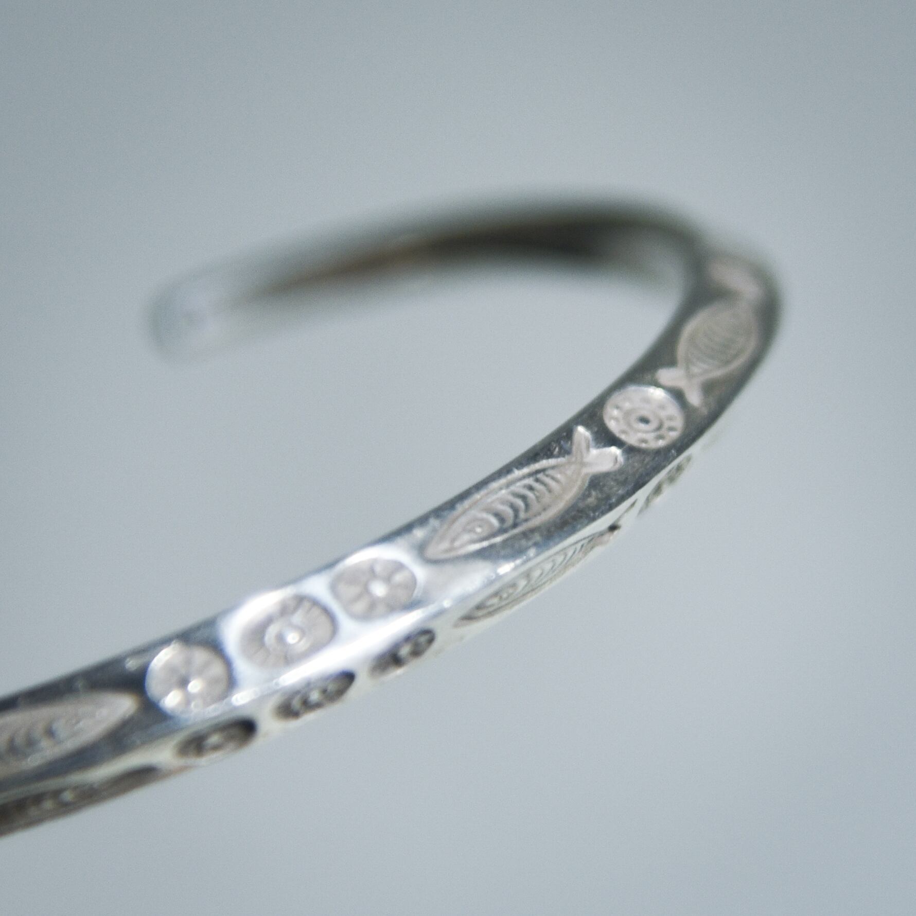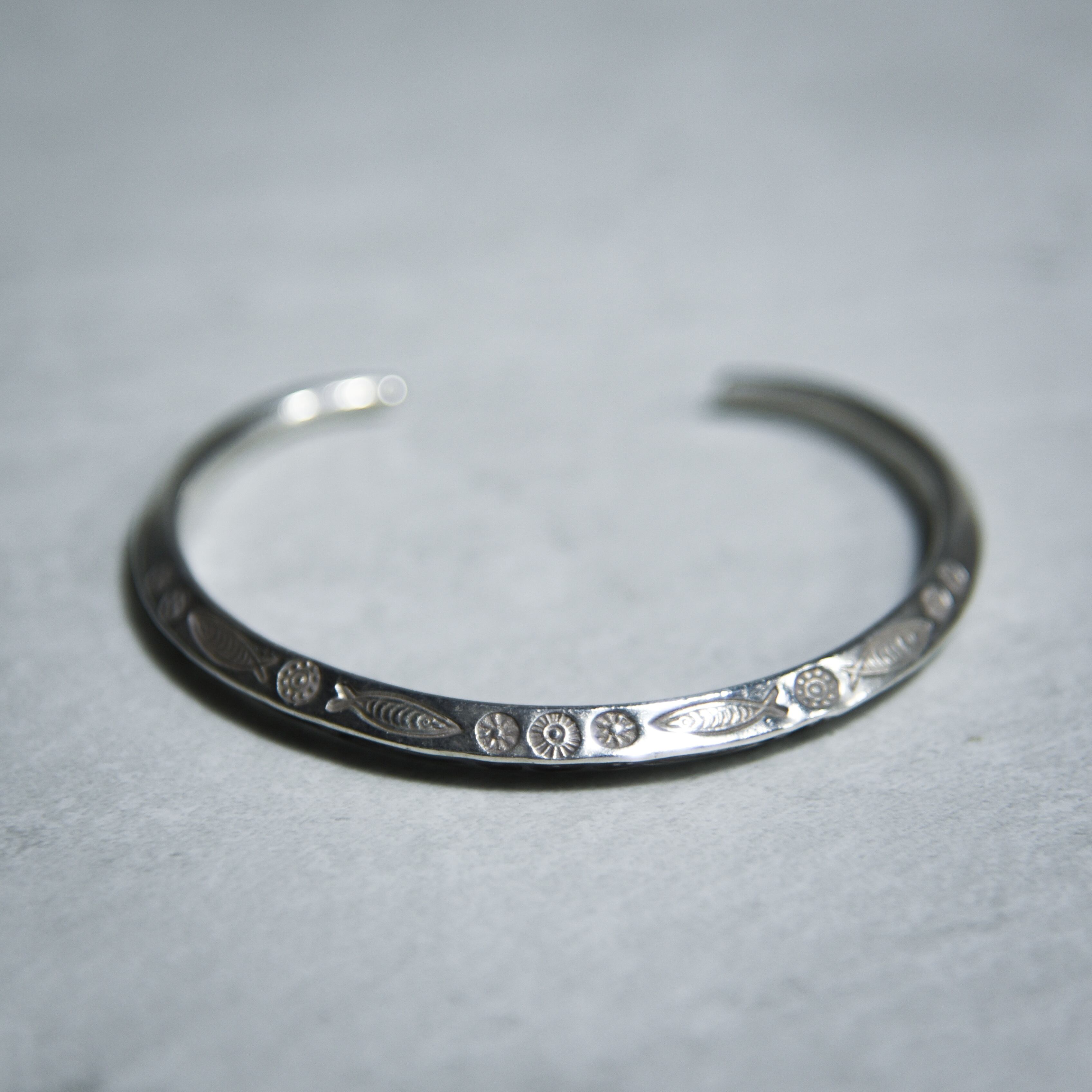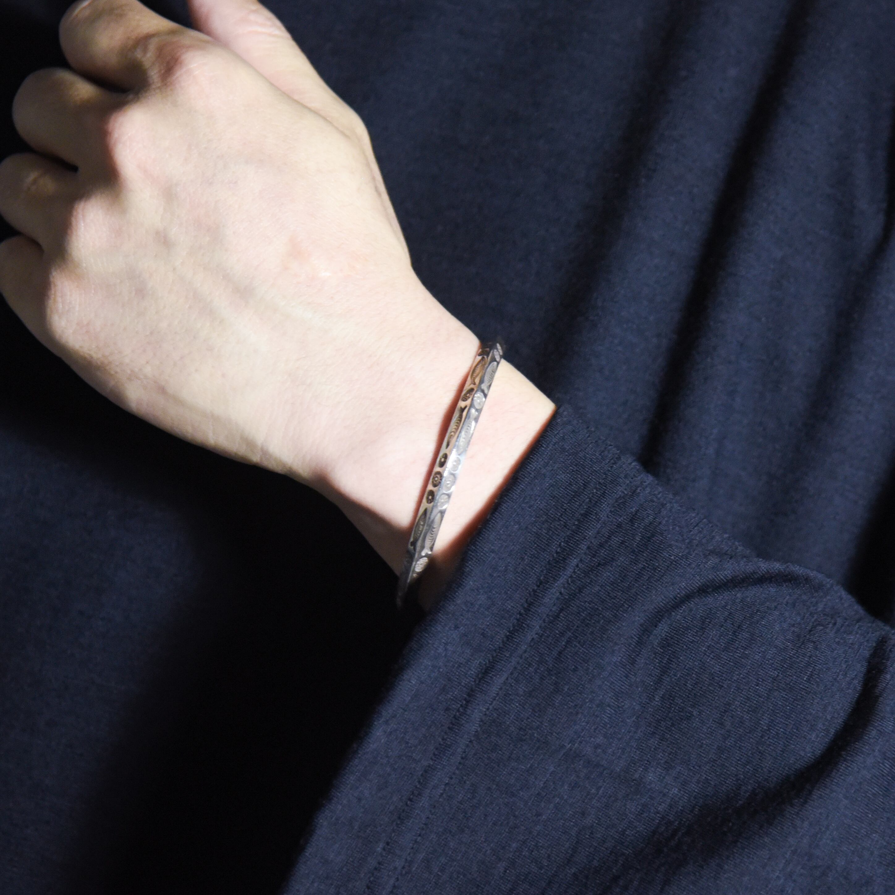 表面に施されたモチーフは、職人がタガネを使い、一つひとつ手作業で打ち込んだスタンプワークによる今回のシリーズの象徴的なバングル。