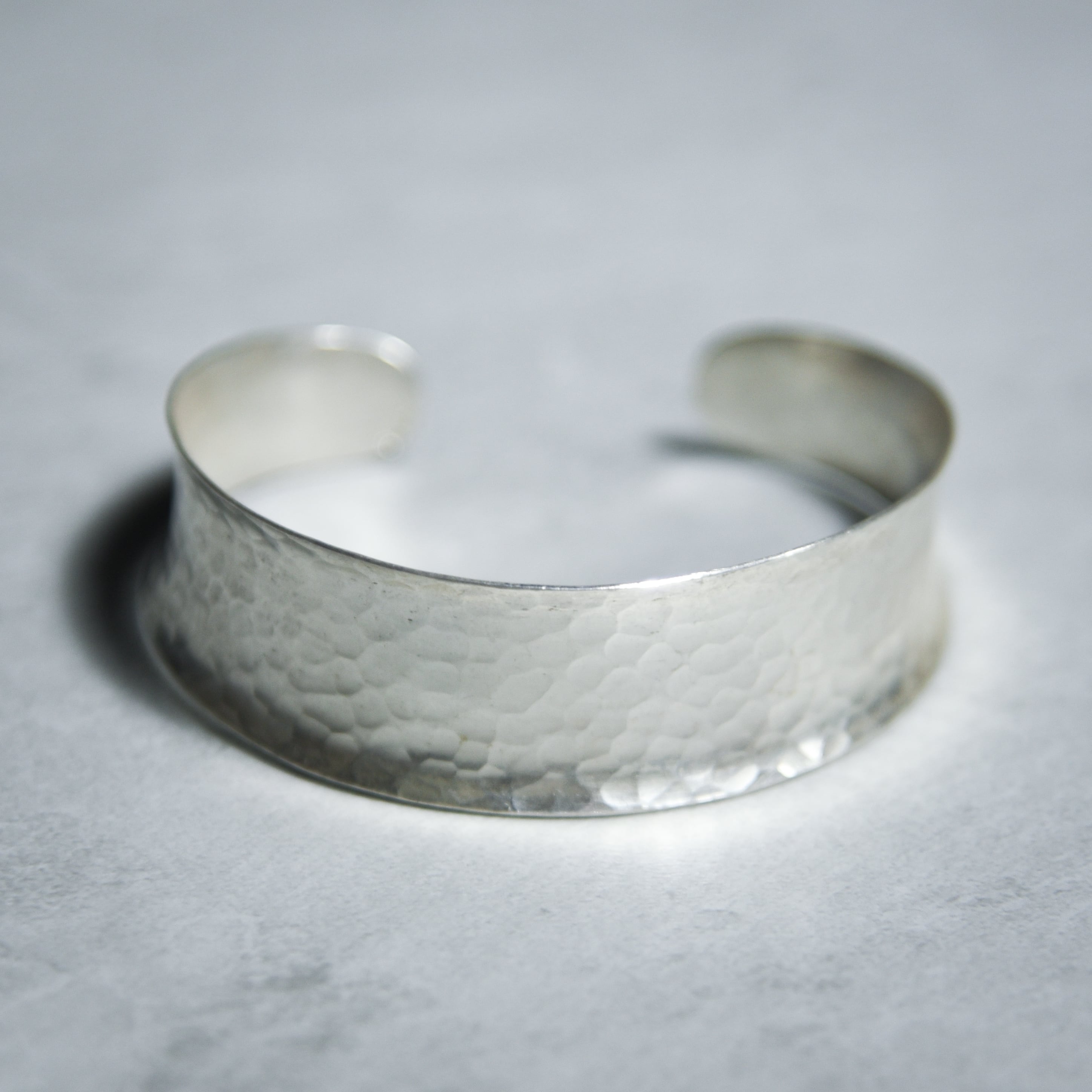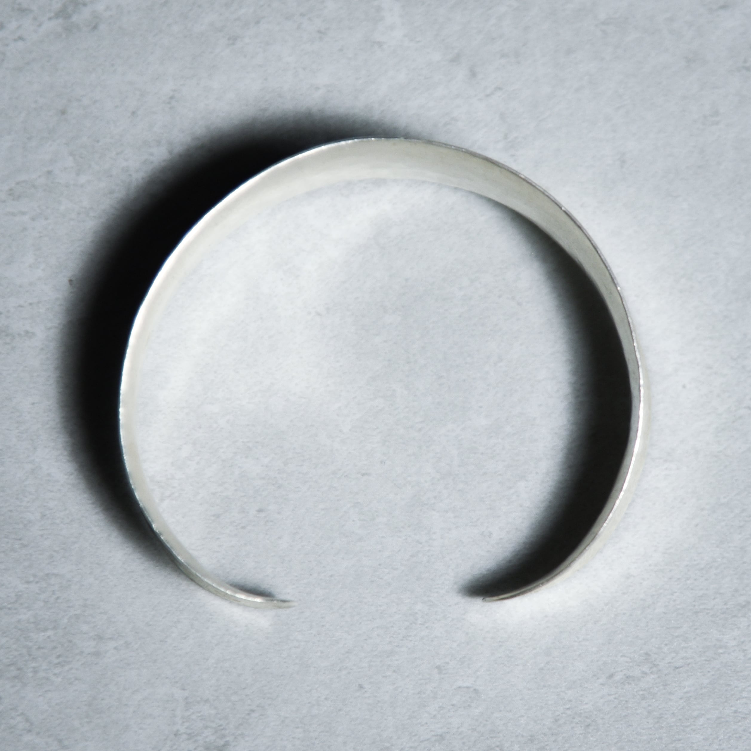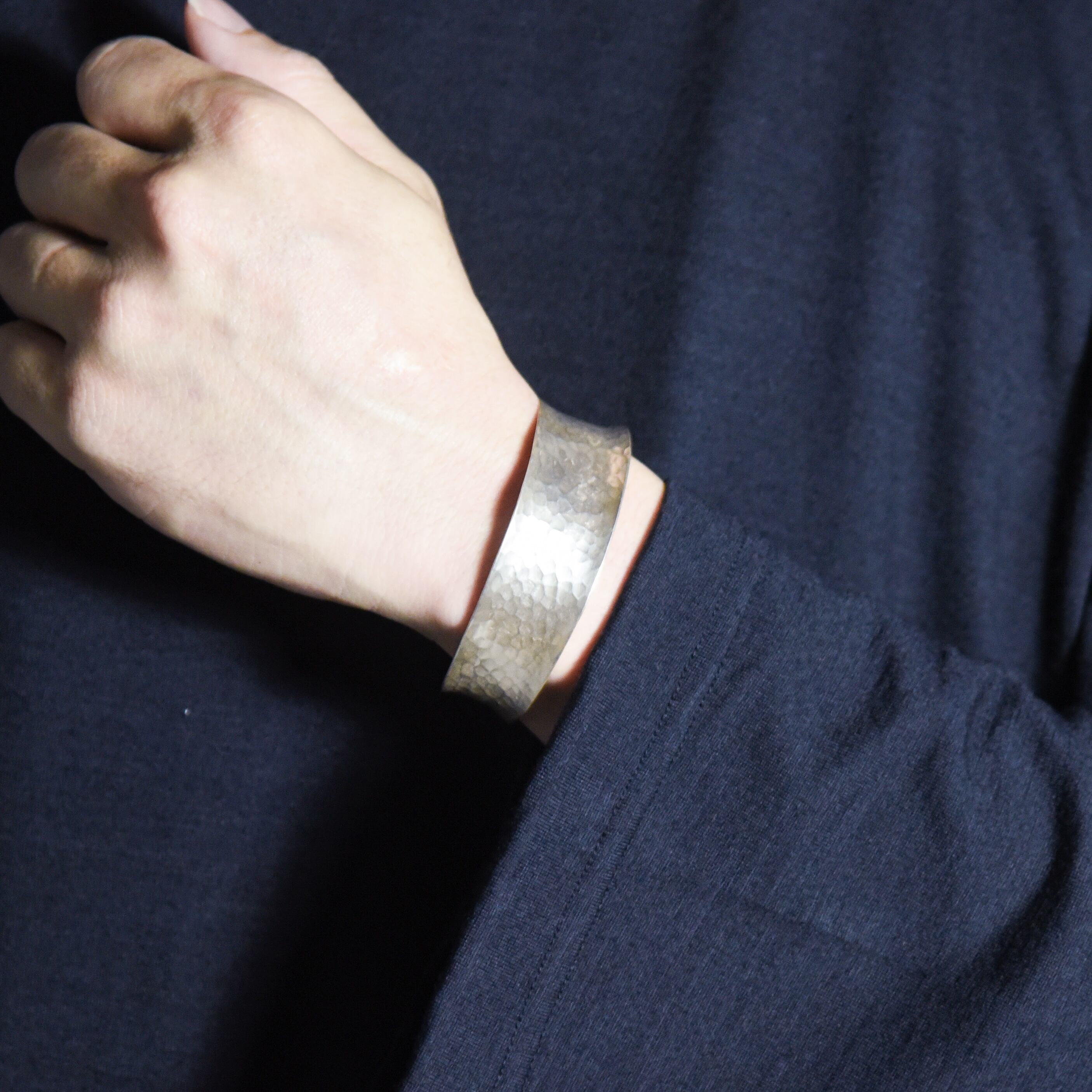 中央が少しくびれ、上下の縁に向かって緩やかに広がっていくフォルムで平面的なバングルに比べて、手首に装着した際に非常に立体的な印象に。