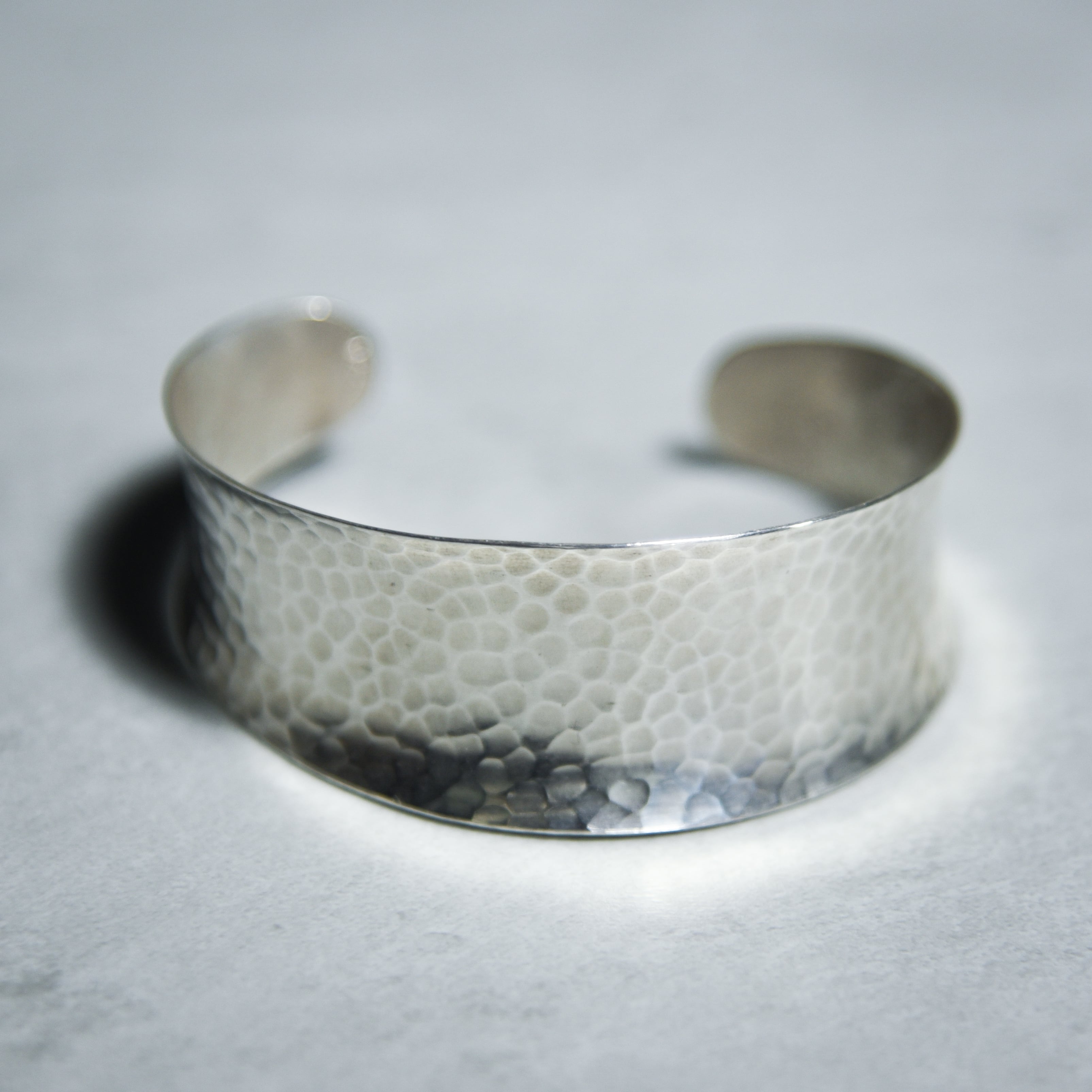 中央が少しくびれ、上下の縁に向かって緩やかに広がっていくフォルムで平面的なバングルに比べて、手首に装着した際に非常に立体的な印象に。