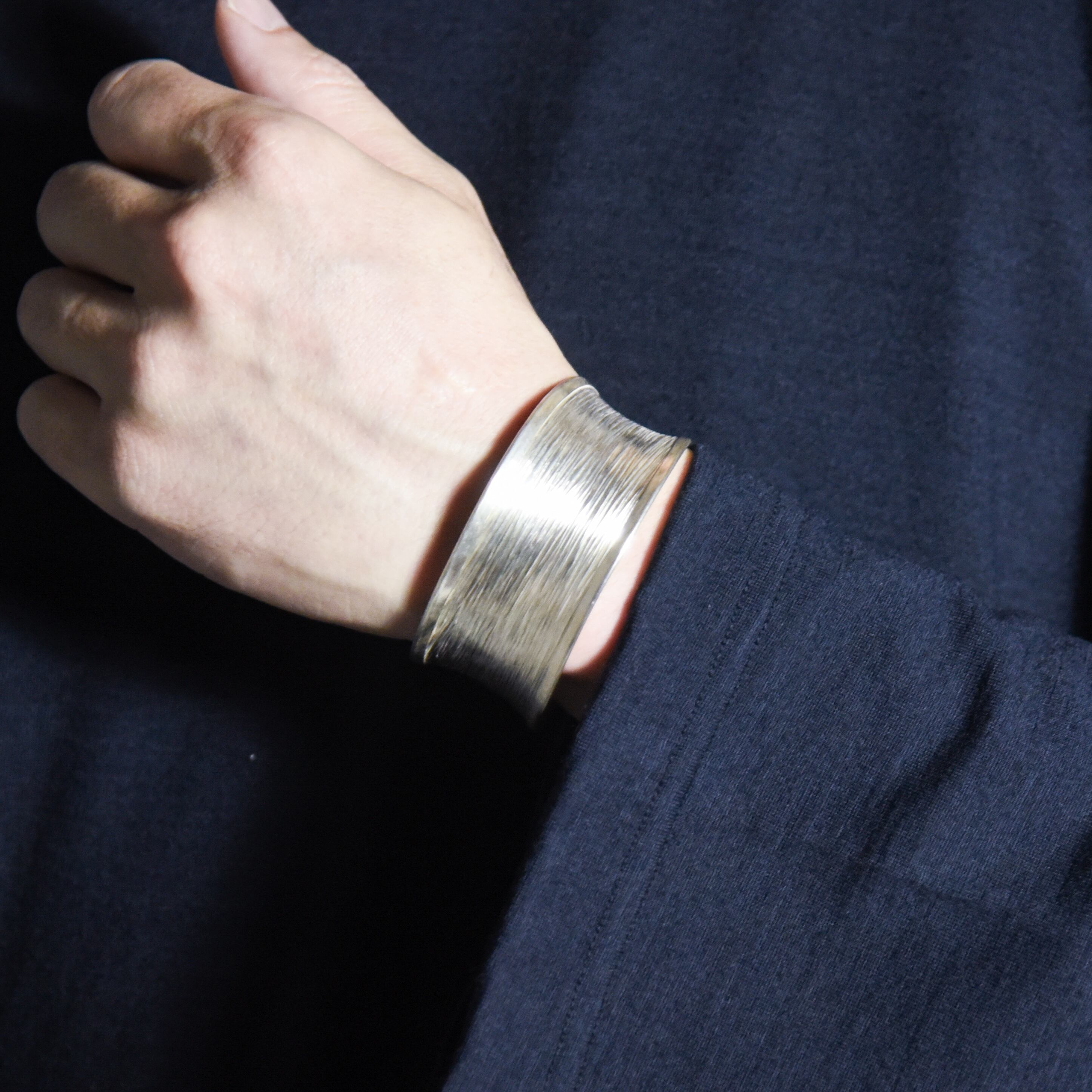 中央が少しくびれ、上下の縁に向かって緩やかに広がっていくフォルムで平面的なバングルに比べて、手首に装着した際に非常に立体的な印象に。