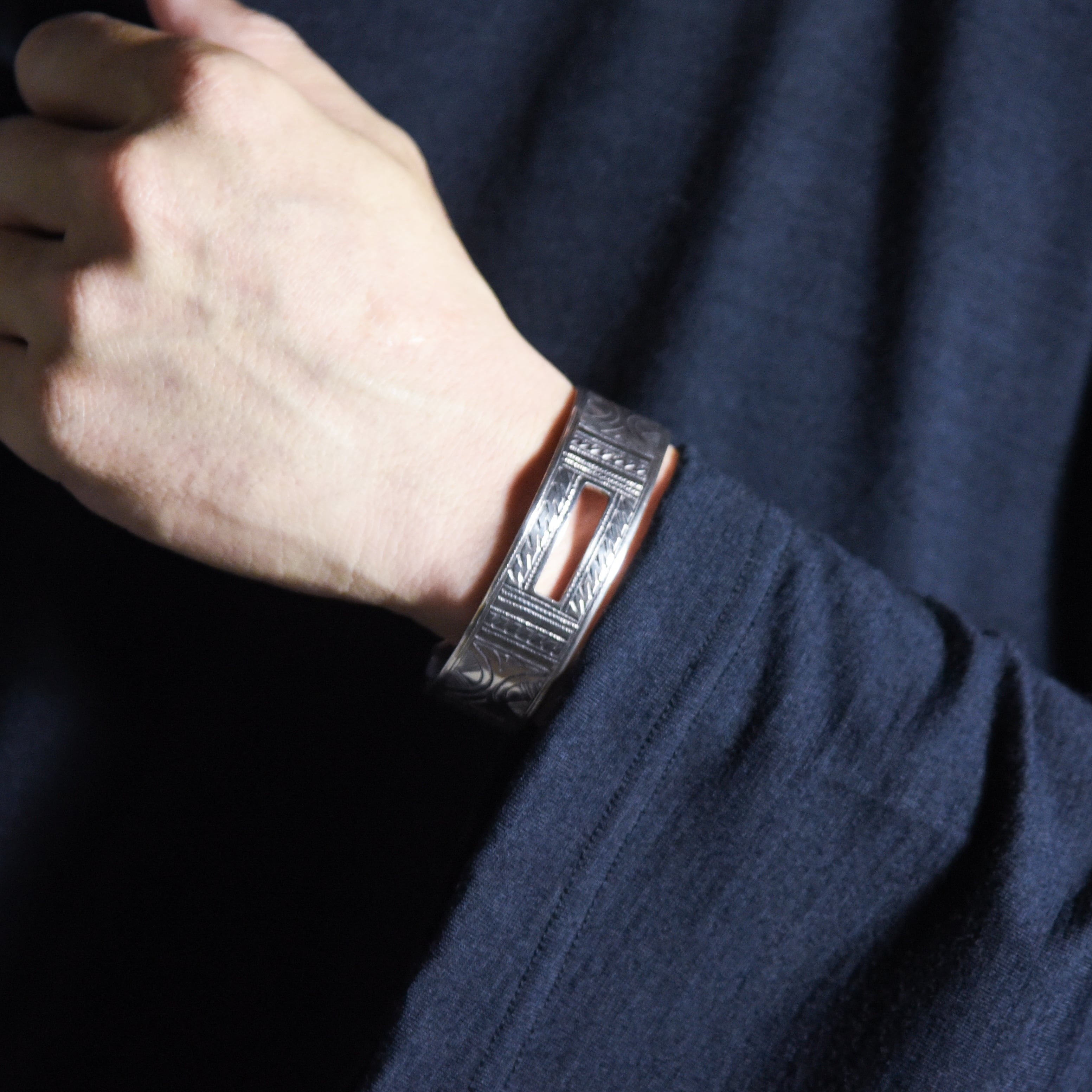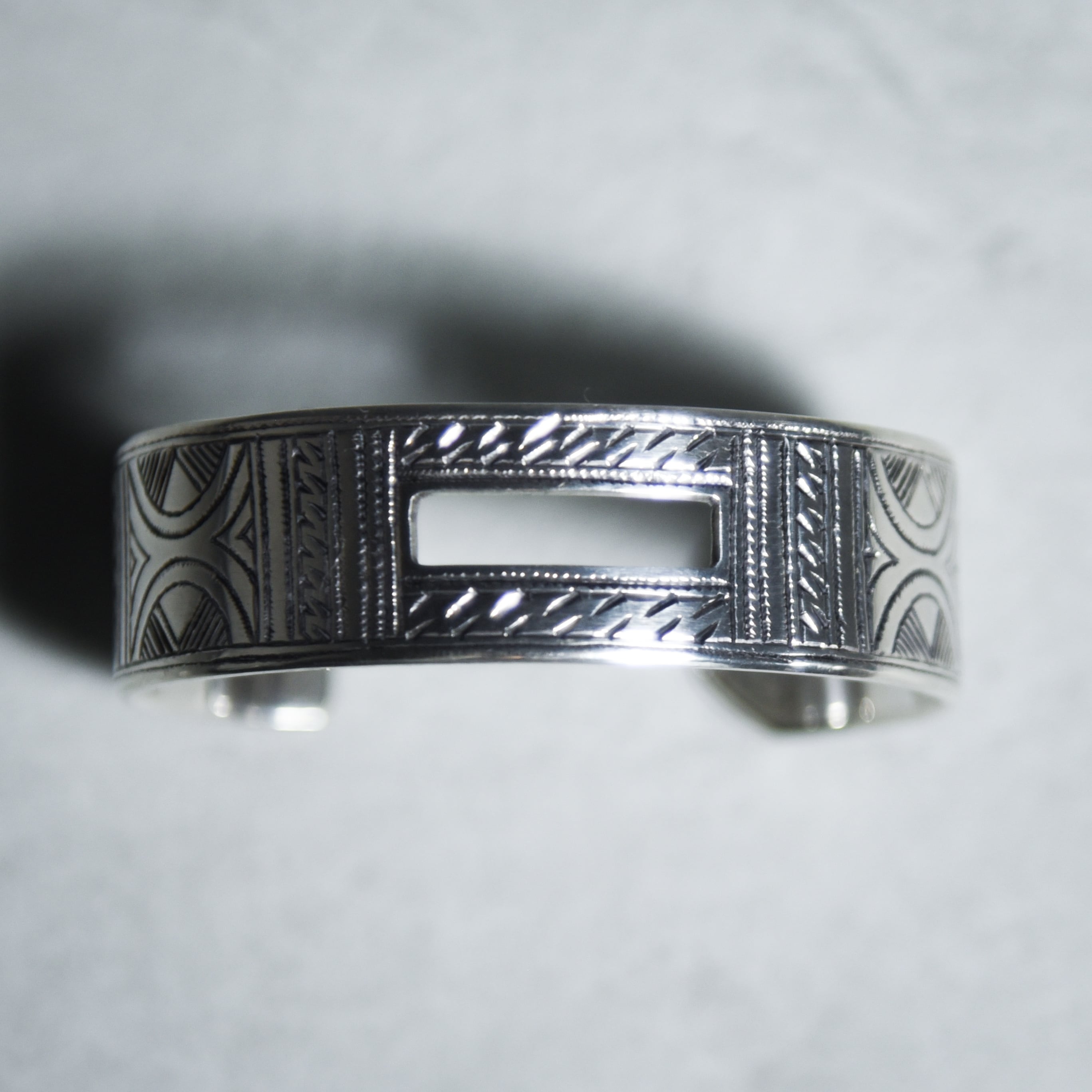 こちらのアイテムは中央に長方形の空間を取った、トゥアレグらしい正統派なデザインながら、左右のエンド部分の形状がアシンメトリーなさりげないユニークさも魅力。