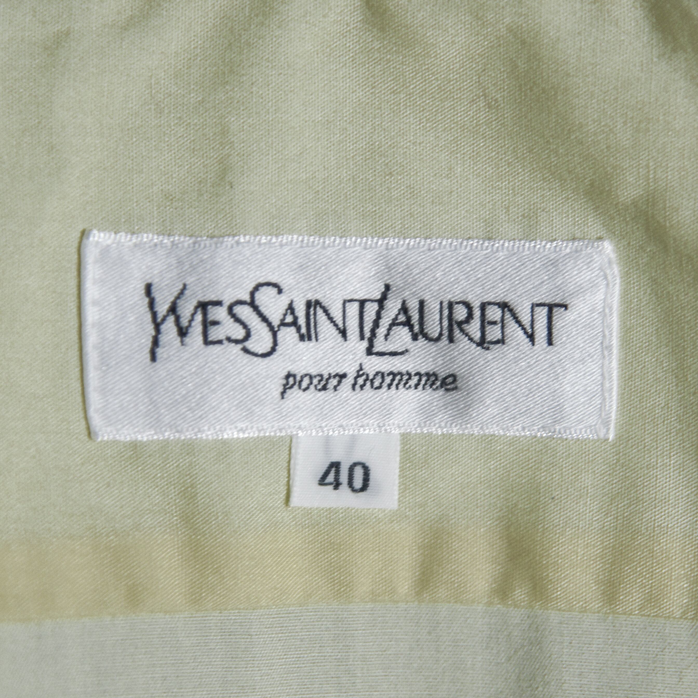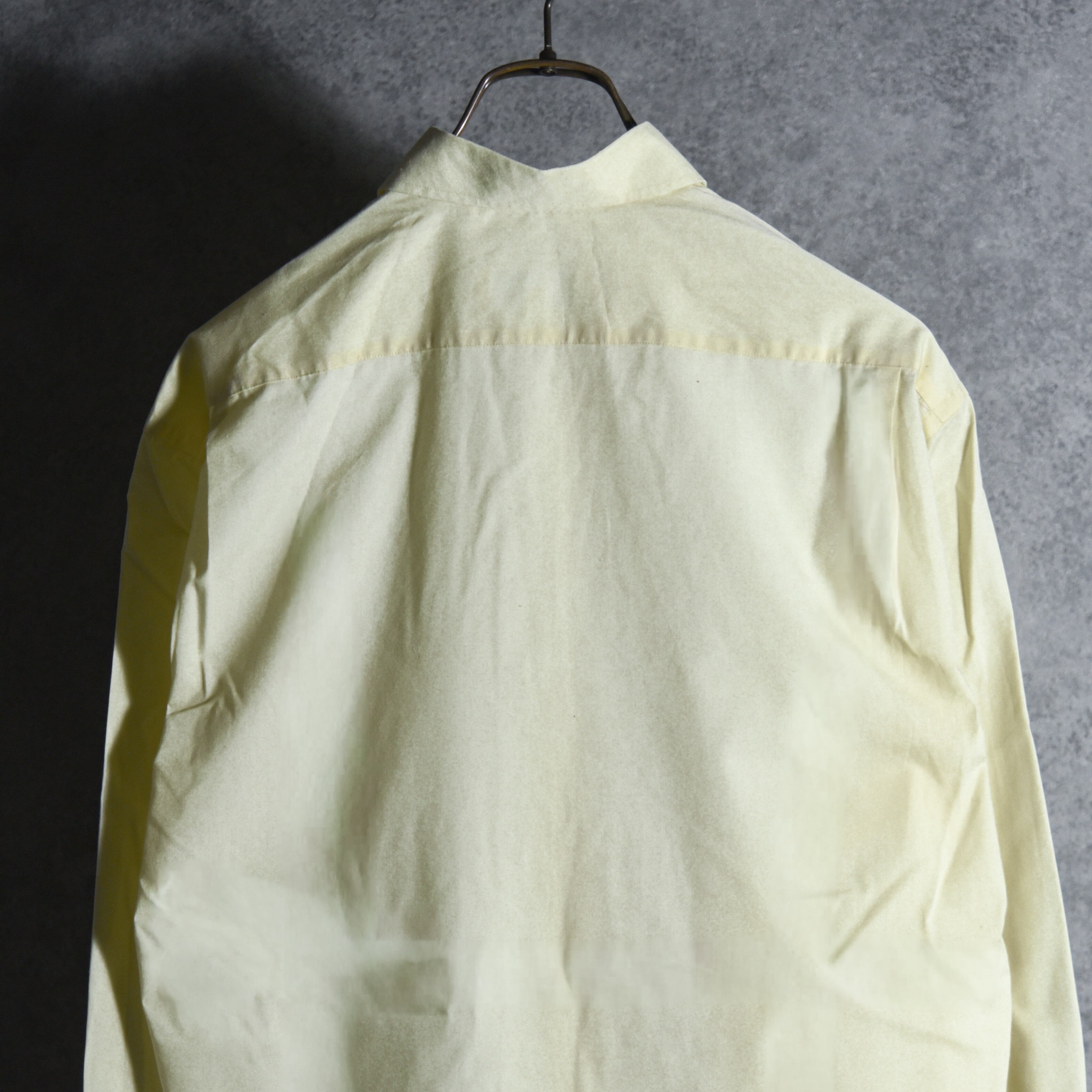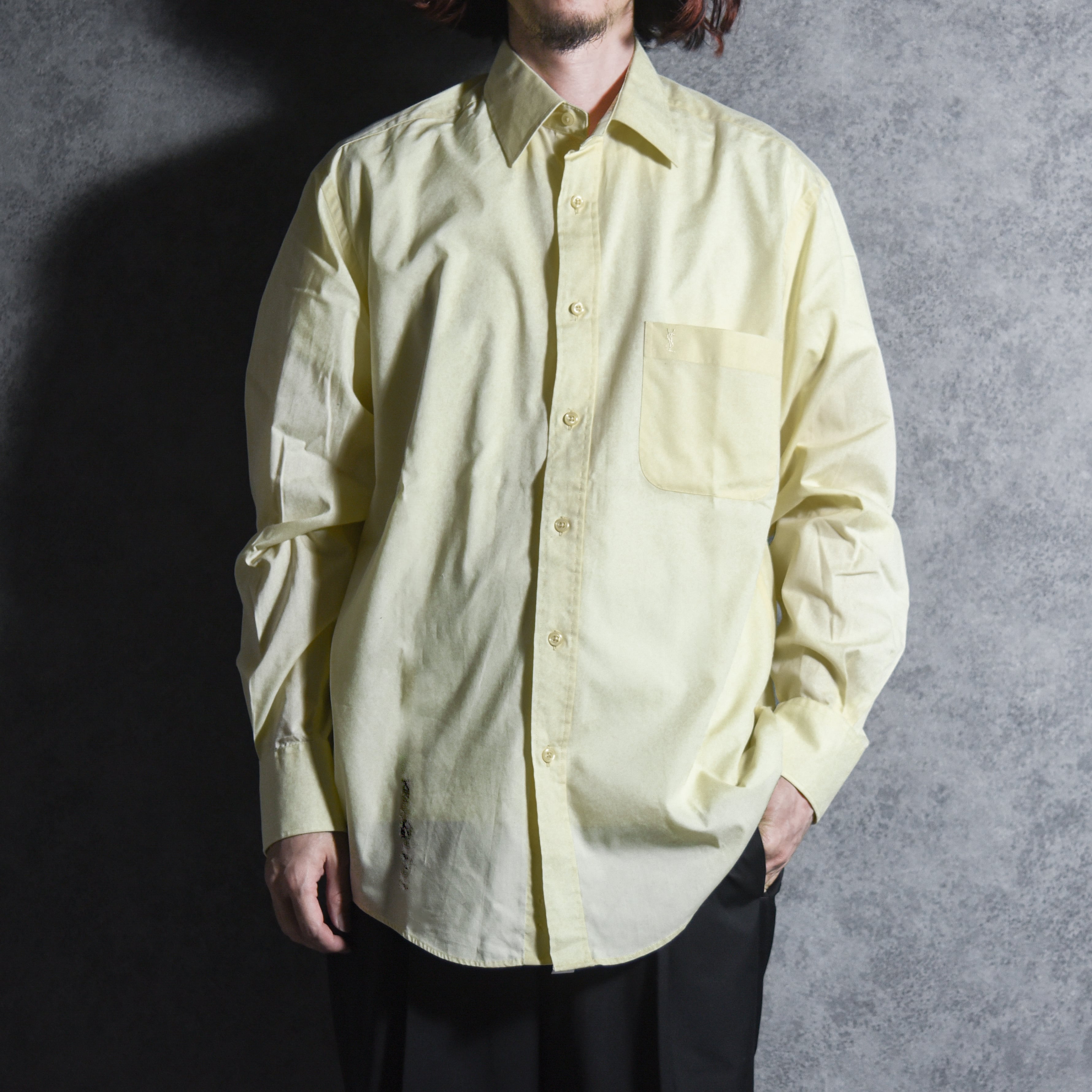 柔らかなペールイエロー、胸ポケット、スタンダードなレギュラーカラーとシンプルで、当時のサンローランらしい都会的で洗練されたシルエット。