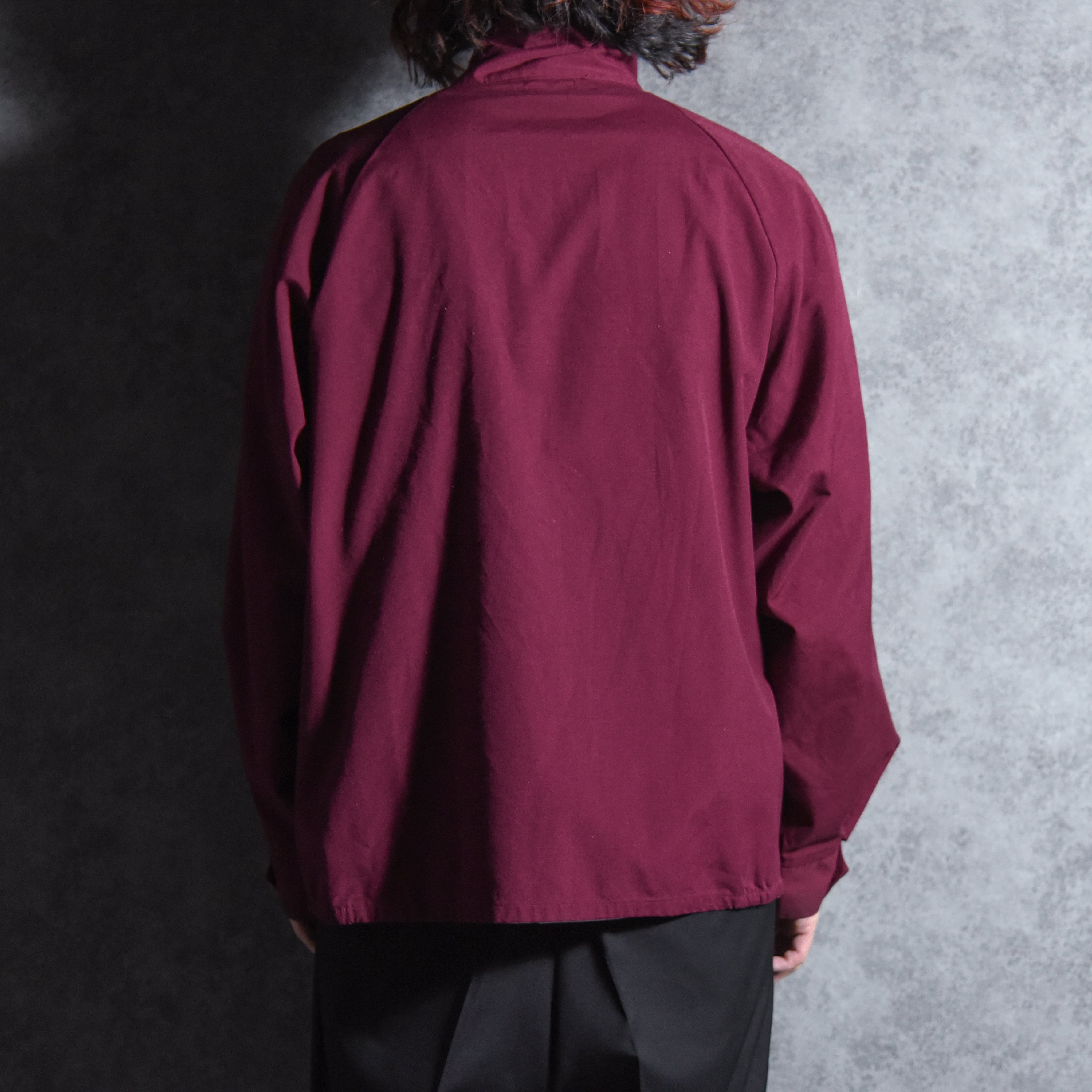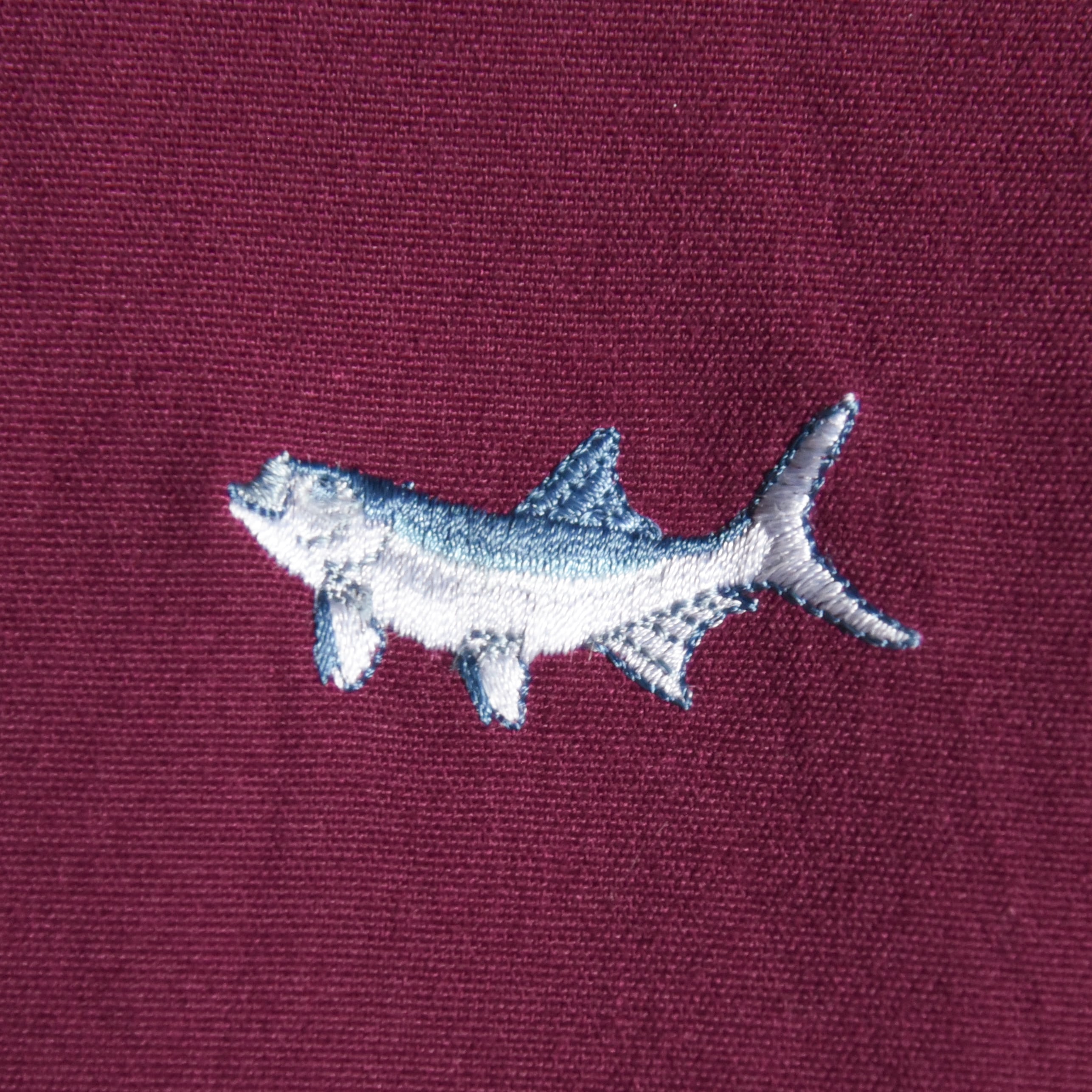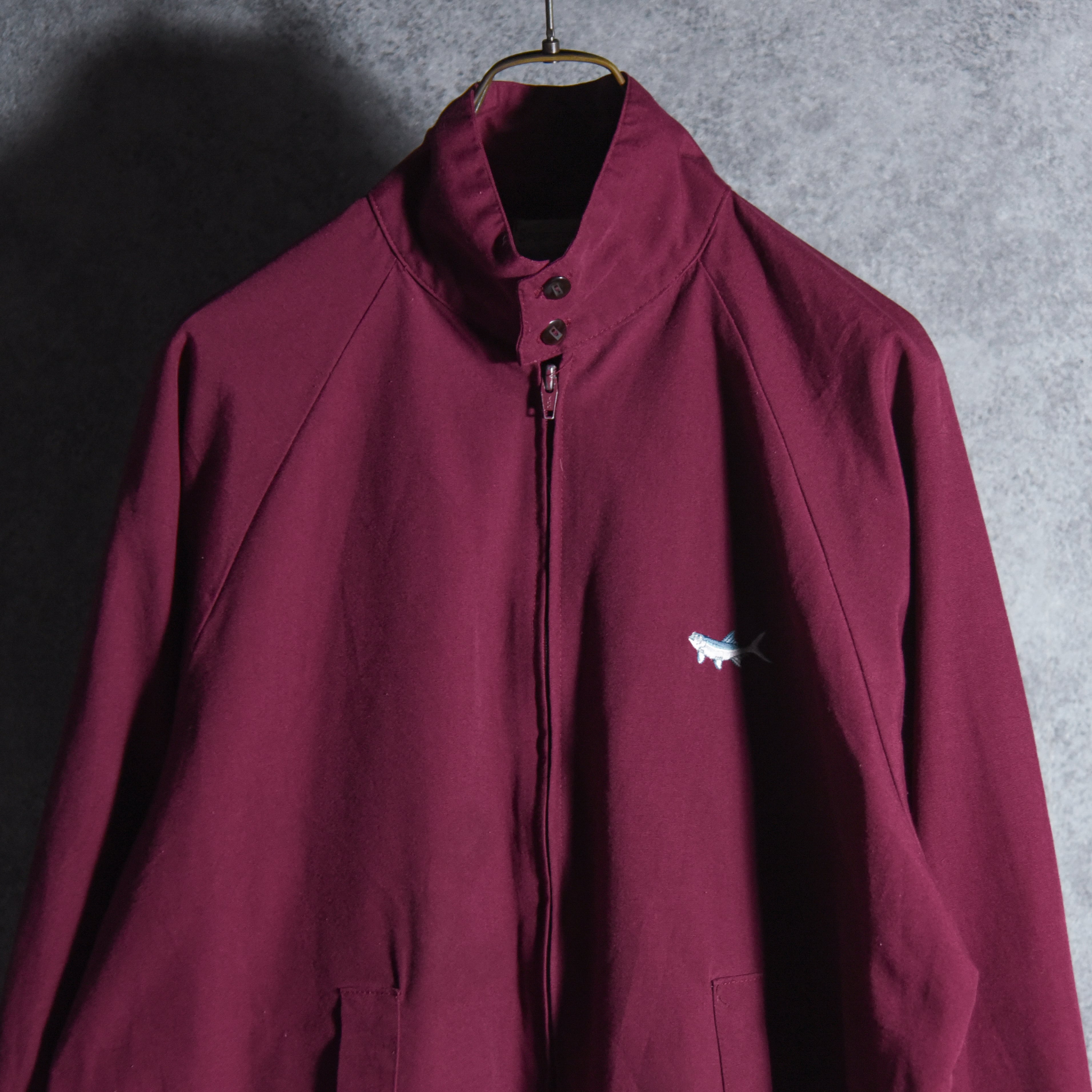 ボルドーの落ち着いたカラーと左胸の魚の刺繍がアイコニックな一着。