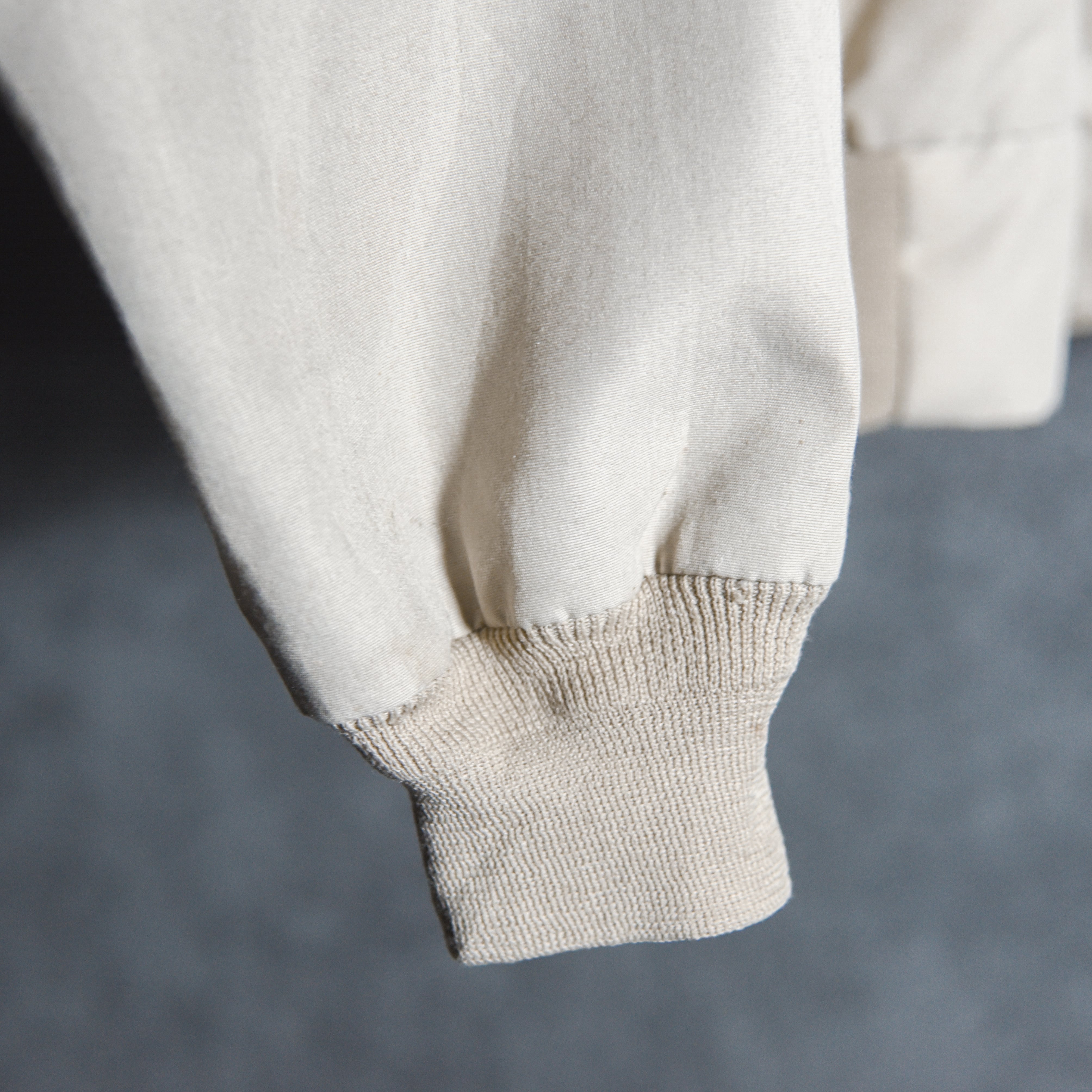 カラーはアイボリー系のベージュでモデルの体型で程よくゆとりのある良いサイズ感で袖と裾はリブ仕様。