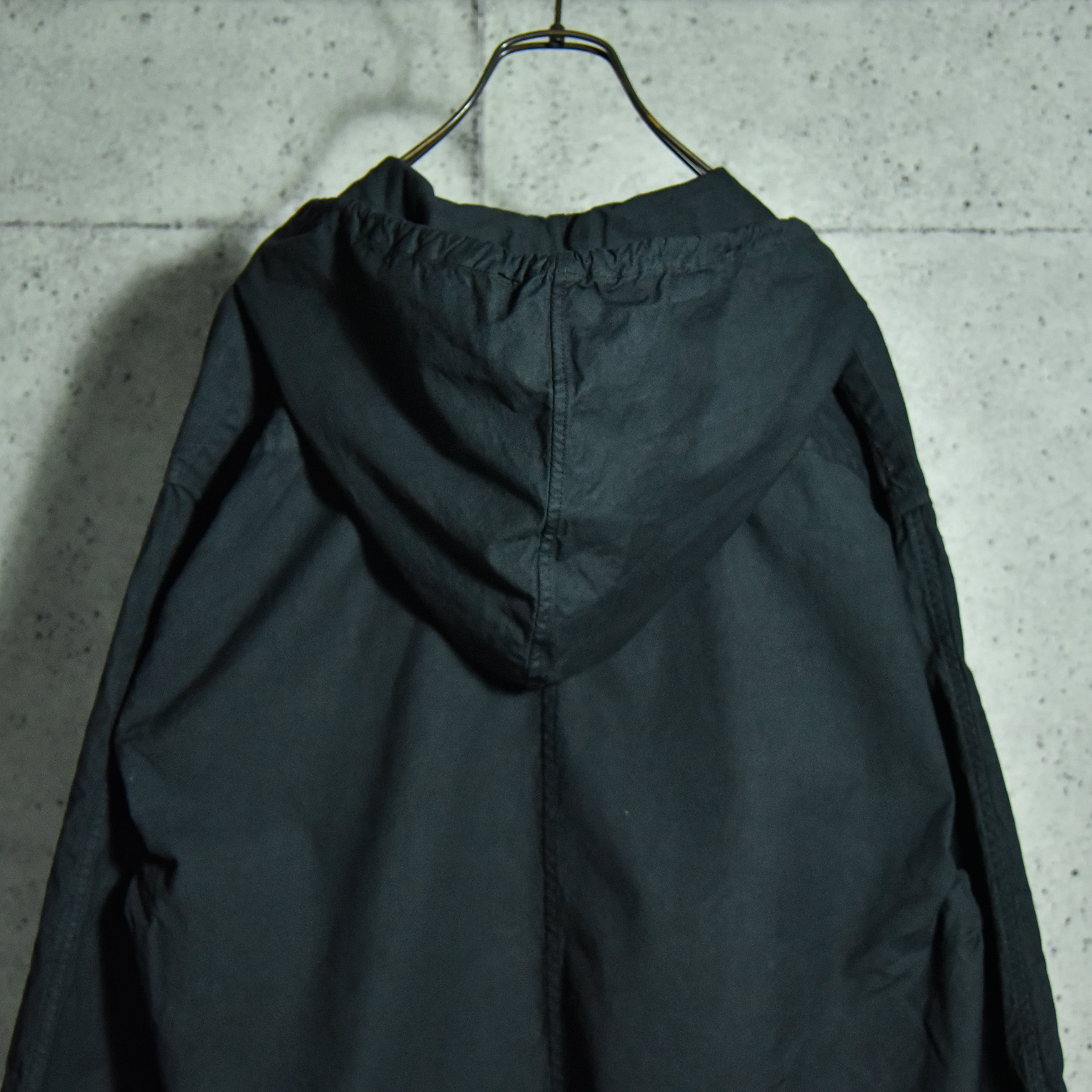 紐留めのフロントに大きめのフードが特徴で、薄手の生地ですが、インナー次第でオールシーズン活躍する便利な一着です。