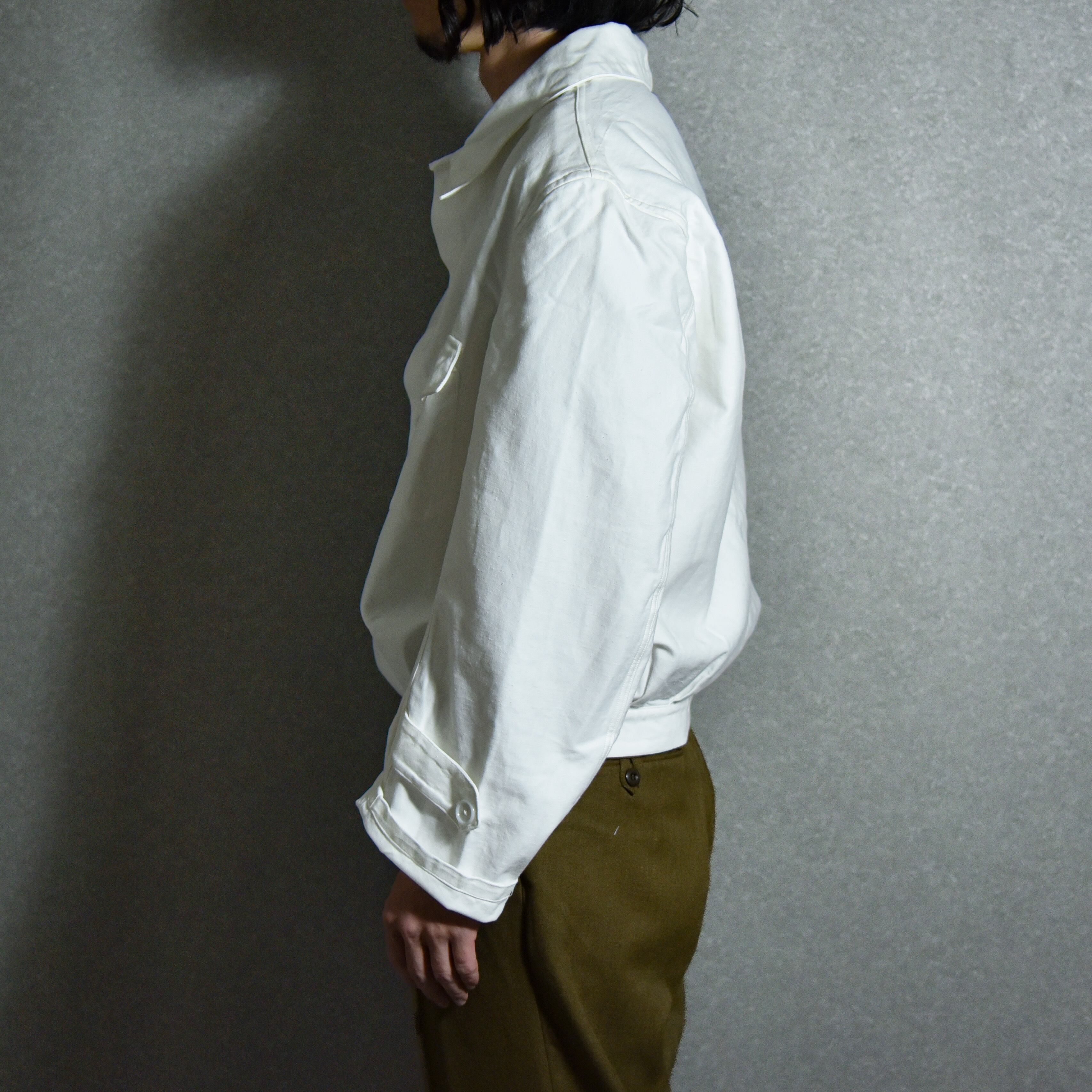 デザインはセカンドタイプのGジャンの様なダブルパッチポケットですが、裾のタブ状の持ち出しや袖口のやや高めの位置に付いたアジャストストラップ、腰回りのタックなど、ワークとミリタリーの中間の様な絶妙なディテールが特徴です。