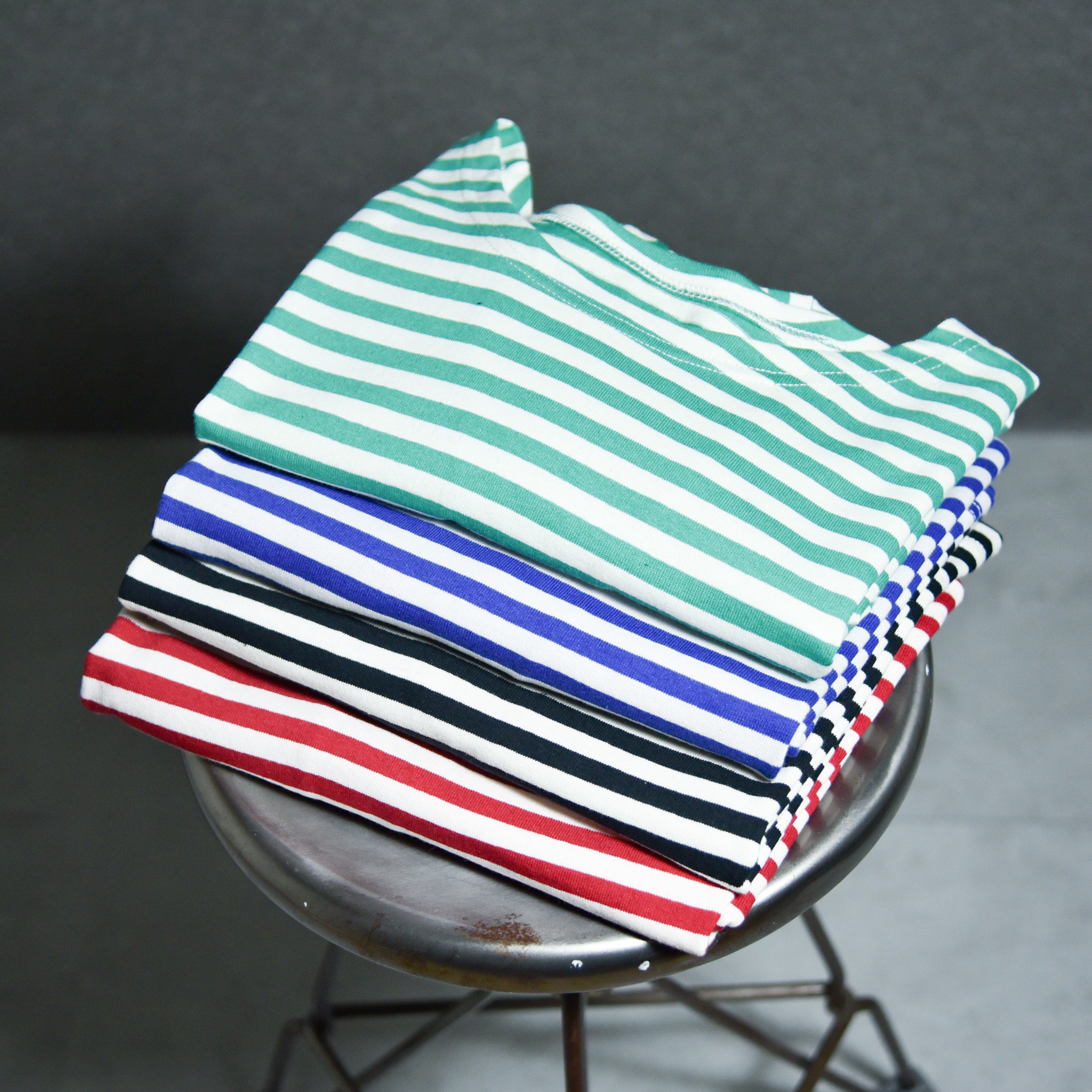 生地は肌触りが良く肉感もしっかりある中厚コットンで、一般的なTシャツとバスクシャツの中間のような手持ち感です。