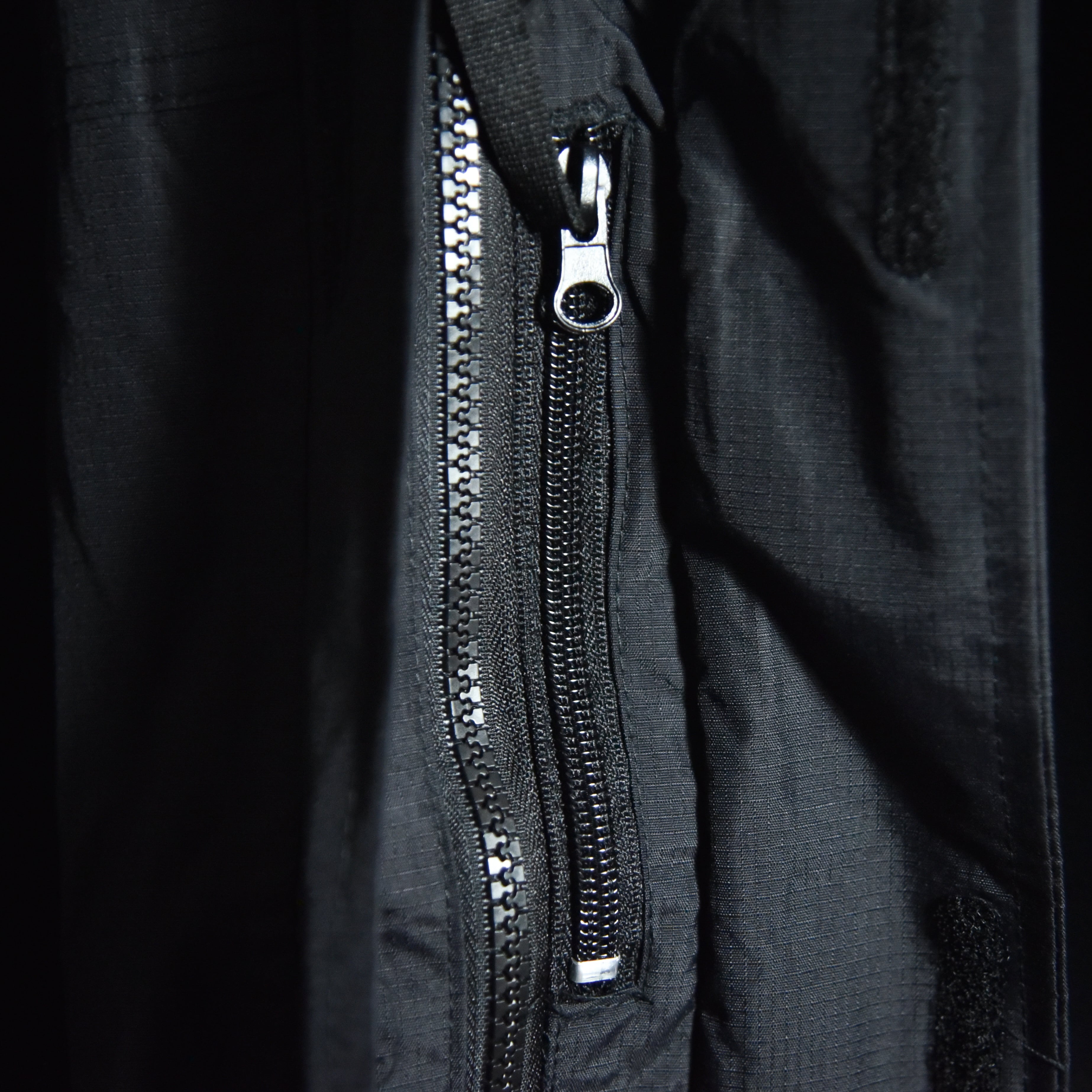 生地はナイロンリップストップで、軽くて強度が高いのはもちろんのこと、高い撥水性と浸透性があり、梅雨時期など雨の日にはレインウェアとしても活躍してくれます。