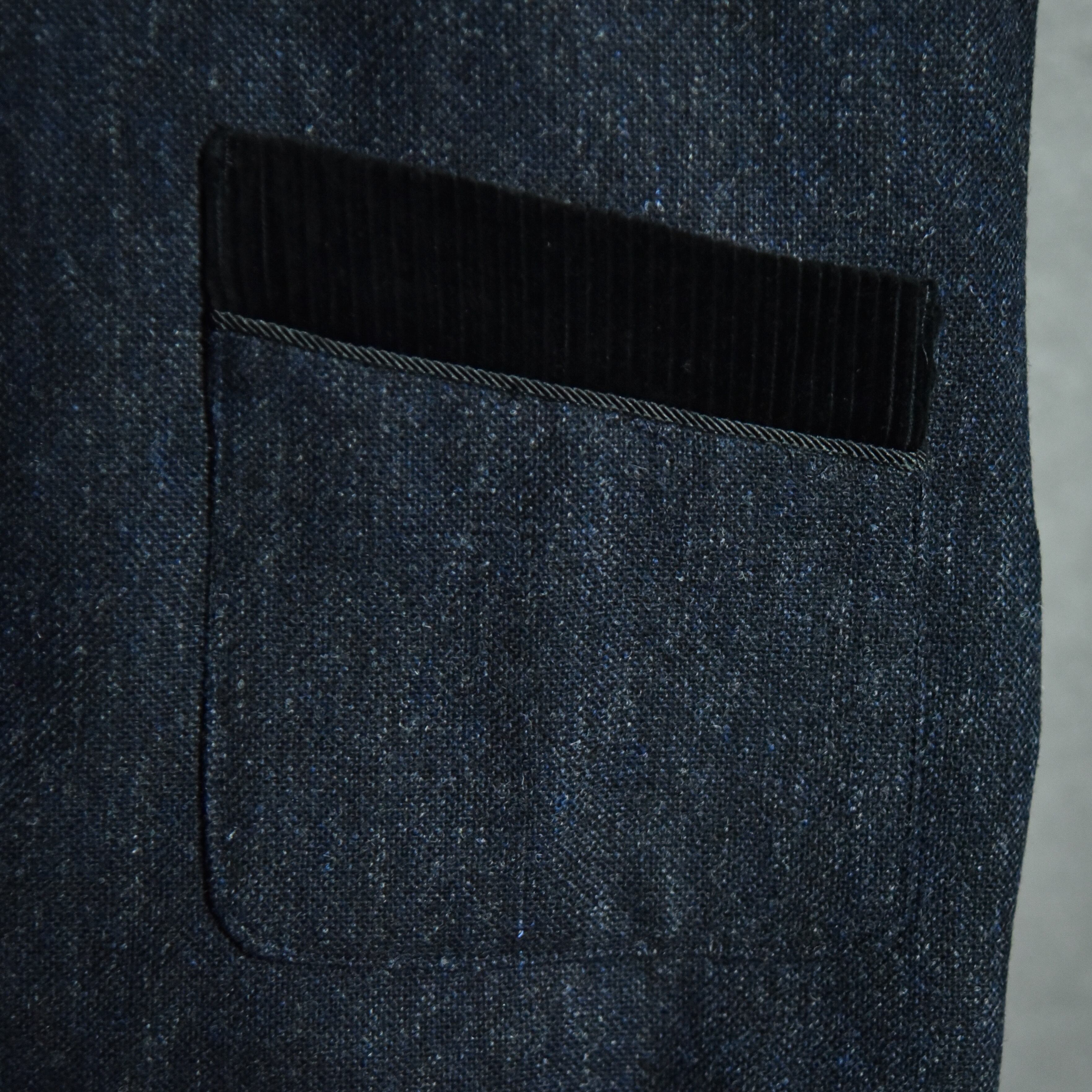 厚地のツィードに加え、ポケット口の異素材切り替えやコードパイピング、さらに総裏の仕立てなど、難しい縫製箇所の多いアイテムですが、古くから続く専業工場ならではの繊細な仕事が光る非常に丁寧な作りが特徴です。