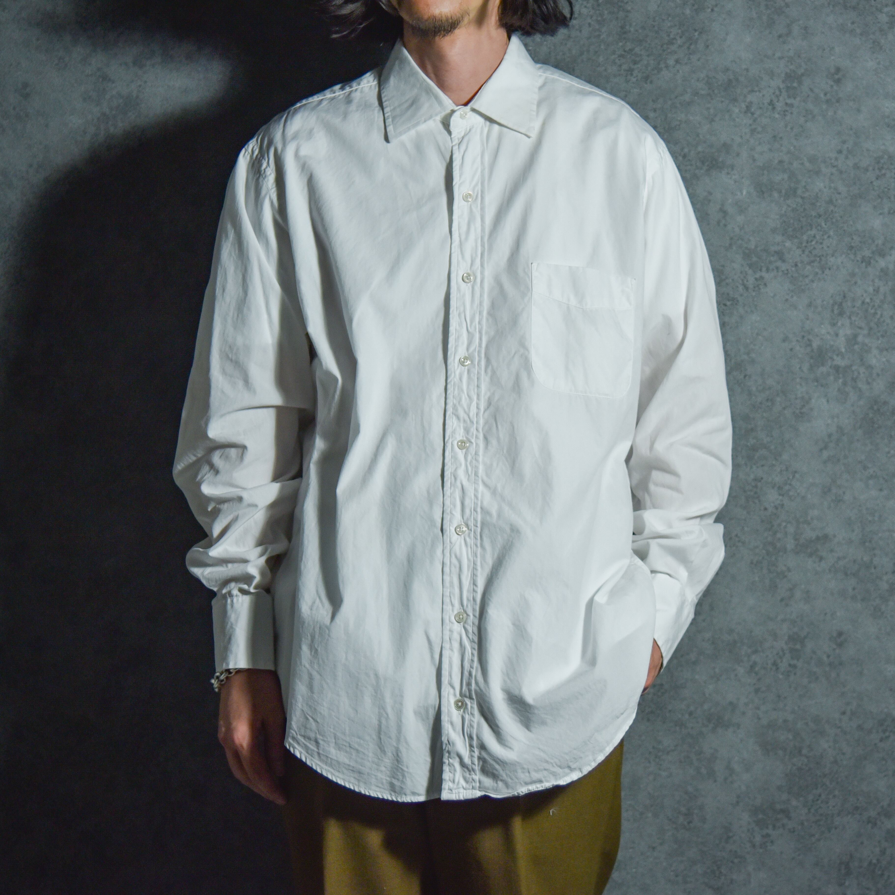 分類するとドレスシャツではあるものの、胸ポケットと前立ての付いた絶妙にカジュアル要素のある仕様のためオンオフどちらでも使え、ラフなイメージのあるアメリカ製ながら非常に丁寧な縫製、高瀬貝のボタンが配されているところなどは、流石バーバリーというこだわりが感じられる名品です。