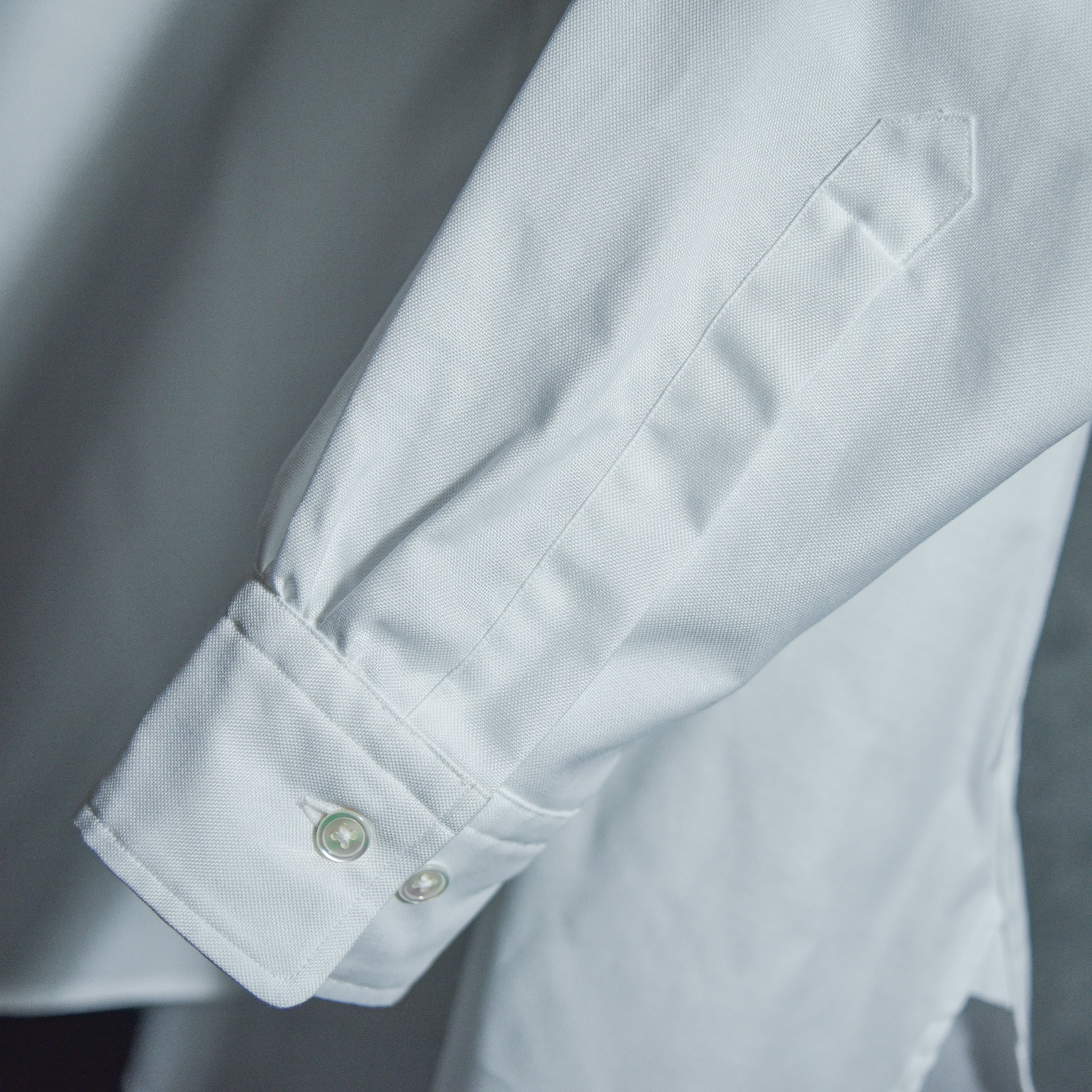 織りはトラッドの定番オックスフォードですが、通常とは異なる非常に細い番手の糸で織り上げた所謂ロイヤルオックスフォードのため、粗野な風合いではなく、ドライな質感は持ちつつもしなやかで上質な素材です。